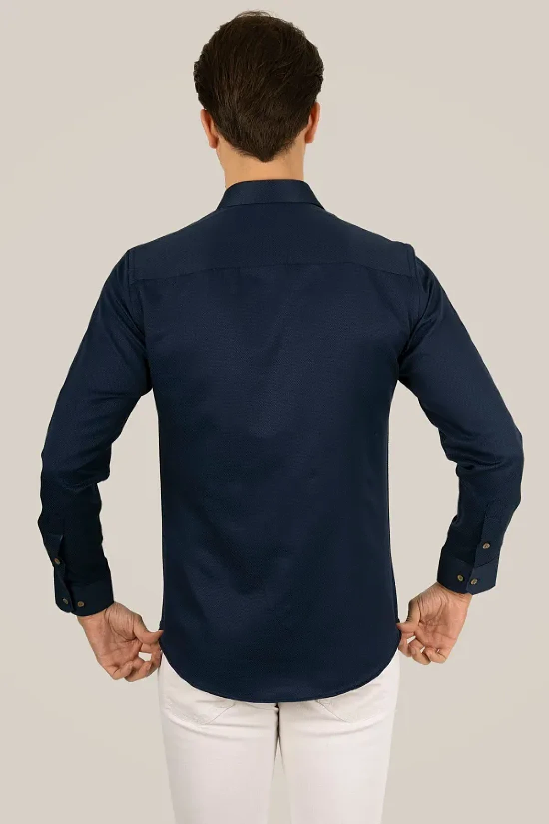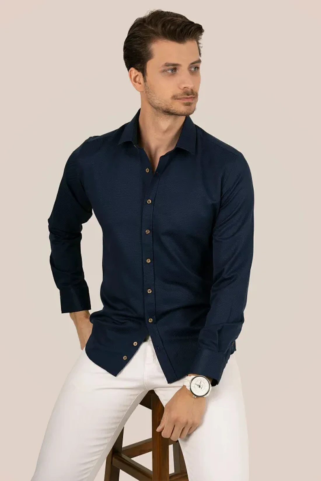Etikmen قميص رجالي - أزرق داكن، Slimfit، أزرار بنية، صندوق هدايا