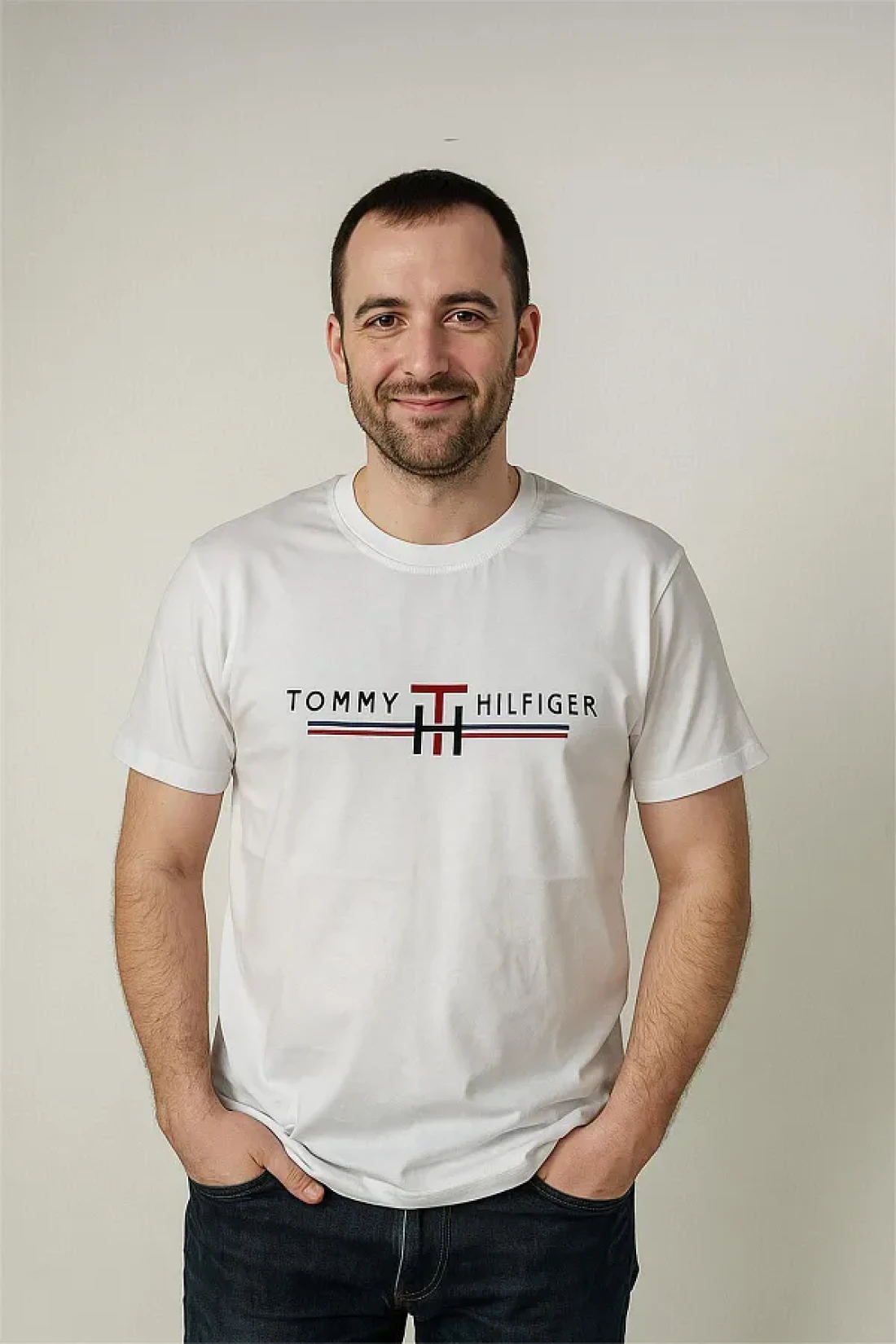 Tomy تيشيرت مطرز برقبة دائرية باللون الأبيض تومي