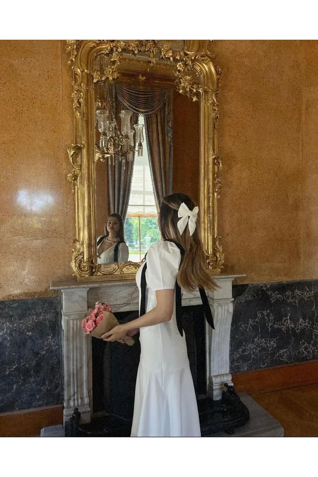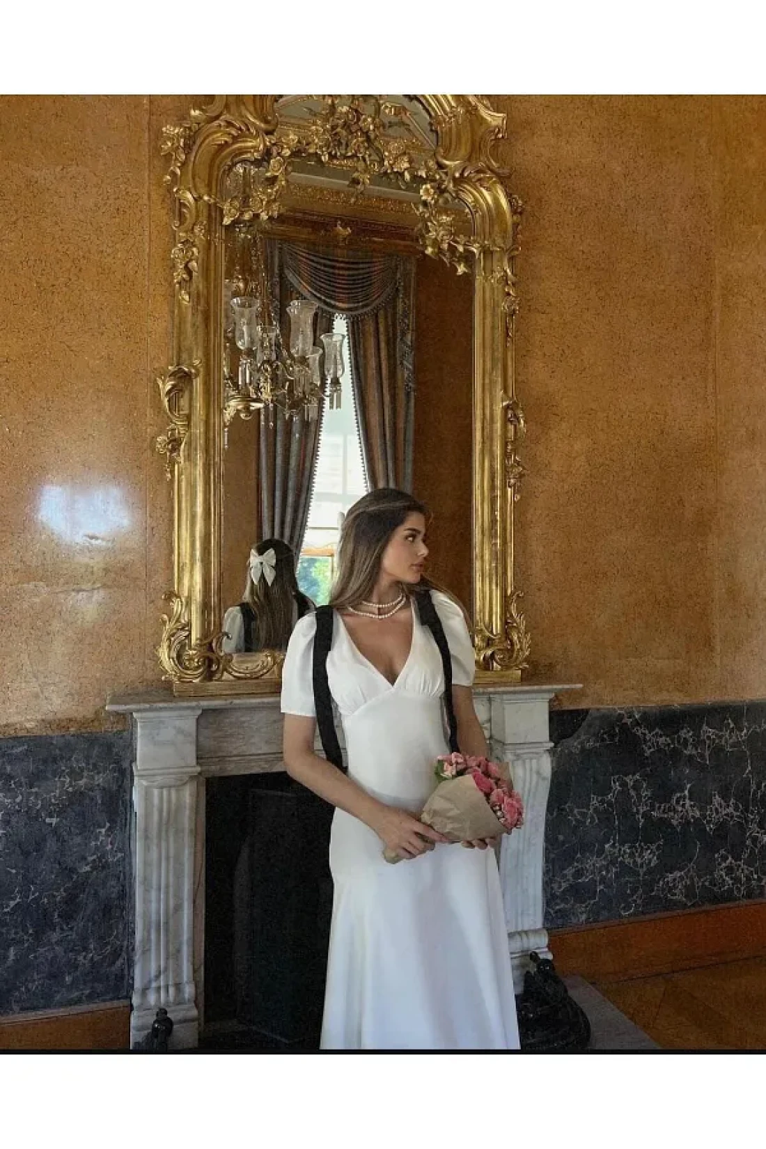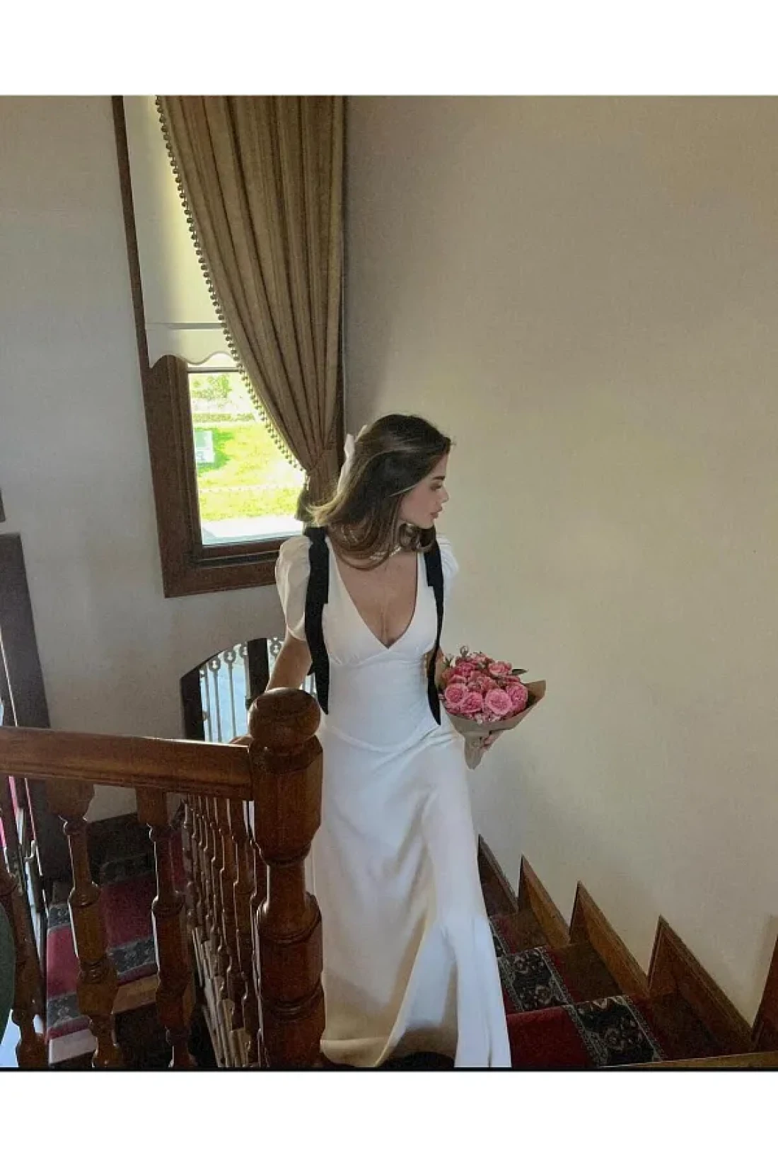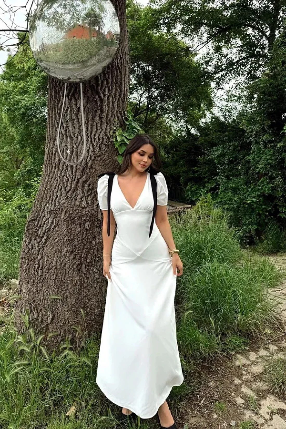 FMN Moda تنورة بأكمام واسعة ورقبة على شكل حرف V - مع تفاصيل فيونكة وخياطة