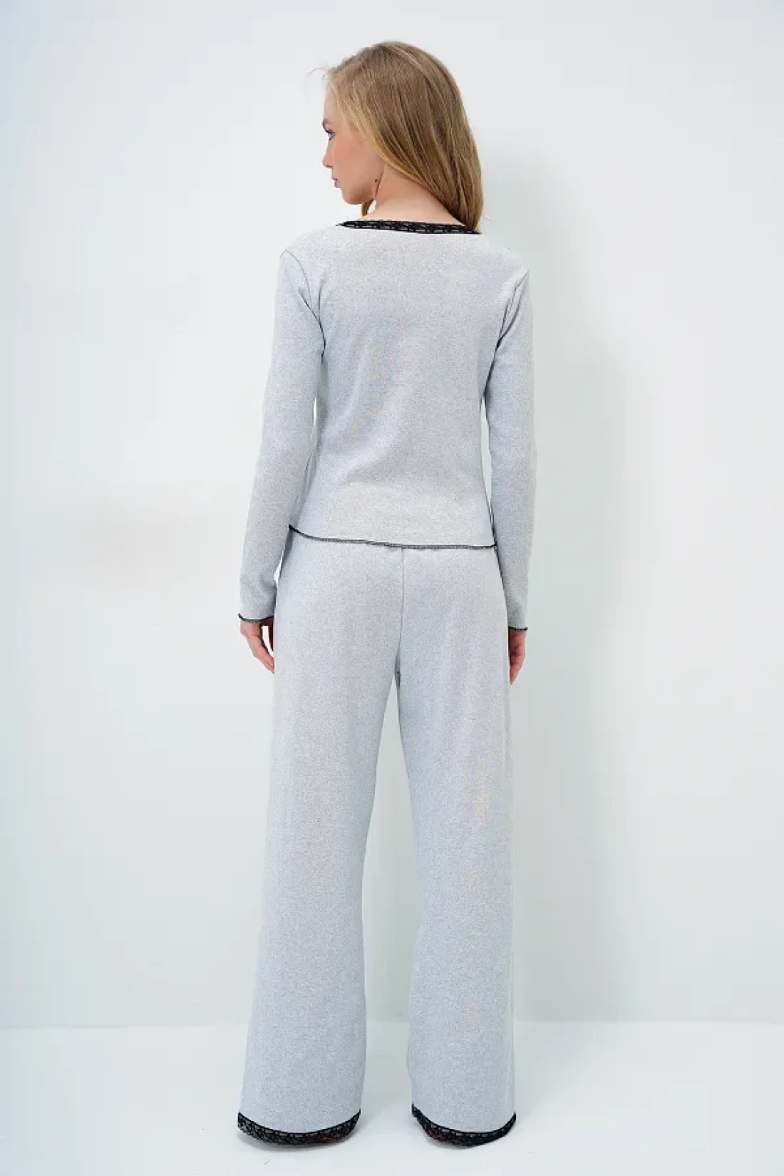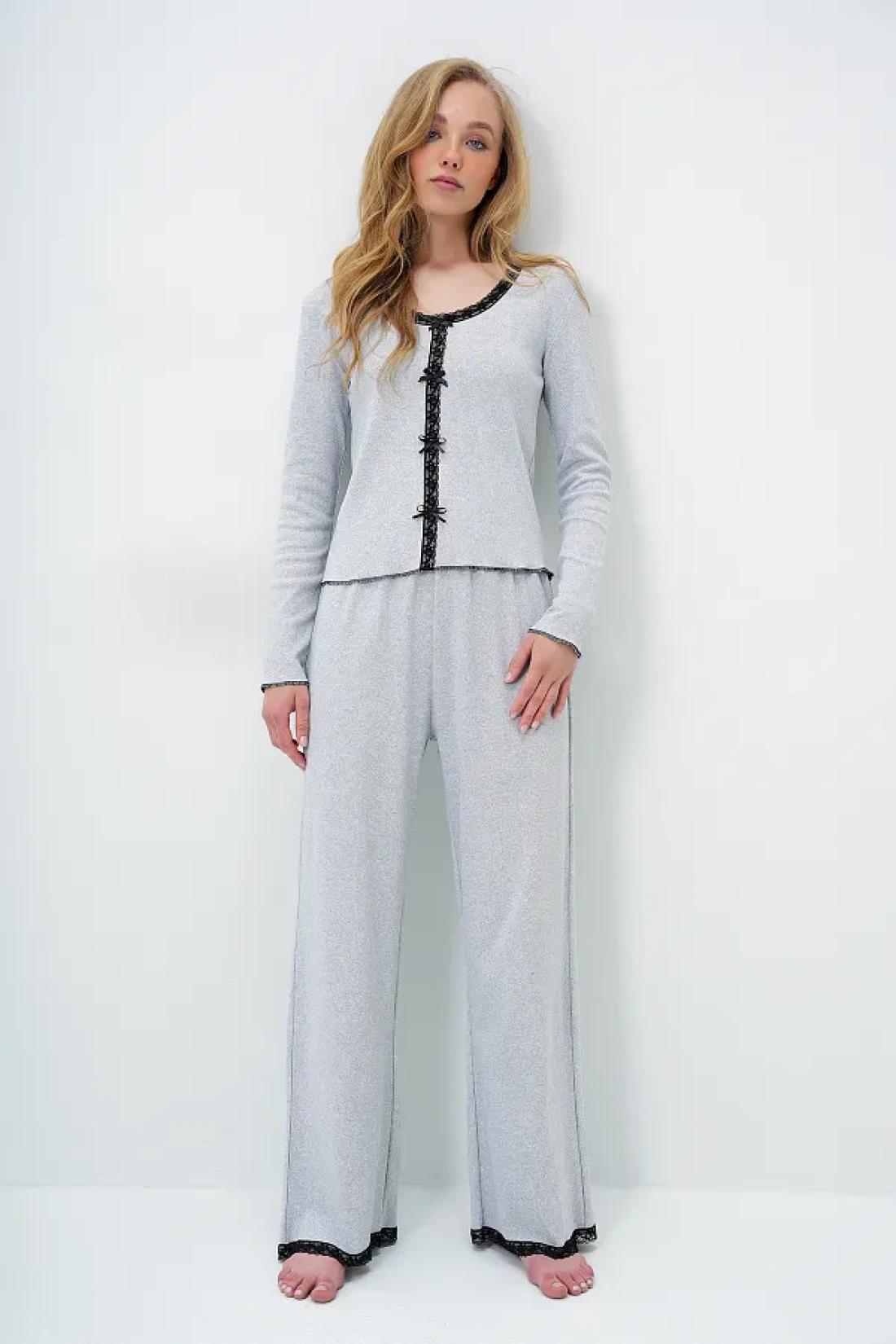 Trend Alaçatı Stili Grimelange بلوزة مطرزة بياقة واسعة ومزينة بفيونكة وسروال بالازو بدلة بيجامة ALC-X14066