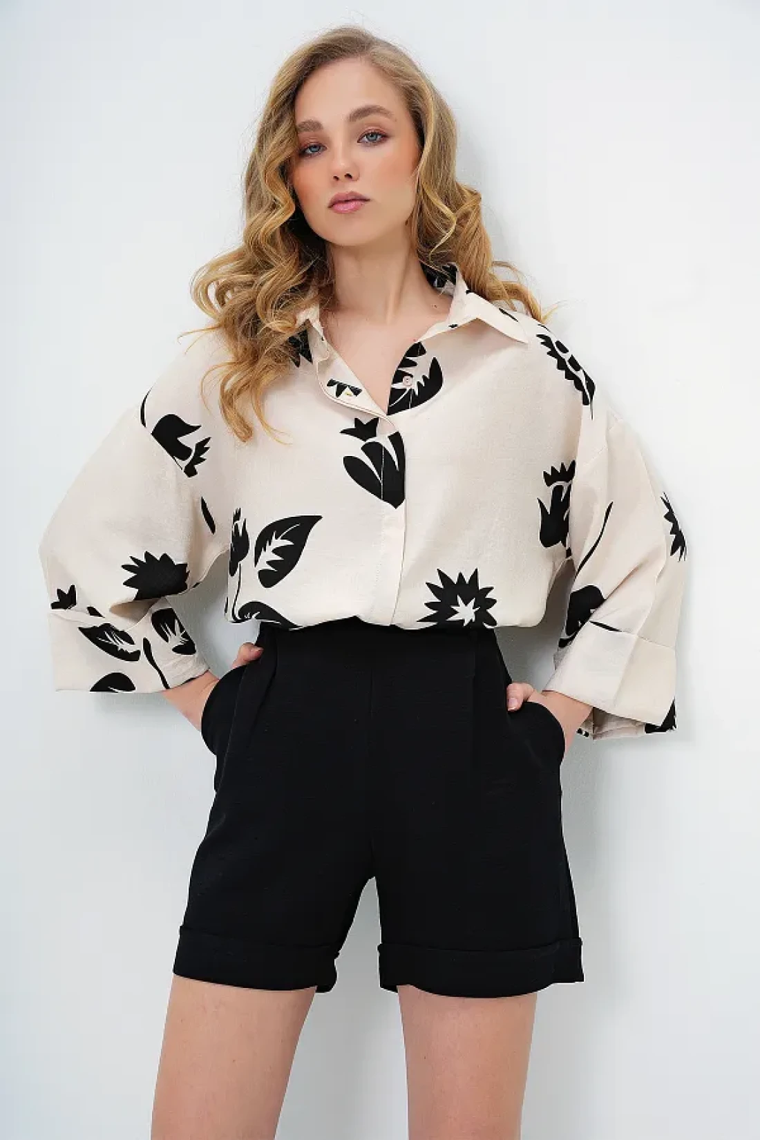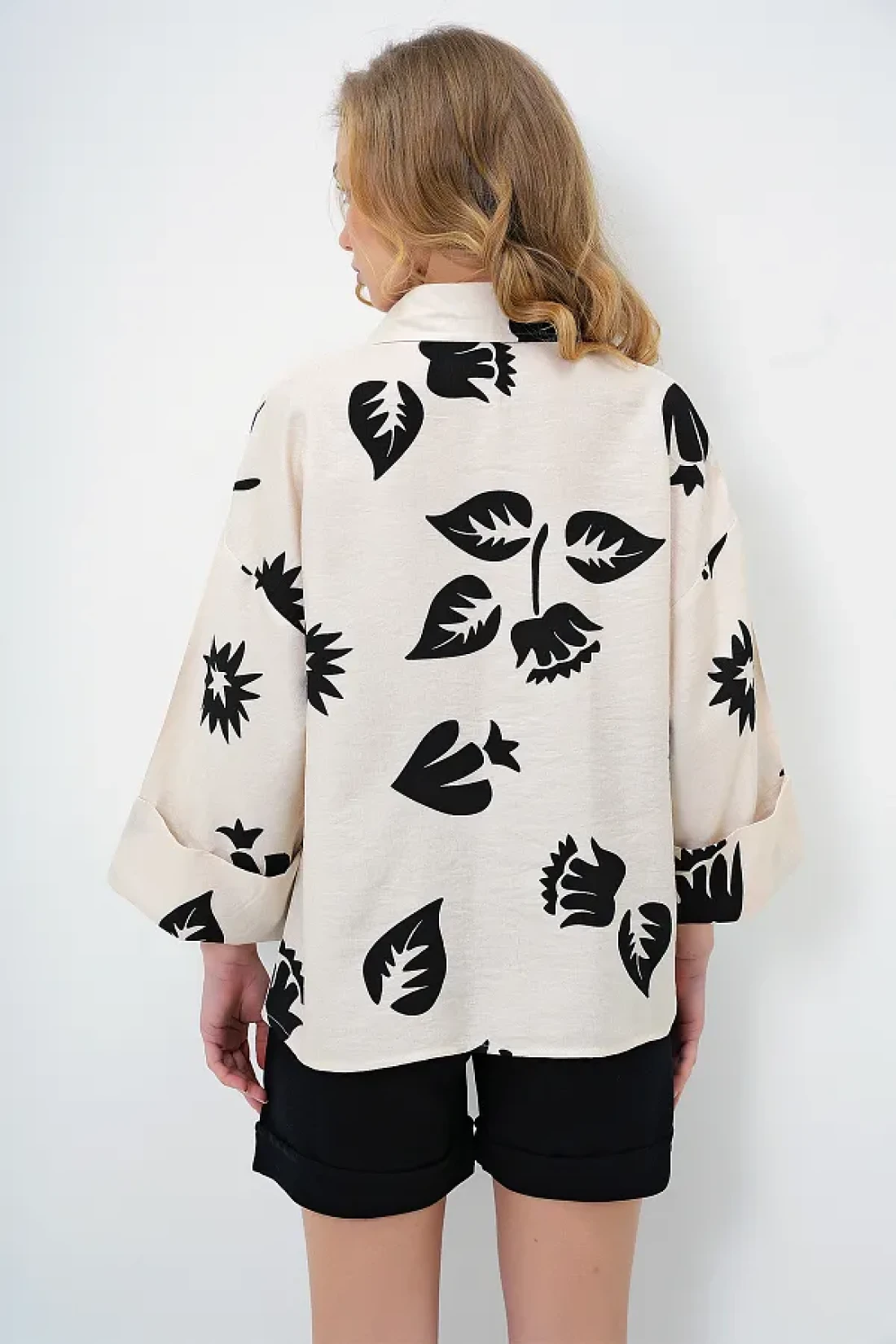 Trend Alaçatı Stili قميص نسائي منسوج بنمط أوراق الشجر باللون الأسود والبيج ALC-X13785