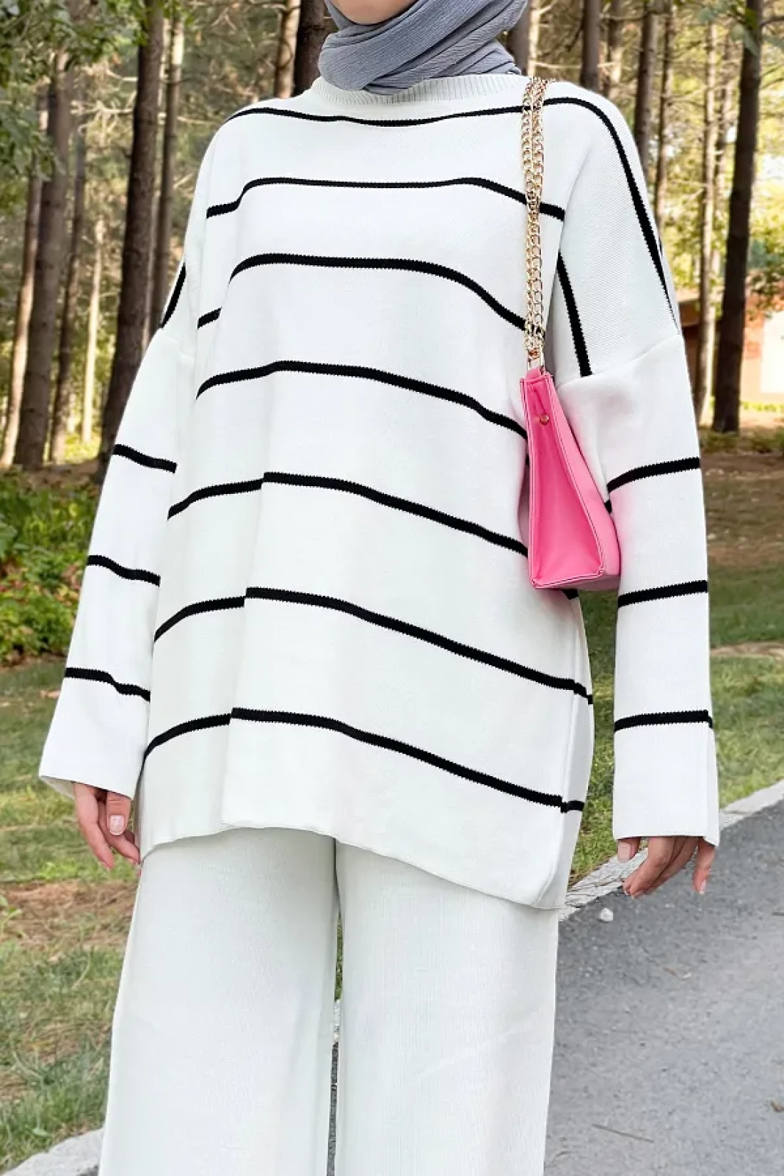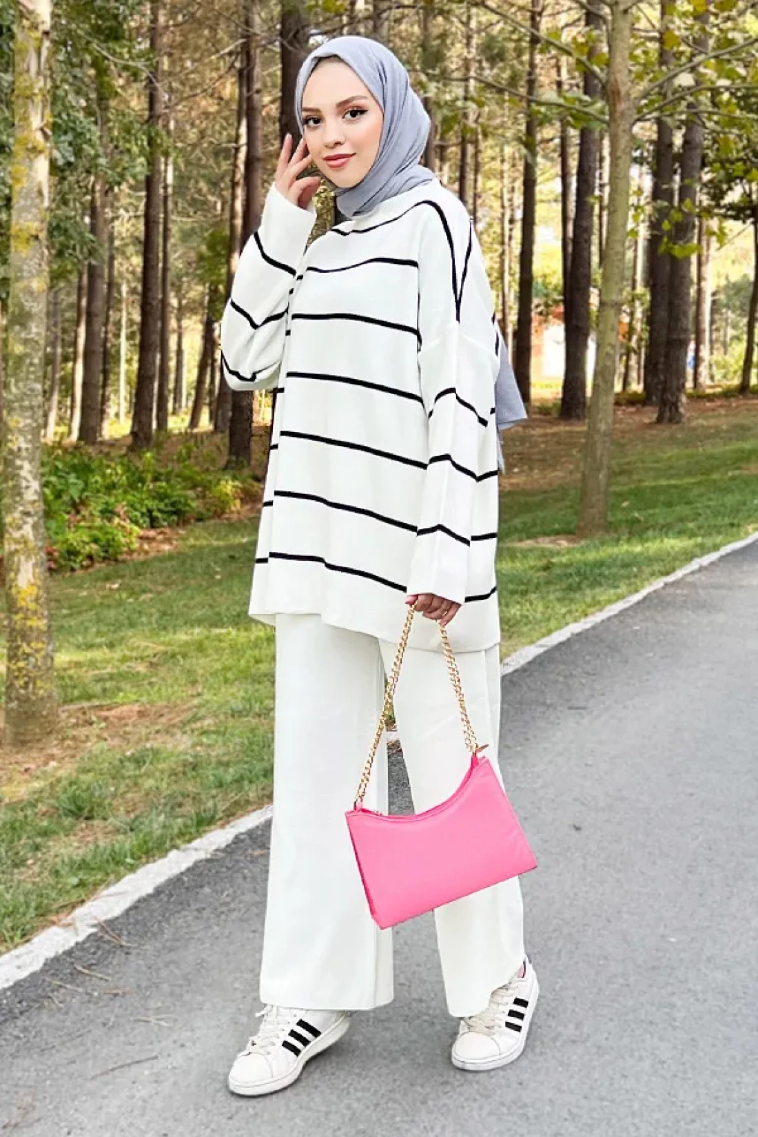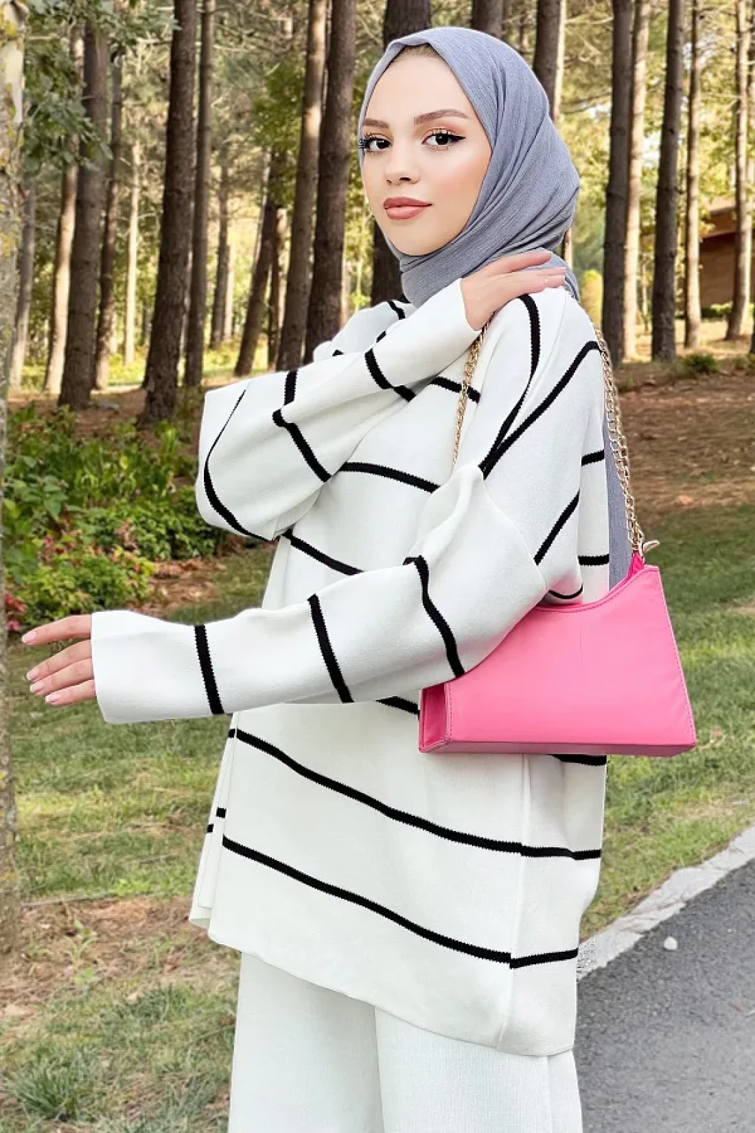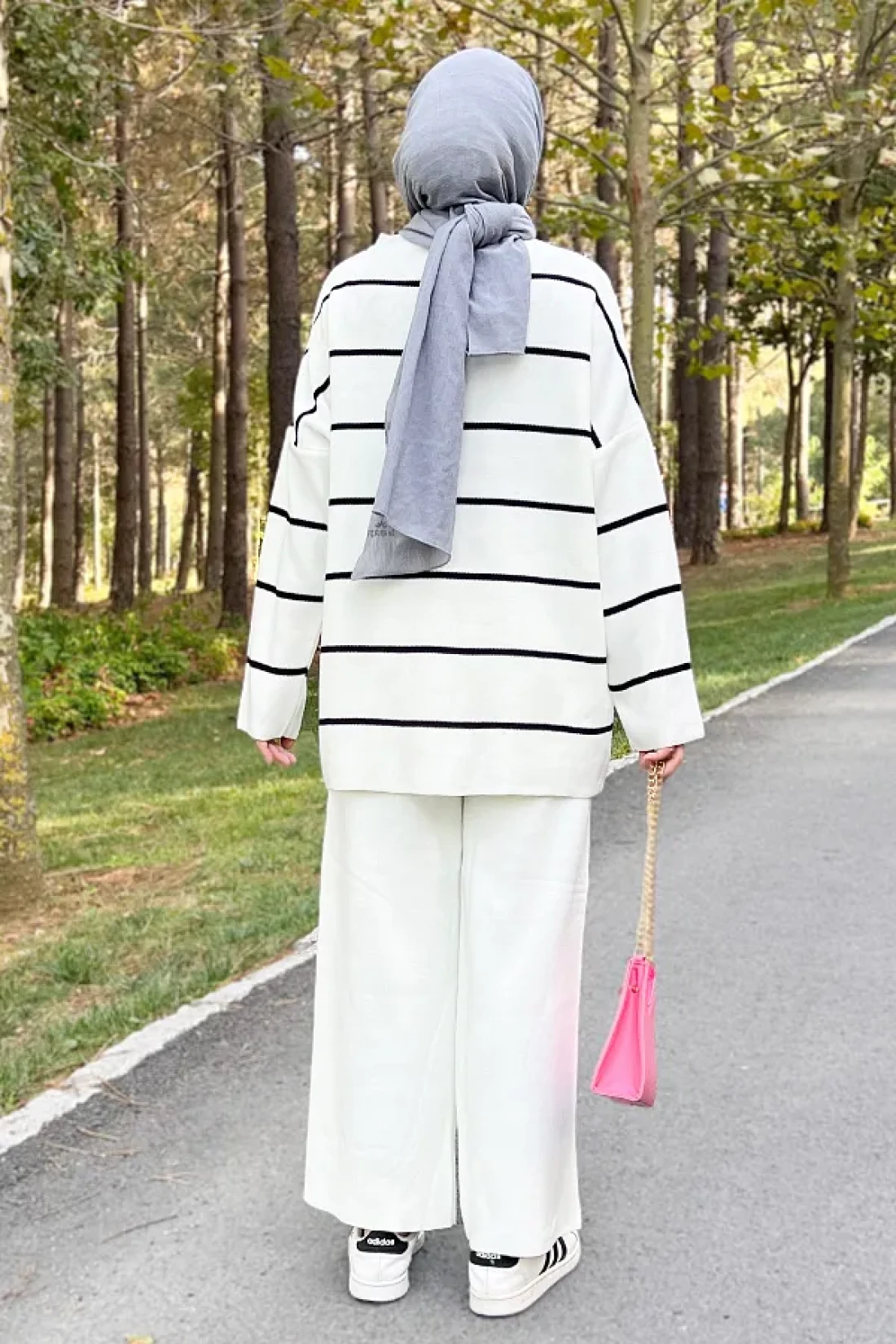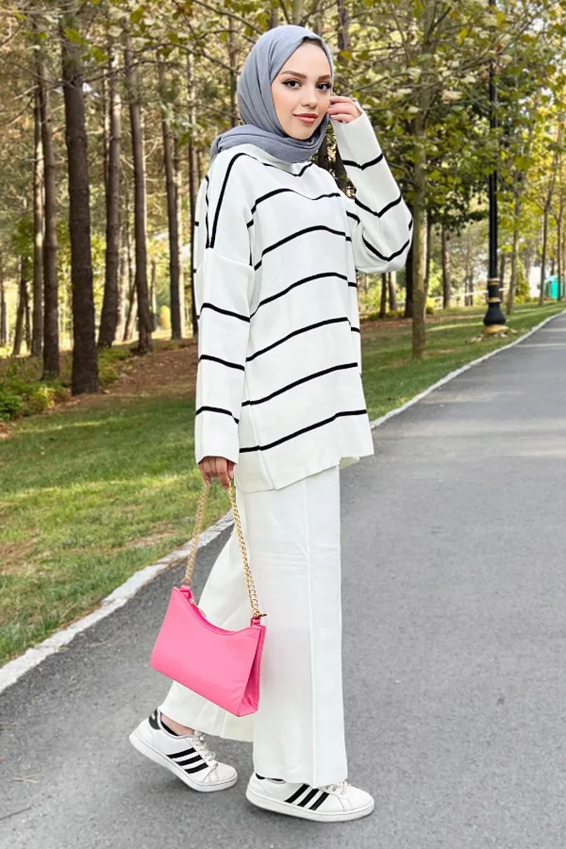 Tesettür Dünyası بدلة تريكو مخططة Tsd220905 أبيض