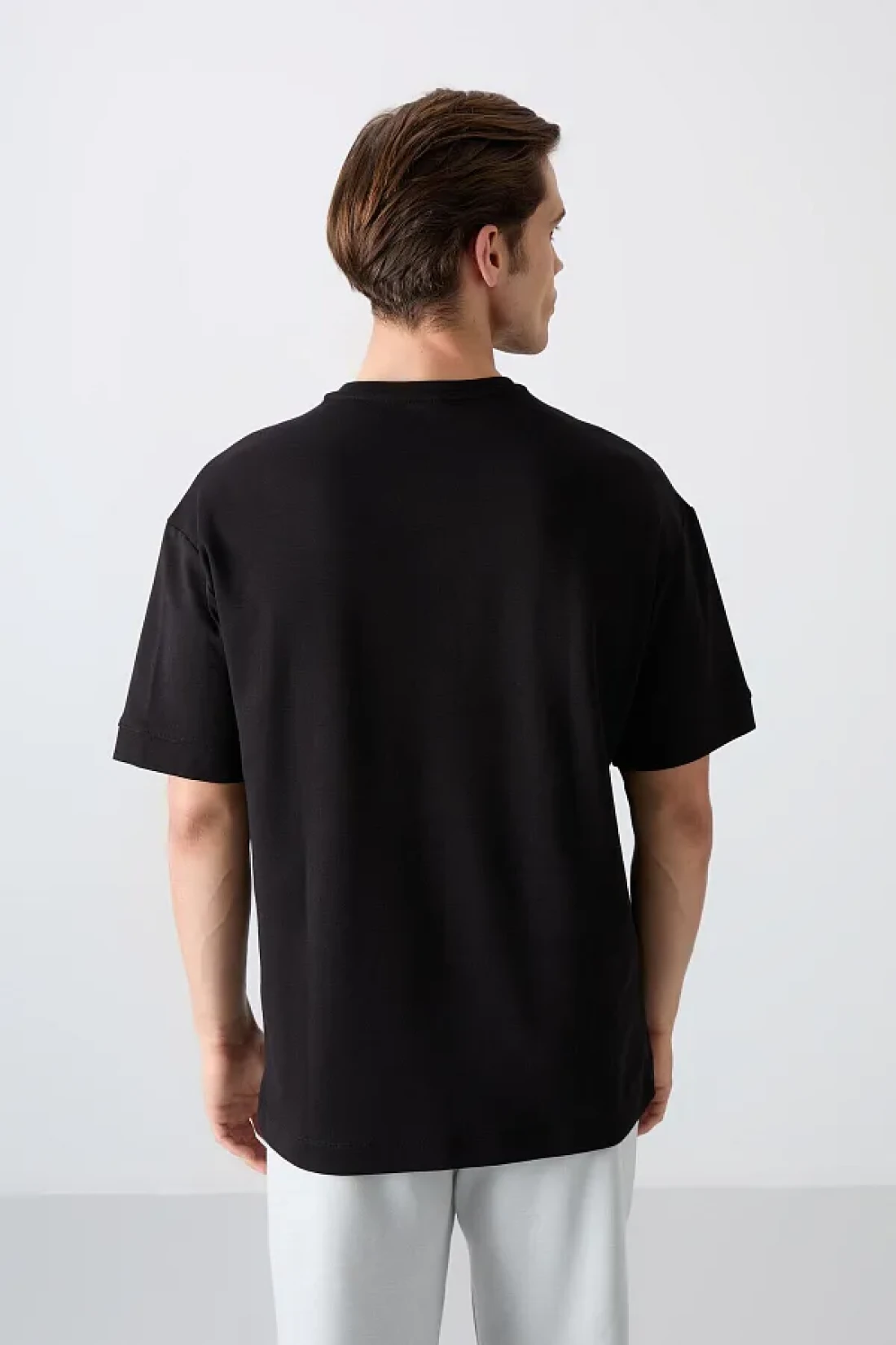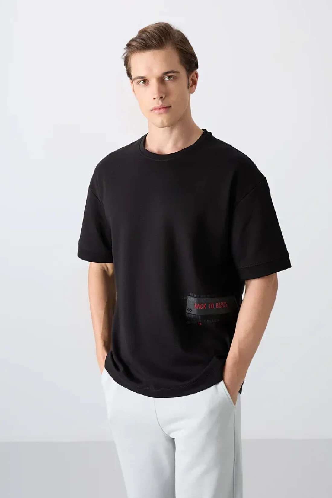 Tommy Life تي شيرت رجالي من القطن الأسود السميك الناعم المطبوع مقاس كبير - 88322