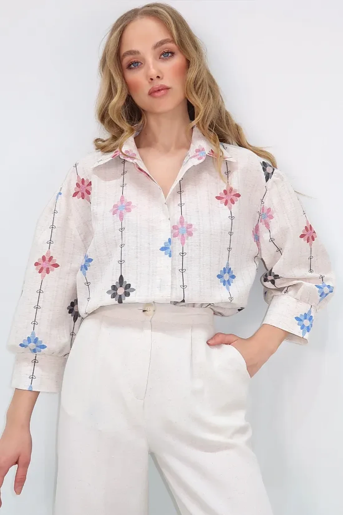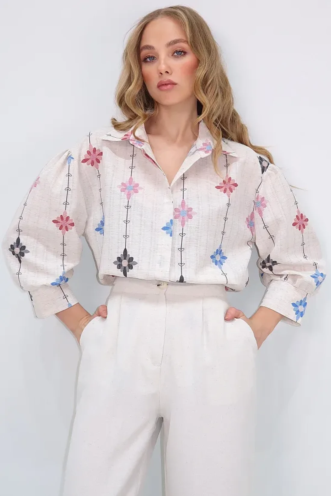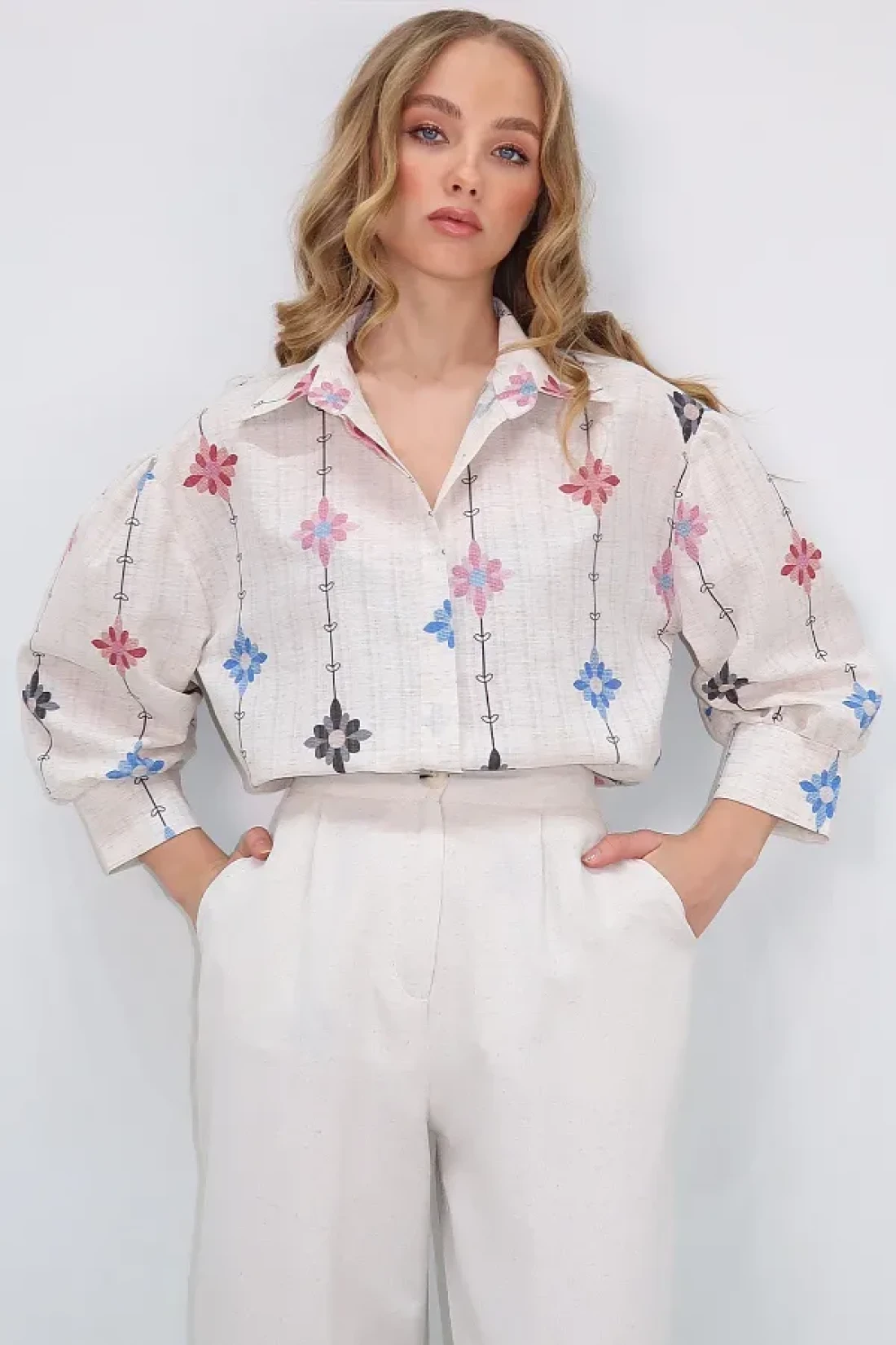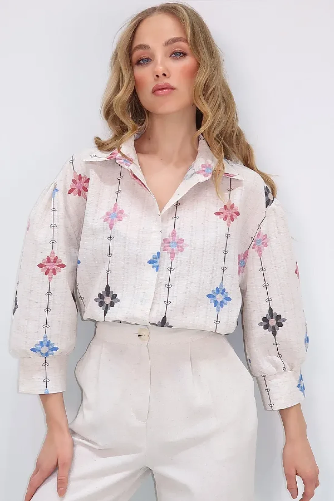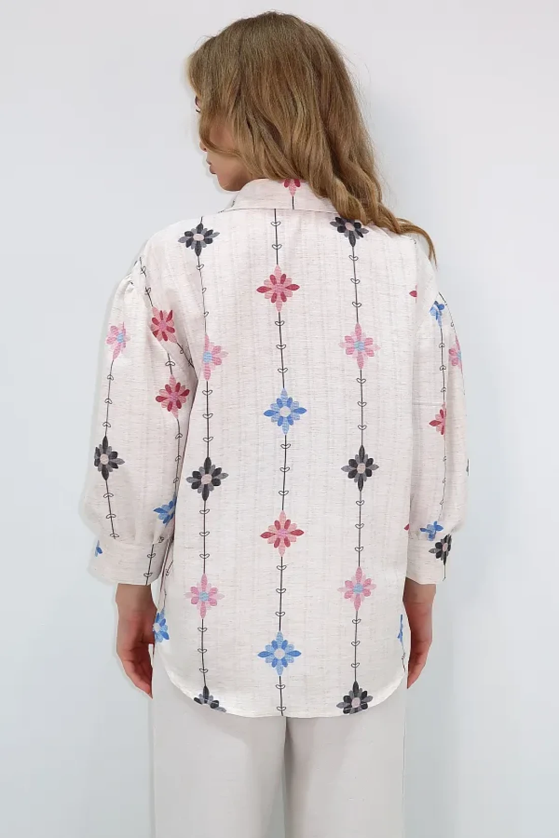Trend Alaçatı Stili قميص نسائي منسوج من الكتان بطبعة زهور باللون البيج والأرجواني ALC-X10398