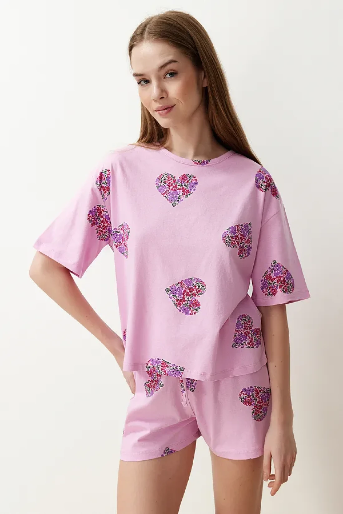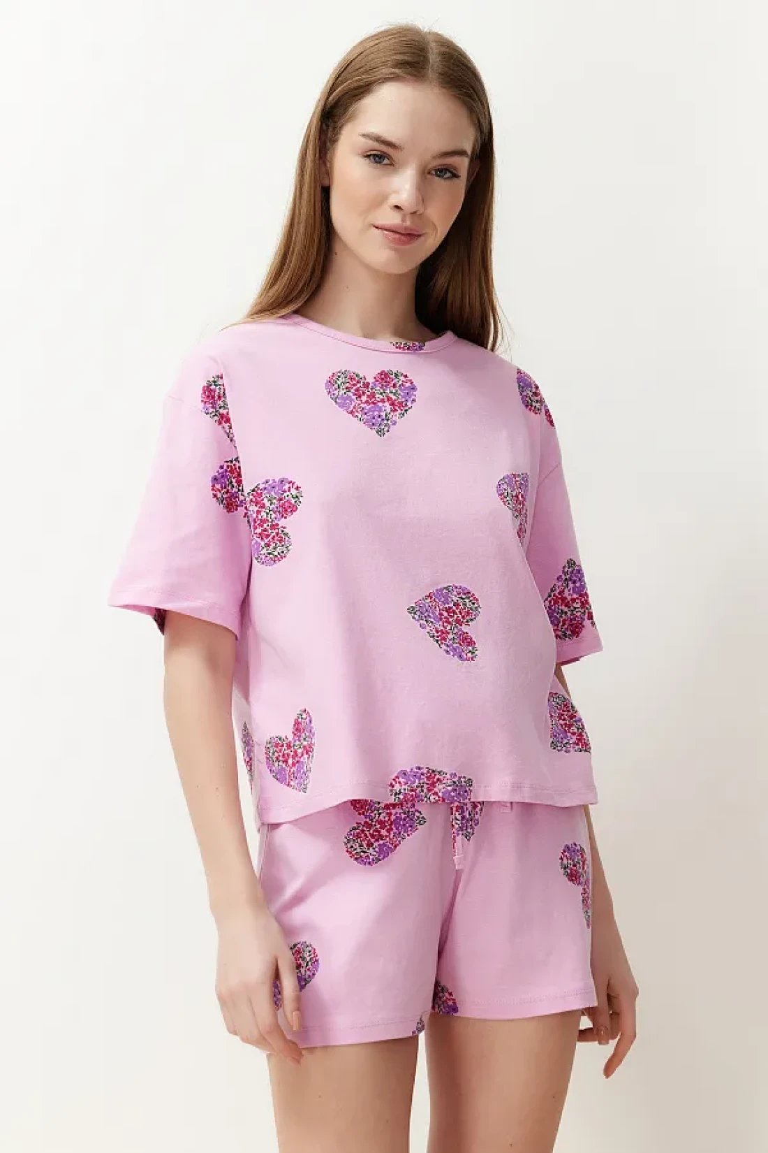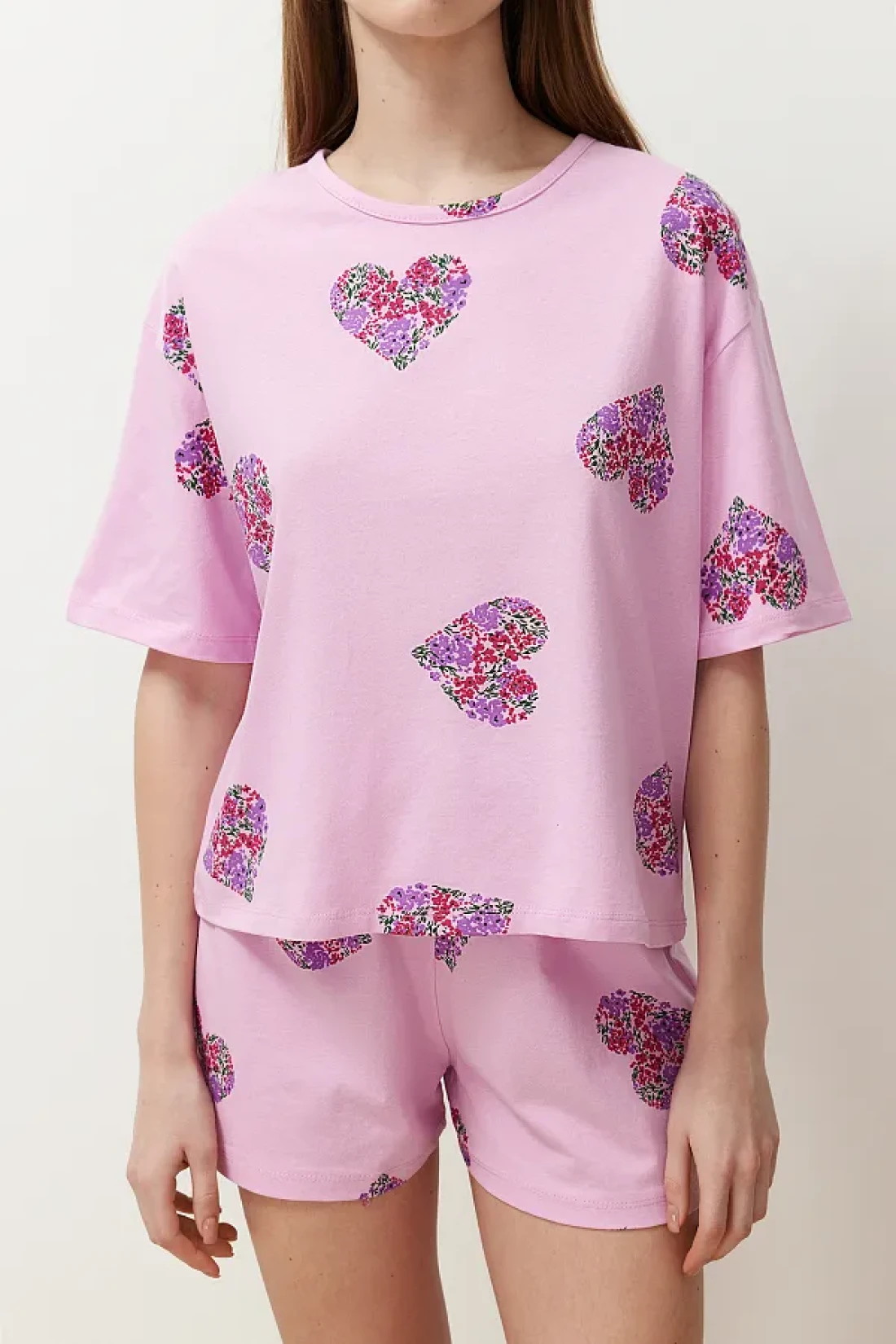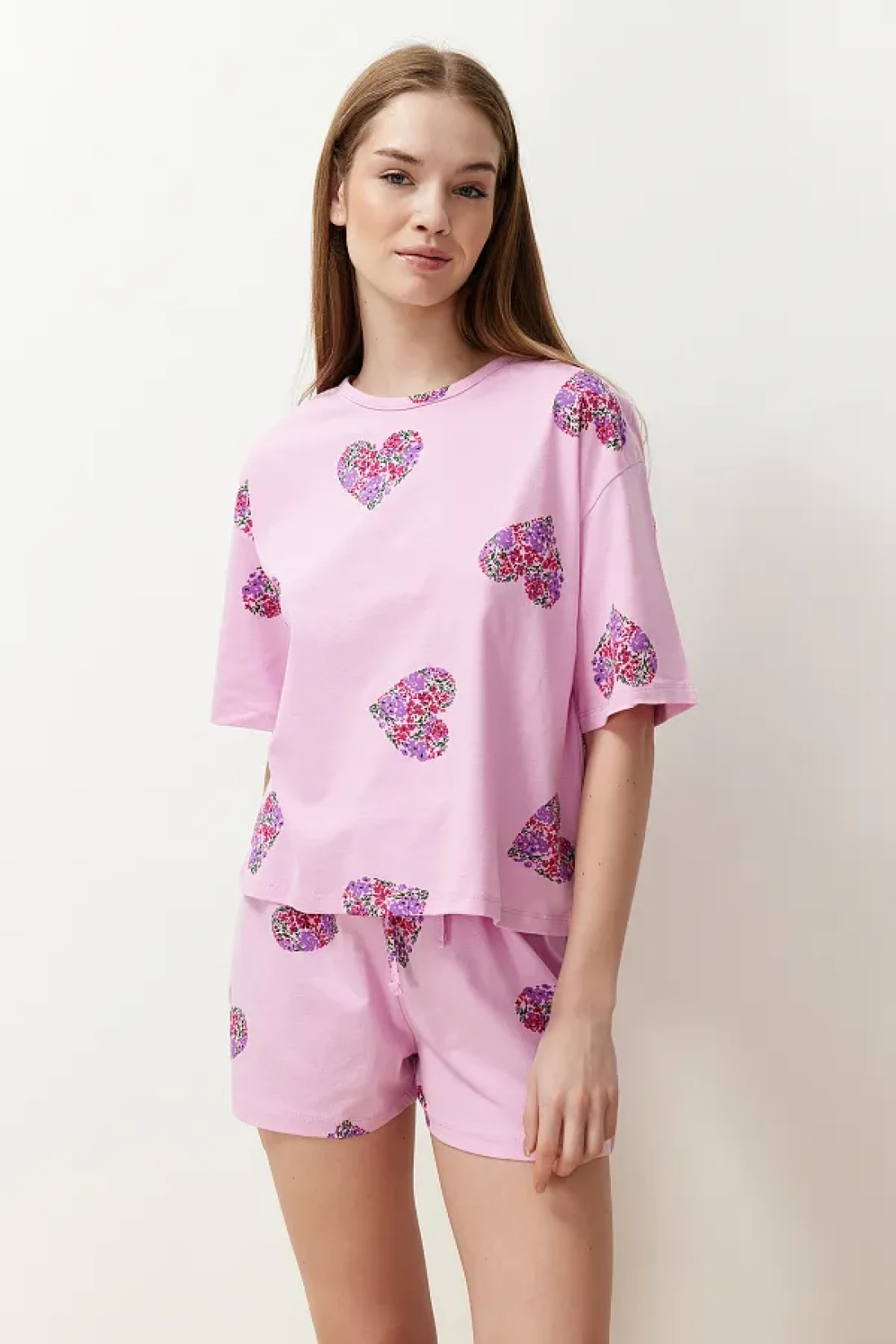 Collection طقم بيجامة قطن على شكل قلب وردي اللون مع شورت - THMSS24PT00225