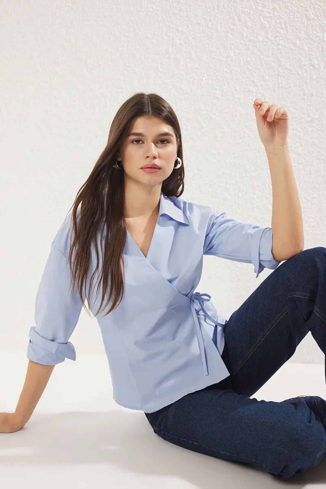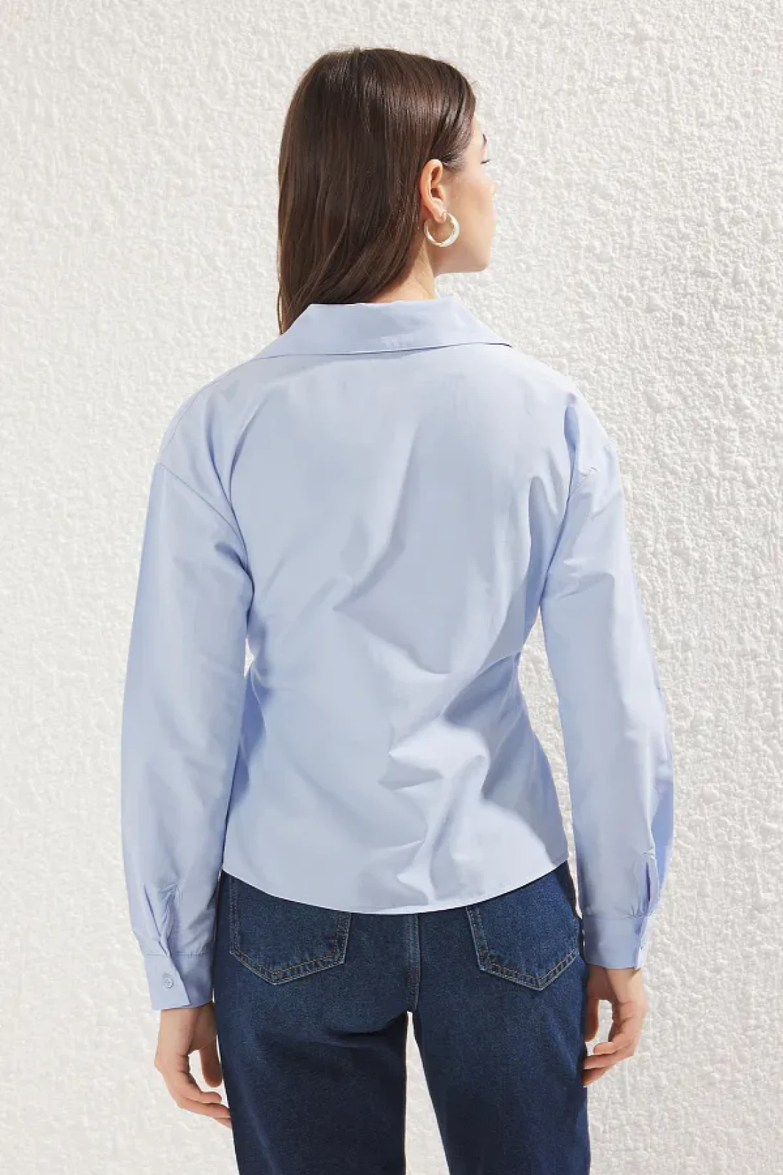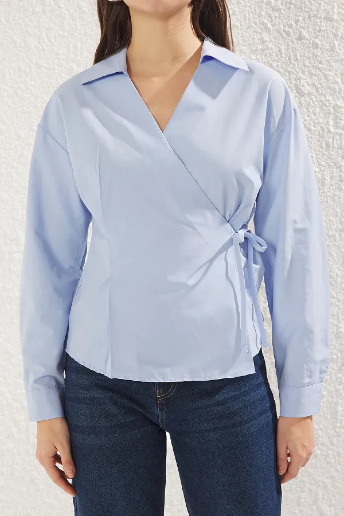 Collection قميص أزرق مزدوج الصدر مع تفاصيل ربطة عنق، قميص منسوج عادي TWOSS25GO00029