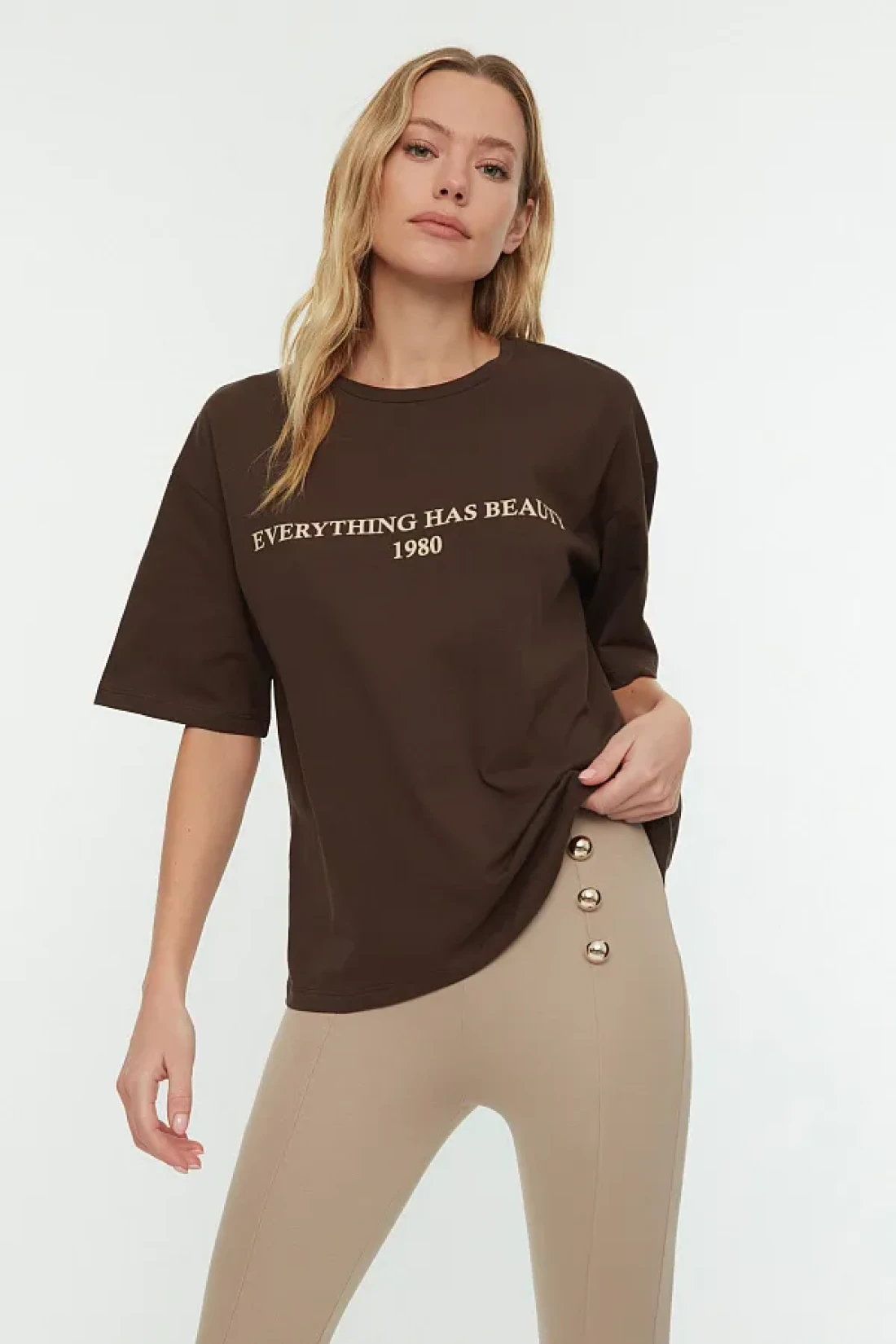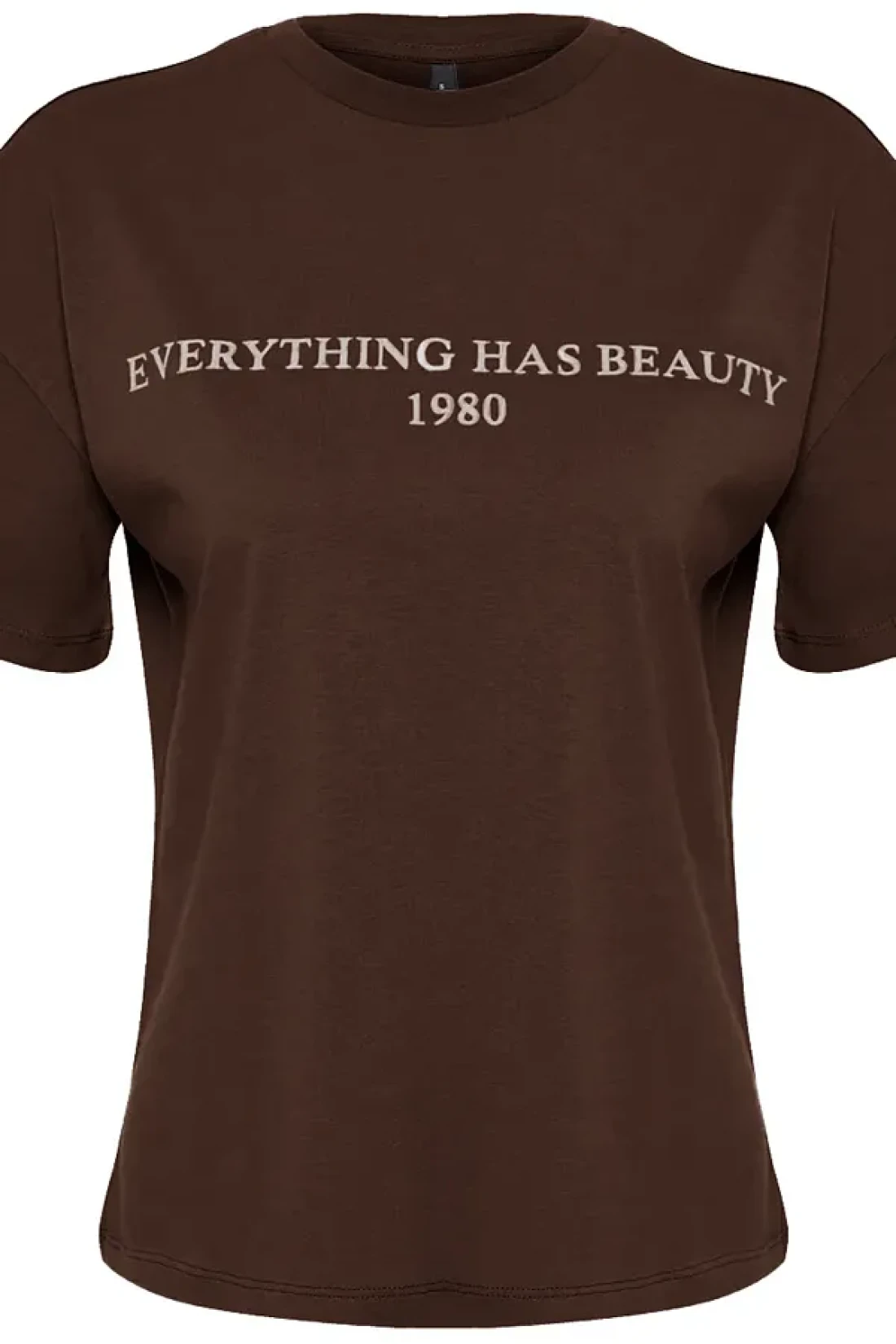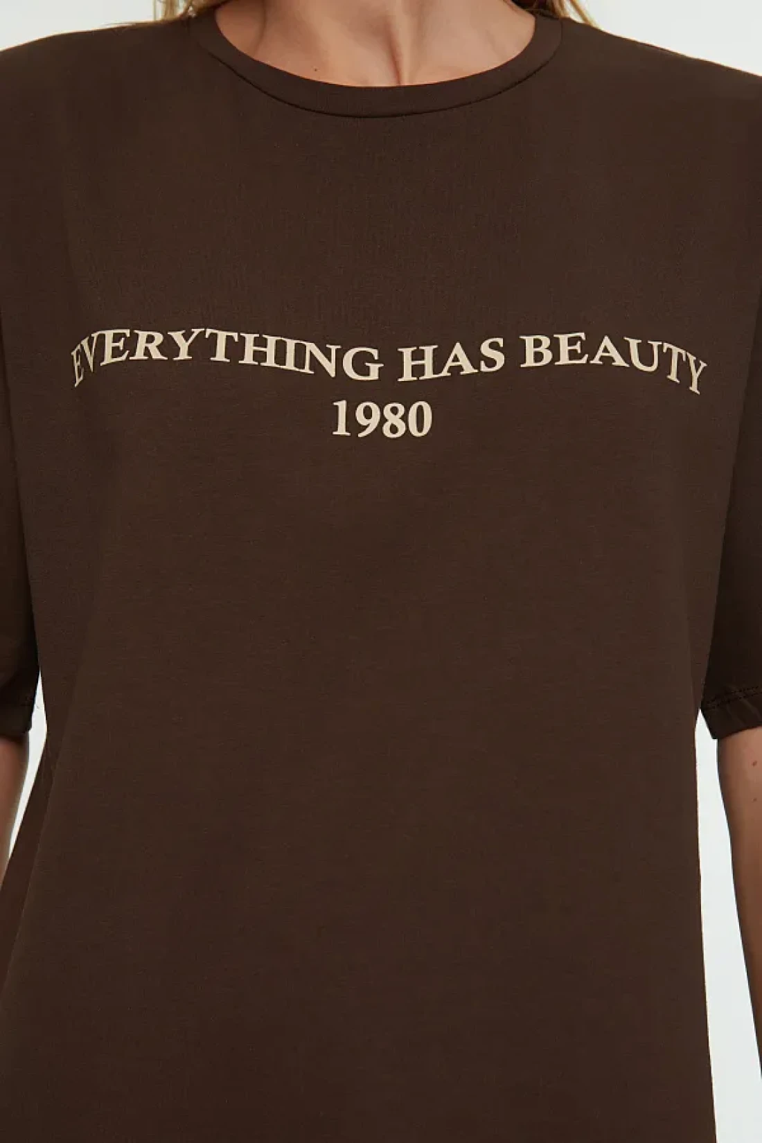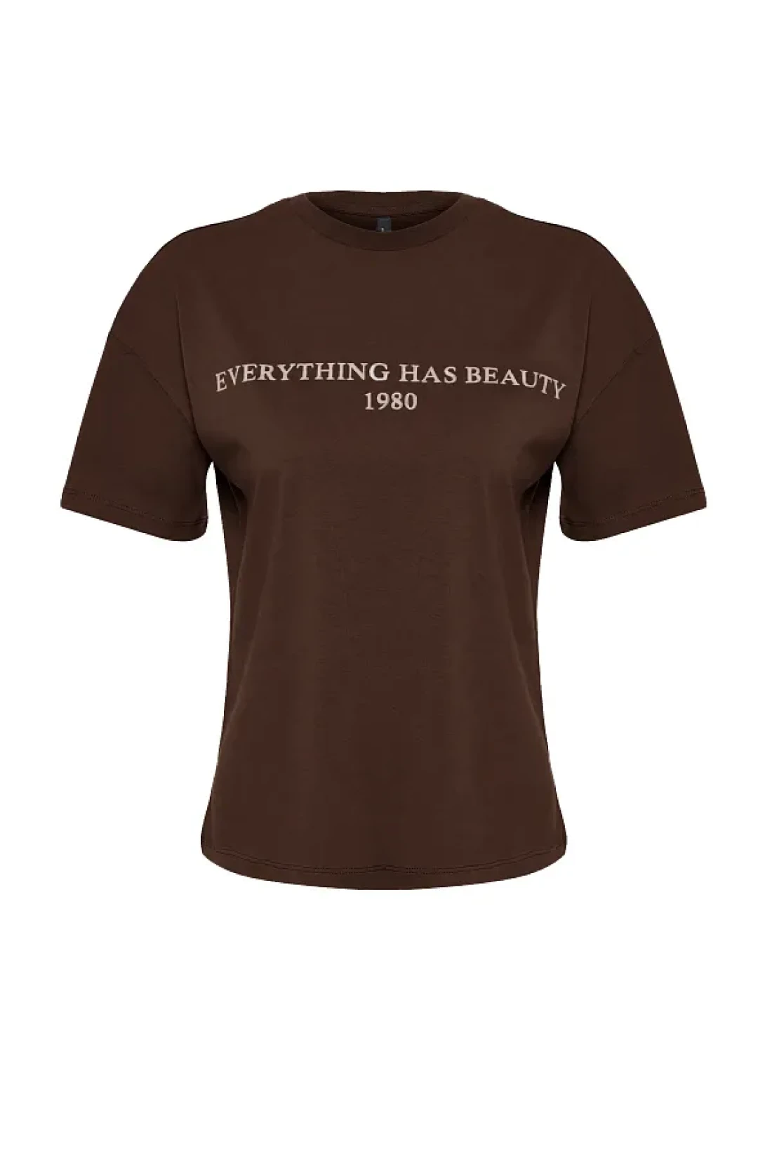 Collection تي شيرت محبوك بني 100٪ قطن مطبوع عليه شعار مريح / واسع ومريح TWOSS19GH0034