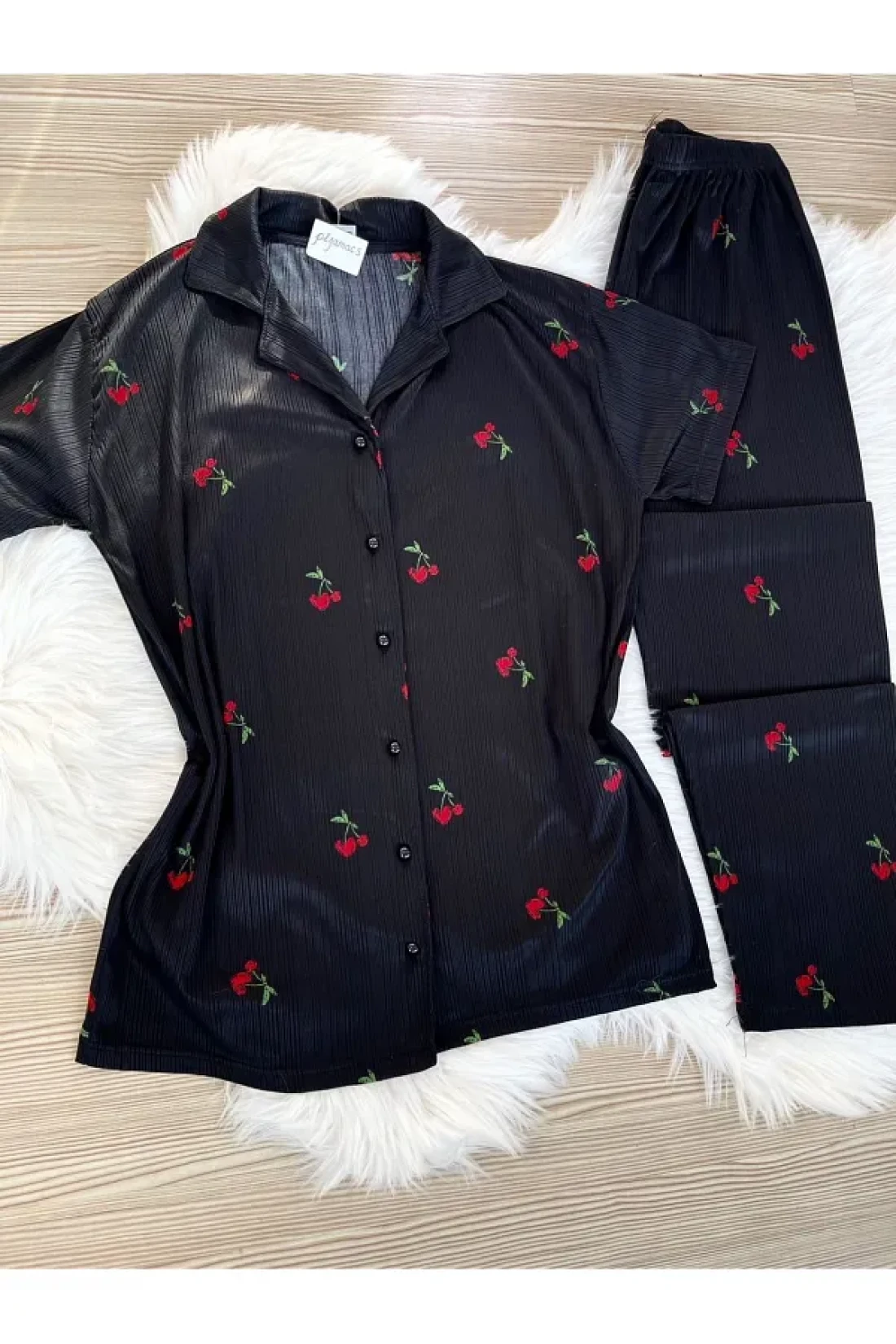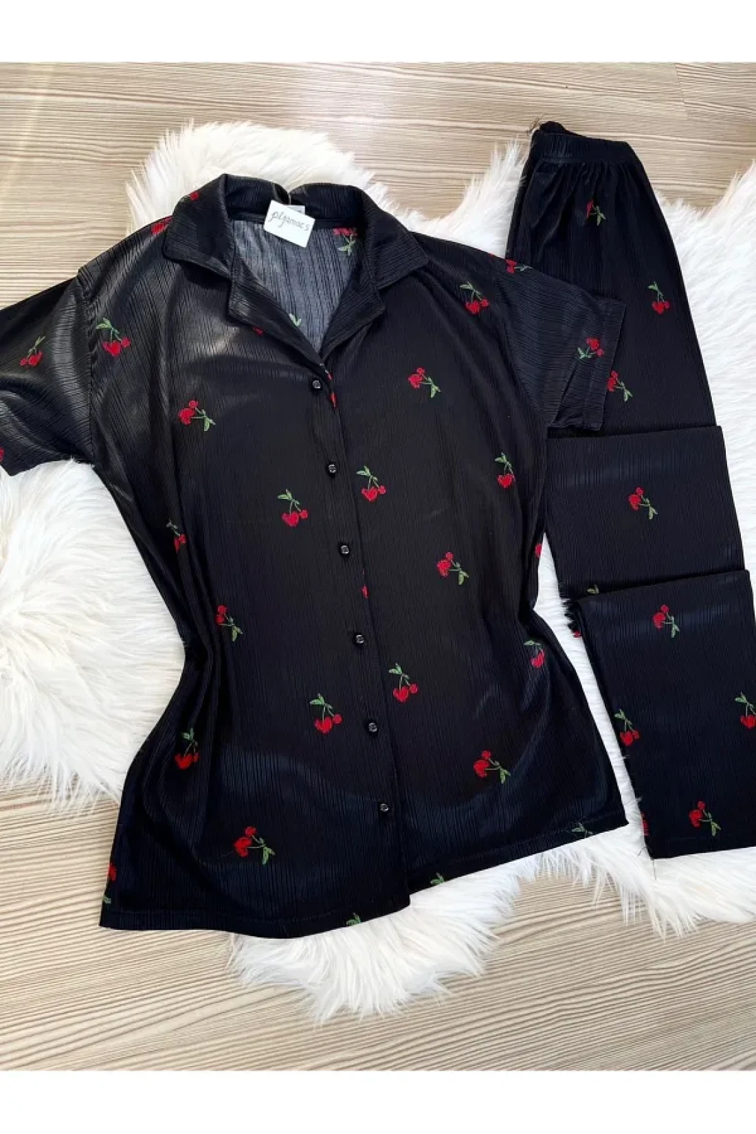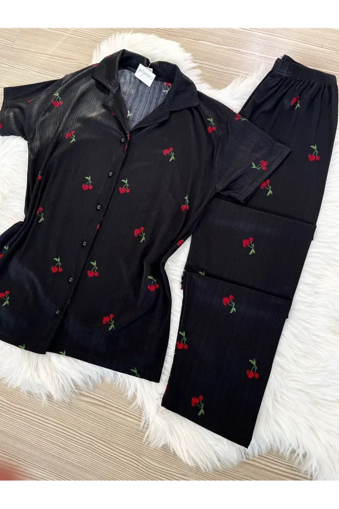 - طقم بيجامة بأكمام قصيرة مزين بأنماط الكرز، ينضح بطاقة الموسم. مجموعة مكونة من قطعتين؛ توفر الراحة والأناقة معًا.