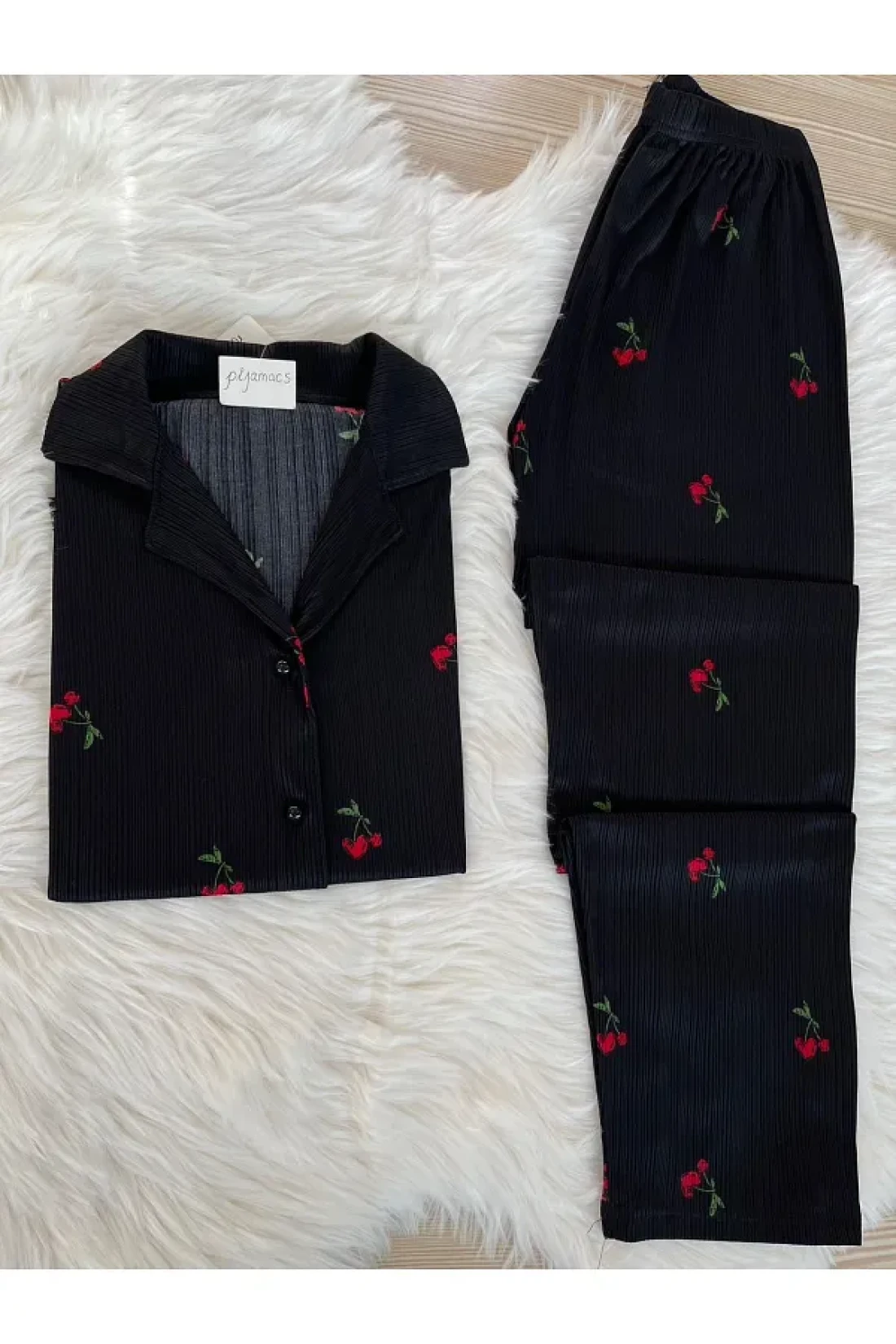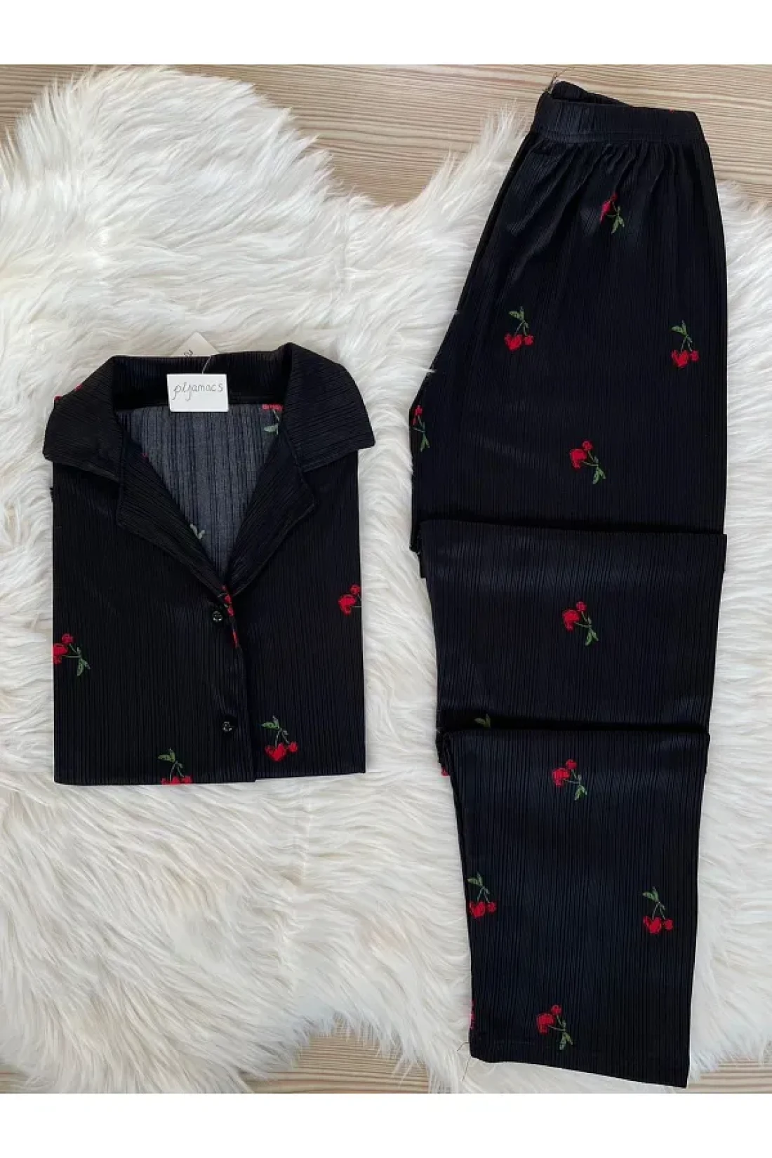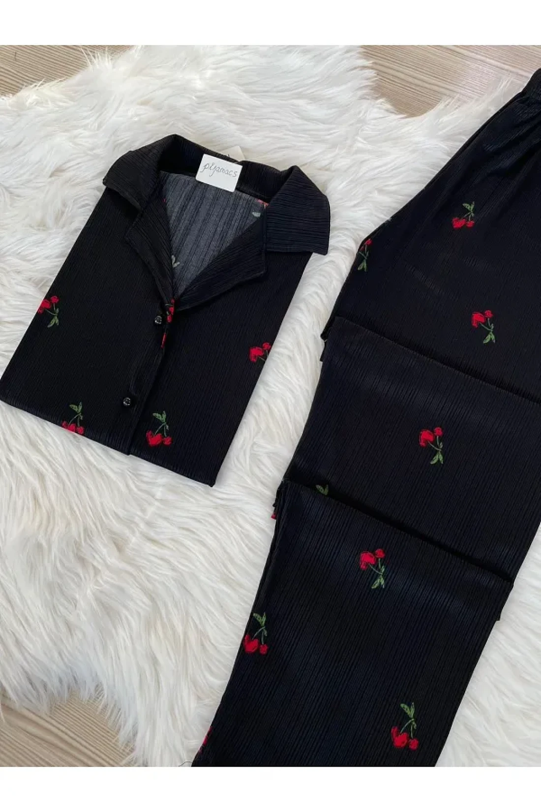 - طقم بيجامة بأكمام قصيرة مزين بأنماط الكرز، ينضح بطاقة الموسم. مجموعة مكونة من قطعتين؛ توفر الراحة والأناقة معًا.