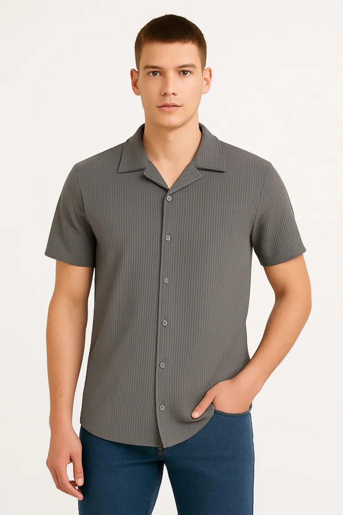 قميص رجالي بأزرار رمادية، يوفر الأناقة والراحة معًا في أشهر الصيف. إنه مناسب للاستخدام اليومي والمناسبات الخاصة بفضل قماشه القابل للتنفس وقصته العصرية. لا يجعلك تتعرق بفضل نسيجه الخفيف والناعم، ويضيف لمسة أنيقة إلى أسلوبك بياقة مستقيمة ولون بسيط. - تصميم بأكمام قصيرة وأزرار - ملاءمة مريحة، تناسب الجسم بالكامل - قماش سهل الكي - مناسب لجميع الفصول