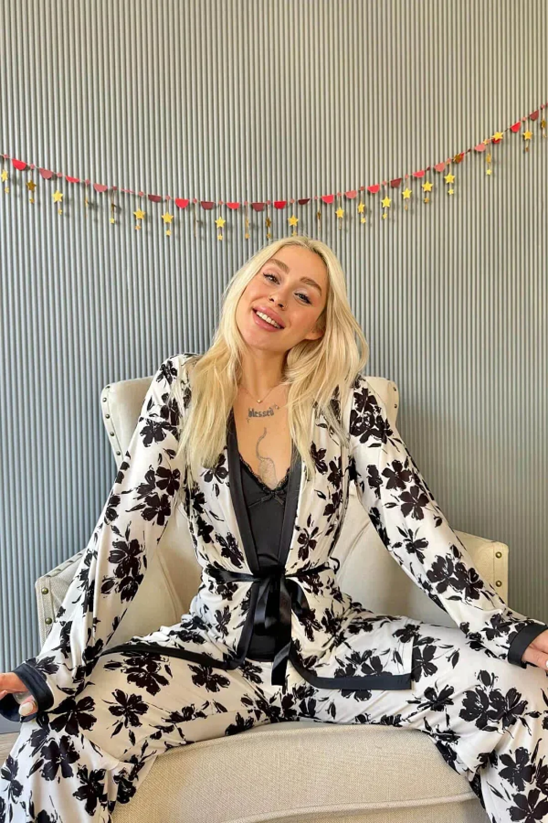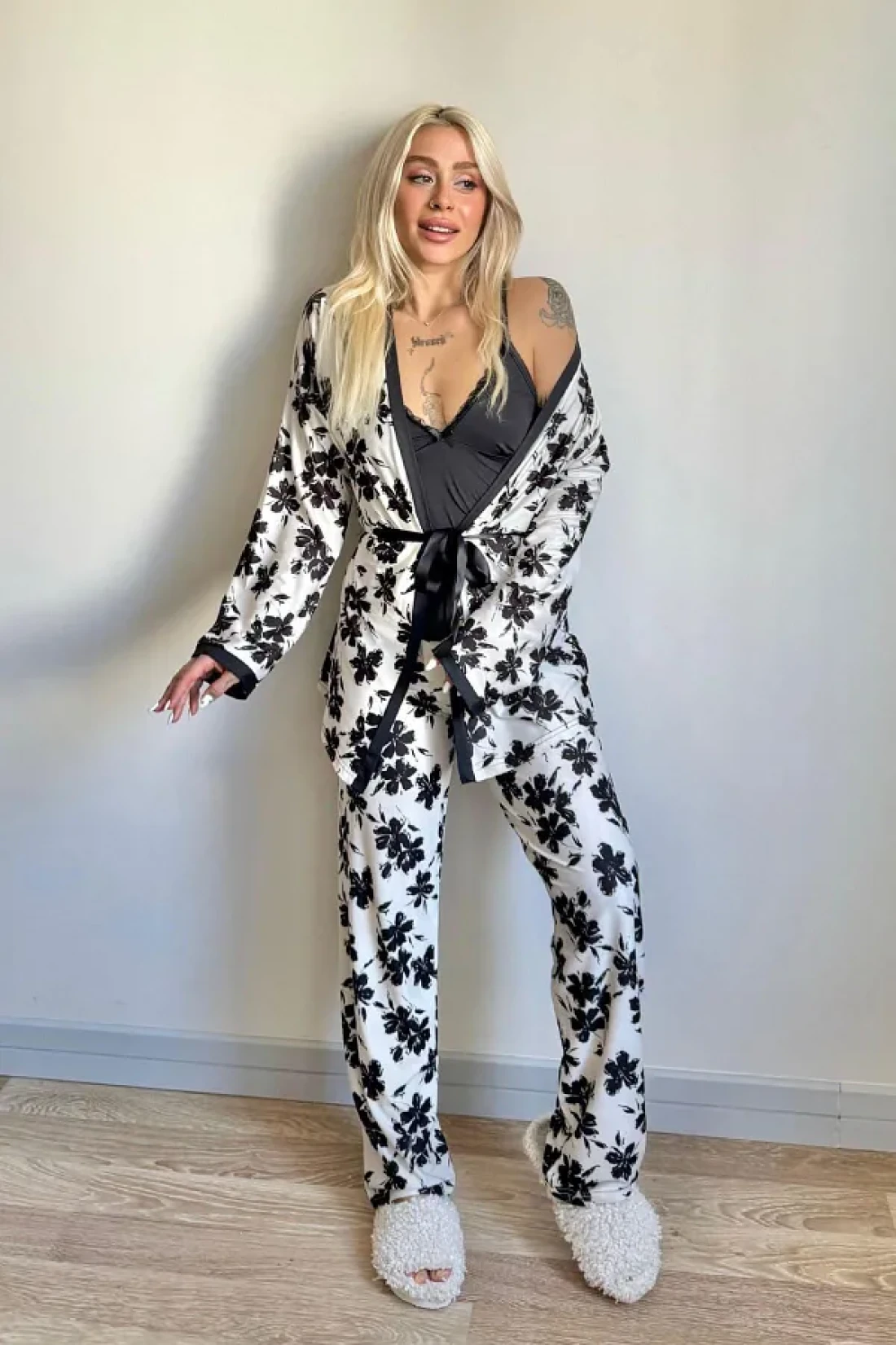 قماش Yumoş L قماش قابل للتمدد مستورد، سلسلة حصرية من 3 قطع، رداء مع أشرطة داخلية من الحبل، رداء طويل الأكمام مع بيجامة طويلة من الأسفل؛ قياسات العارضة: الارتفاع: 1. 67، الوزن: 45، الصدر: 82، الخصر: 60، الورك: 86؛ قطع عادي عادي حجم العينة: S/36/1؛ نوع القماش: 95% خيزران، 5% إيلاستان تتميز مجموعة البيجامة المكونة من ثلاث قطع من سلسلة Exclusive Series، المصنوعة من قماش ناعم قماش قابل للتمدد المستورد، بتصميم أنيق يؤكد على الأناقة والراحة. نسيج ناعم من الخيزران بنسبة 95% والإيلاستين بنسبة 5%، مع ثوب طويل الأكمام وحزام داخلي من الحبال يوفر الراحة طوال الليل. النموذج، الذي يبلغ طوله 1.67، ويزن 45 كيلوغرامًا، ويظهر بمقاس S/36، يقدم ملاءمة مريحة بفضل قصته العادية. هذه المجموعة الفاخرة هي الخيار الأمثل للحظات الاسترخاء في المنزل.