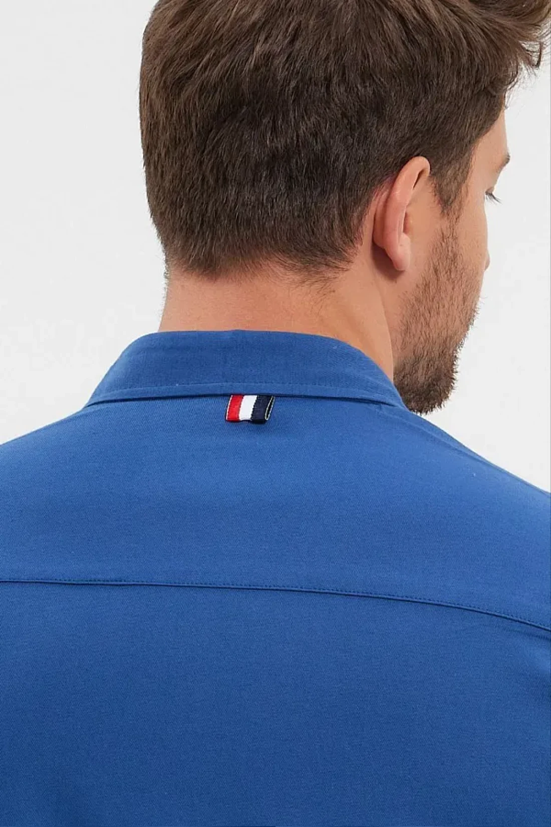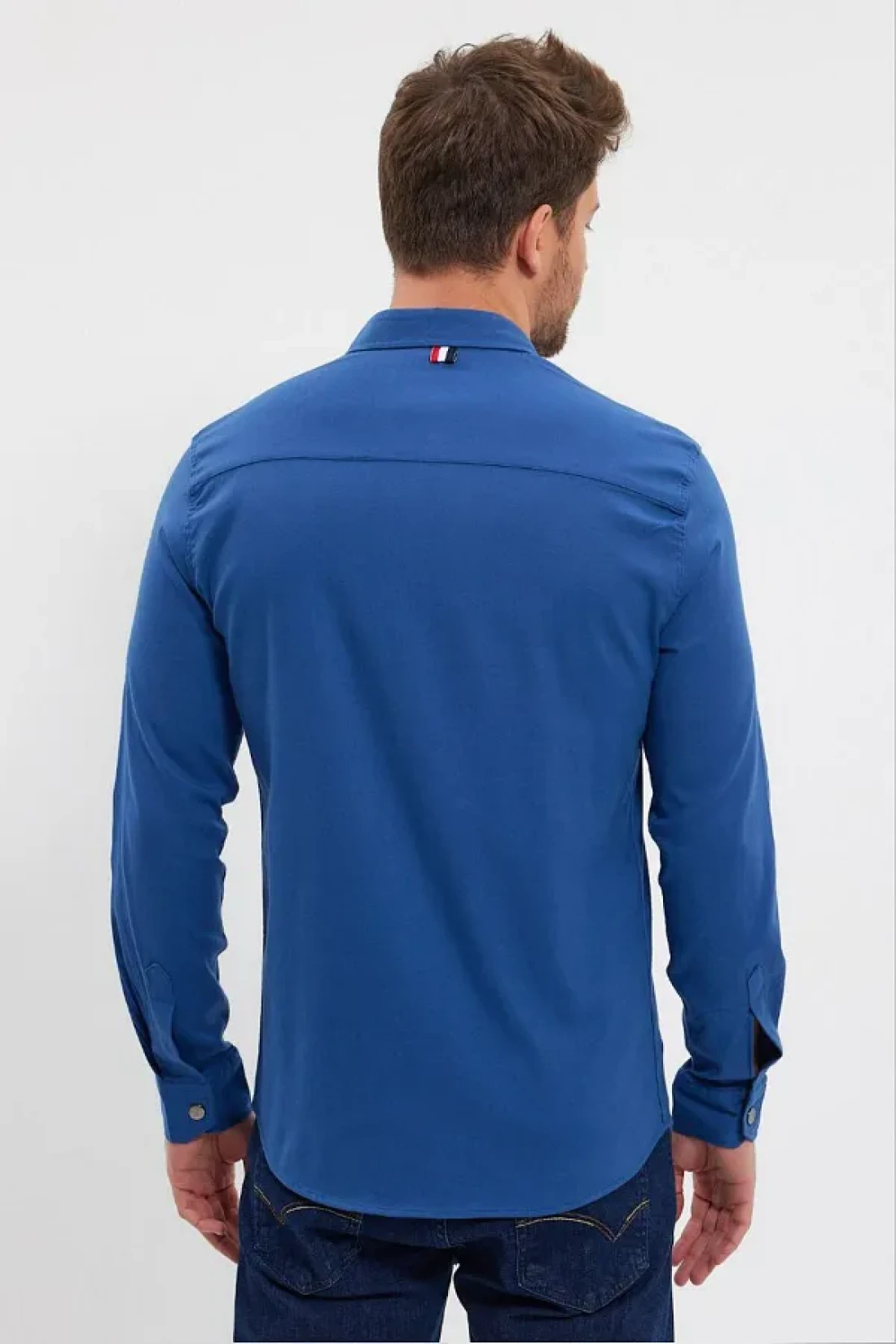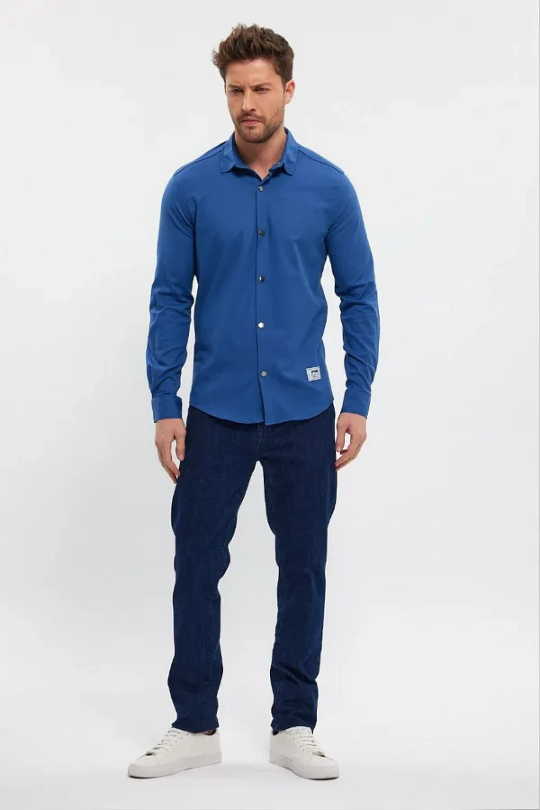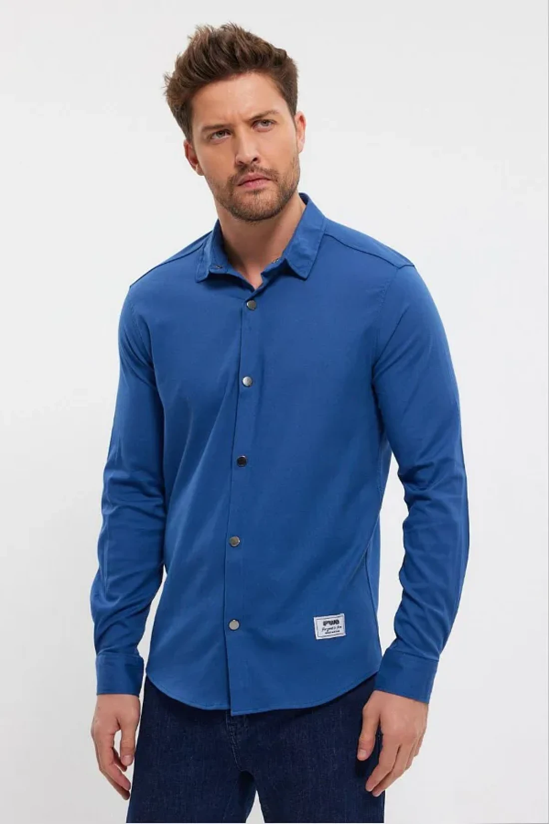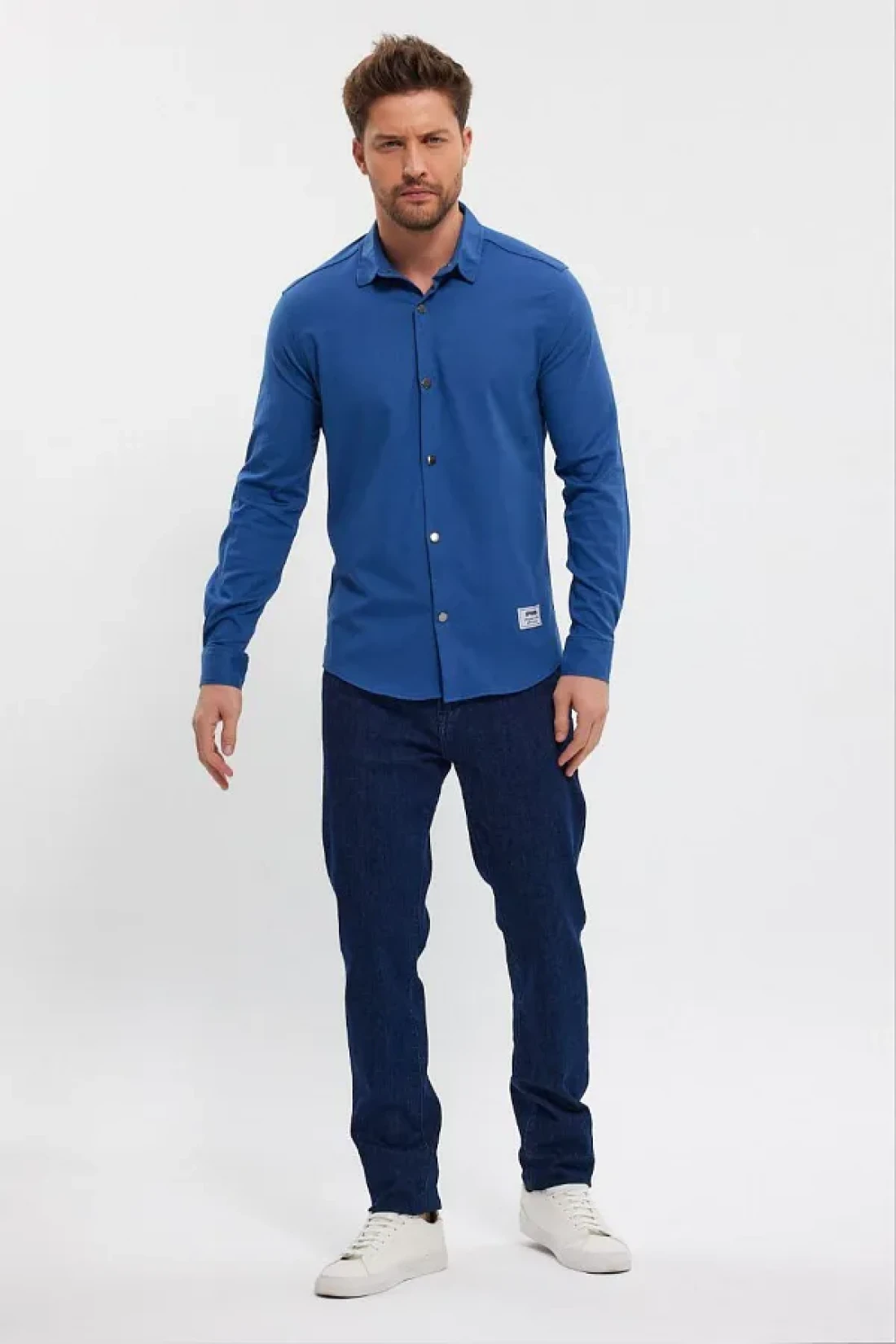 DeepSea قميص رجالي من الليكرا بقصة ضيقة باللون الأزرق الداكن - بأكمام طويلة وأزرار كبس2403013