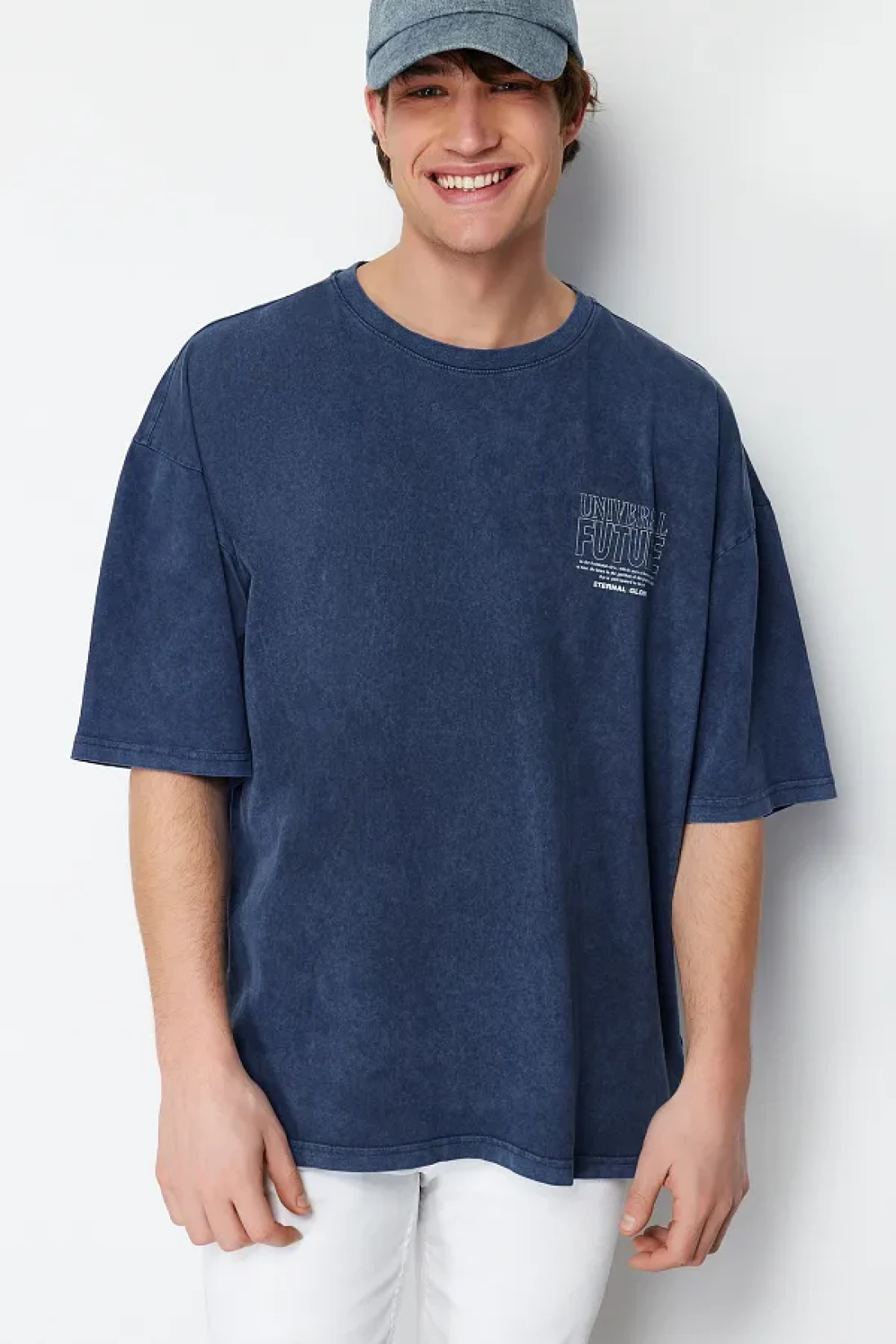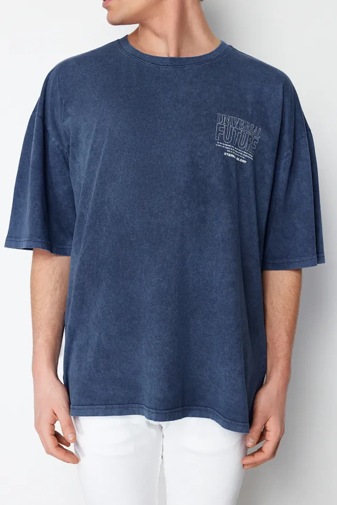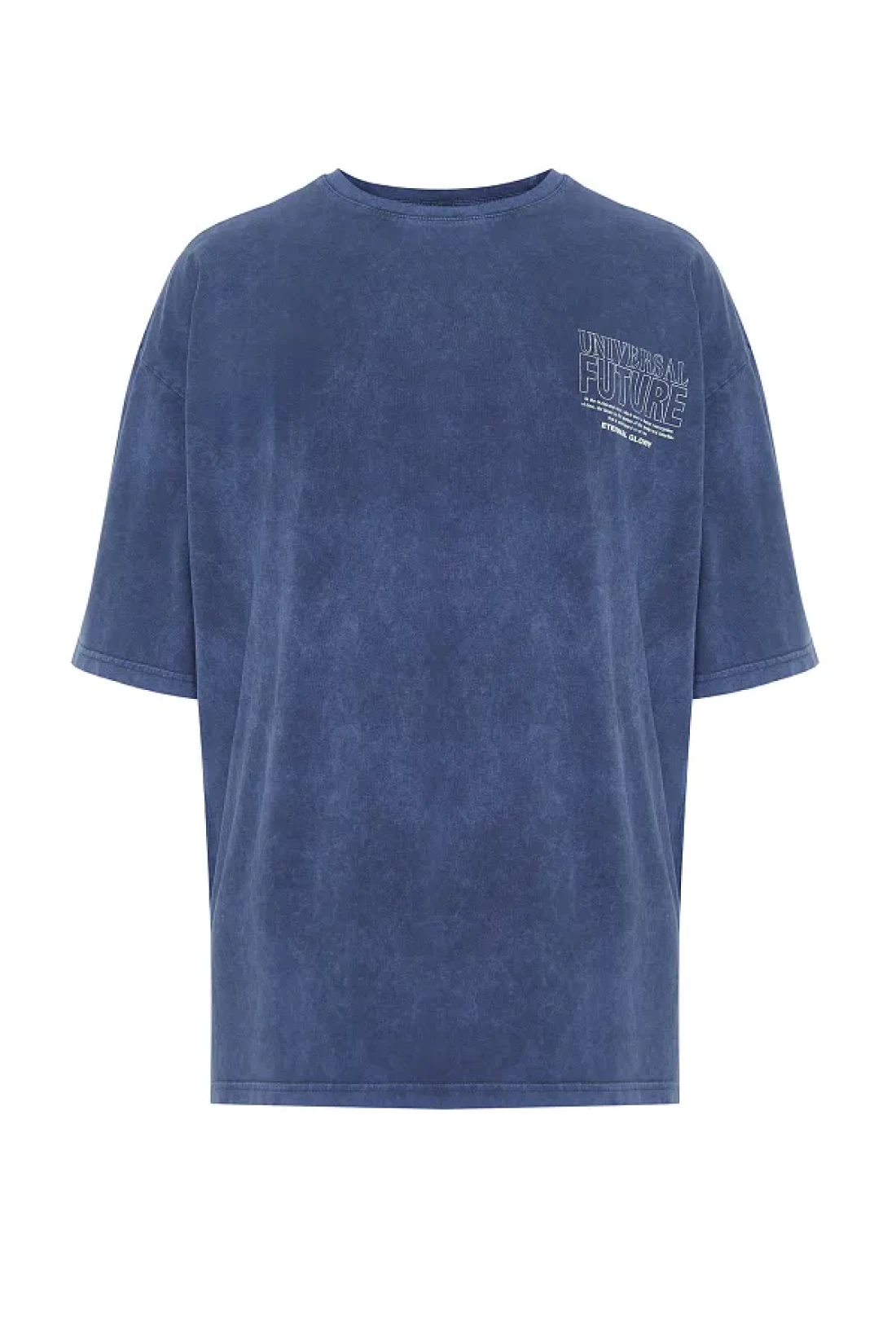 Collection تي شيرت نيلي كبير الحجم/واسع القطع بتأثير شاحب مطبوع عليه حروف 100% قطن TMNSS24TS00043