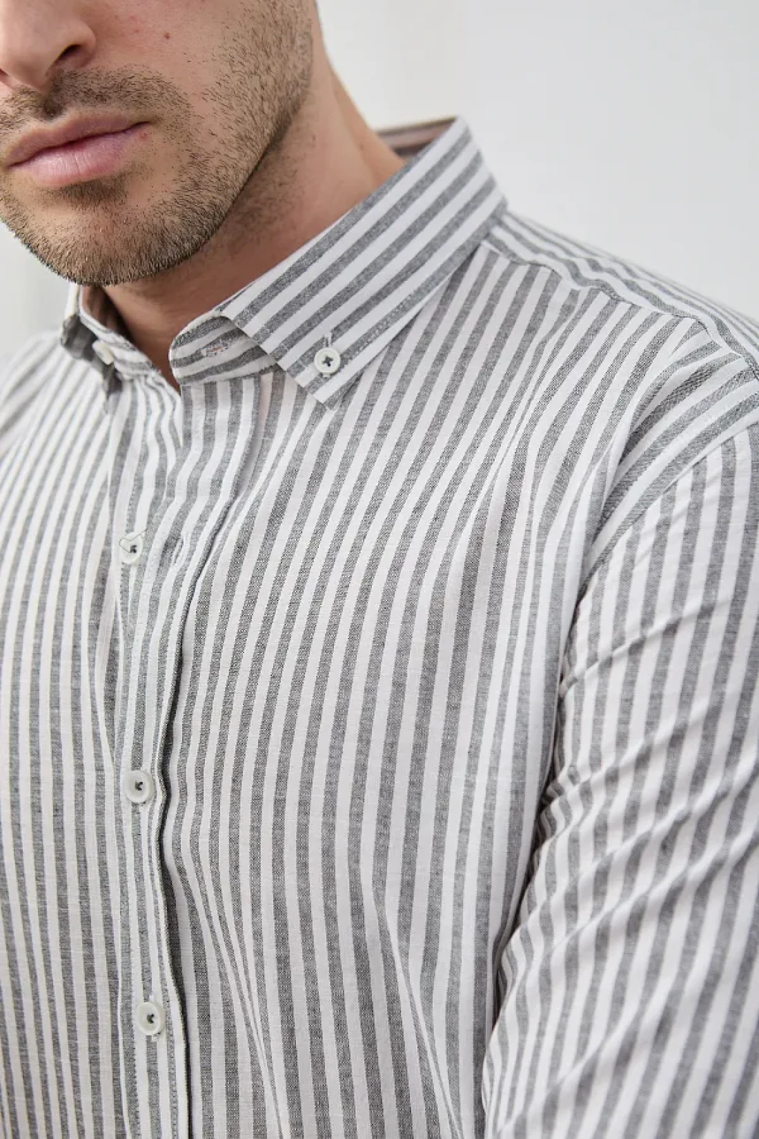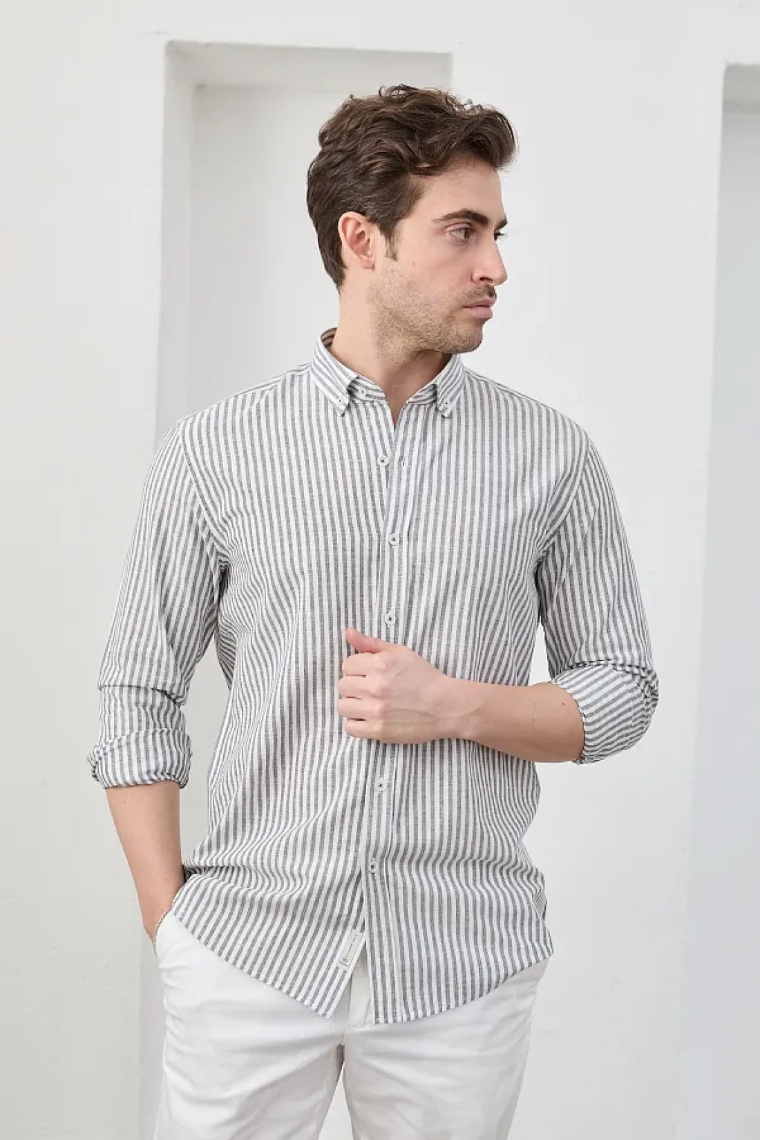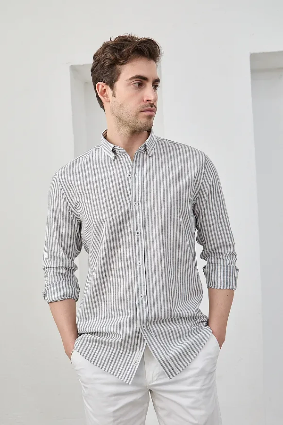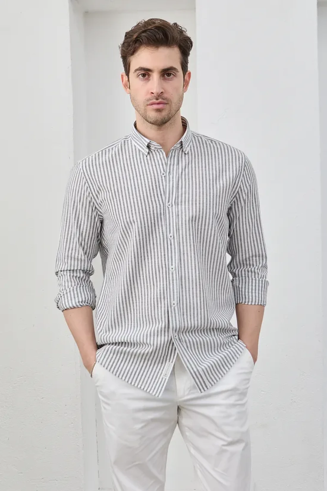 RAVANELLI قميص رجالي من القطن والكتان مخطط باللون الأسود بقصة ضيقة