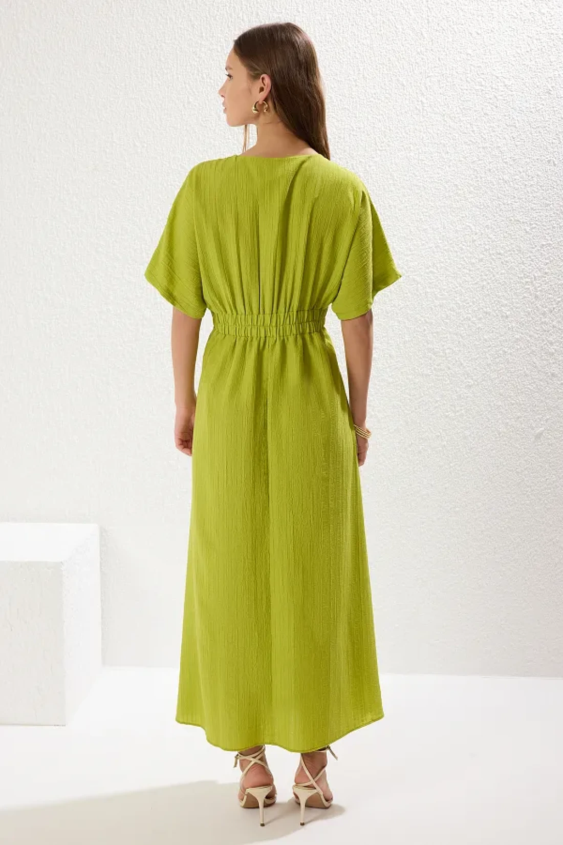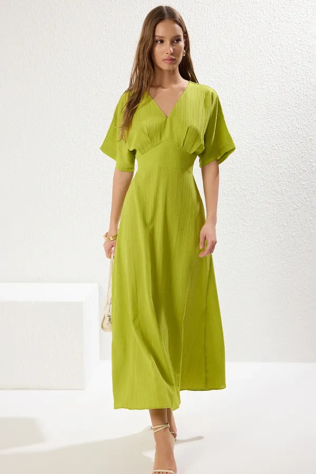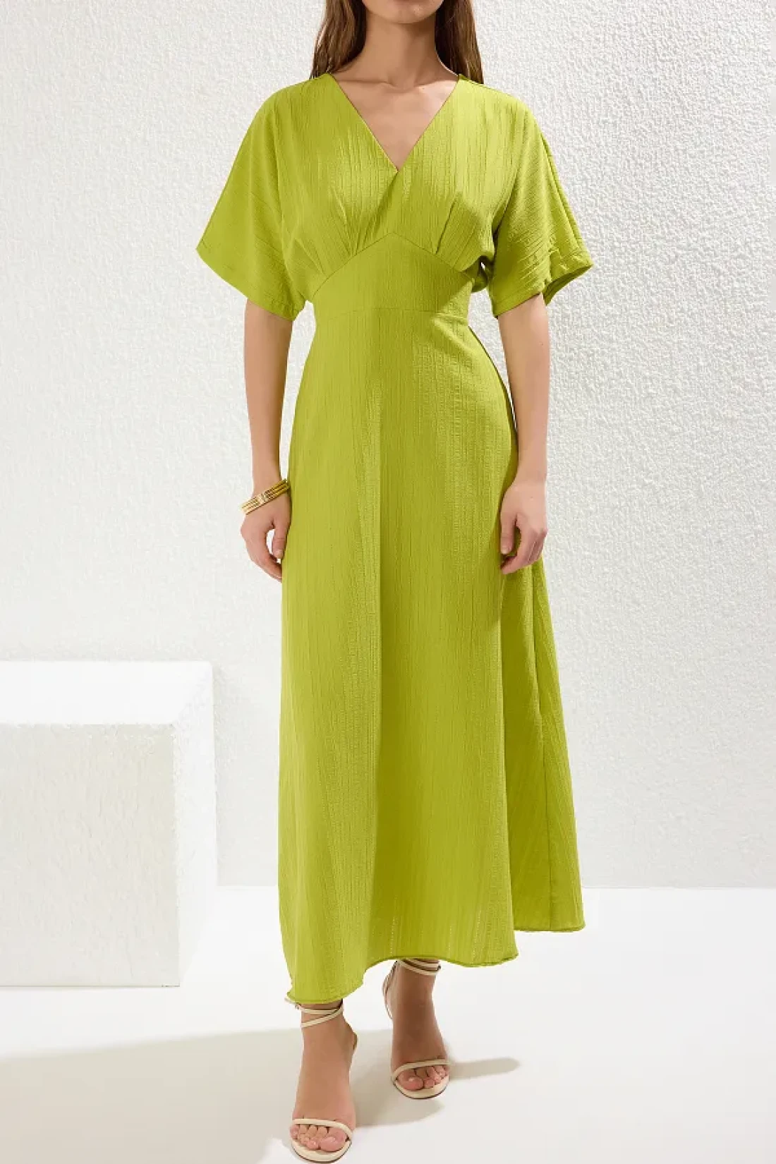 Collection فستان طويل برقبة على شكل حرف V باللون الأخضر الدهون - على شكل حرف A مع تفاصيل صدرية TWOSS24EL00620