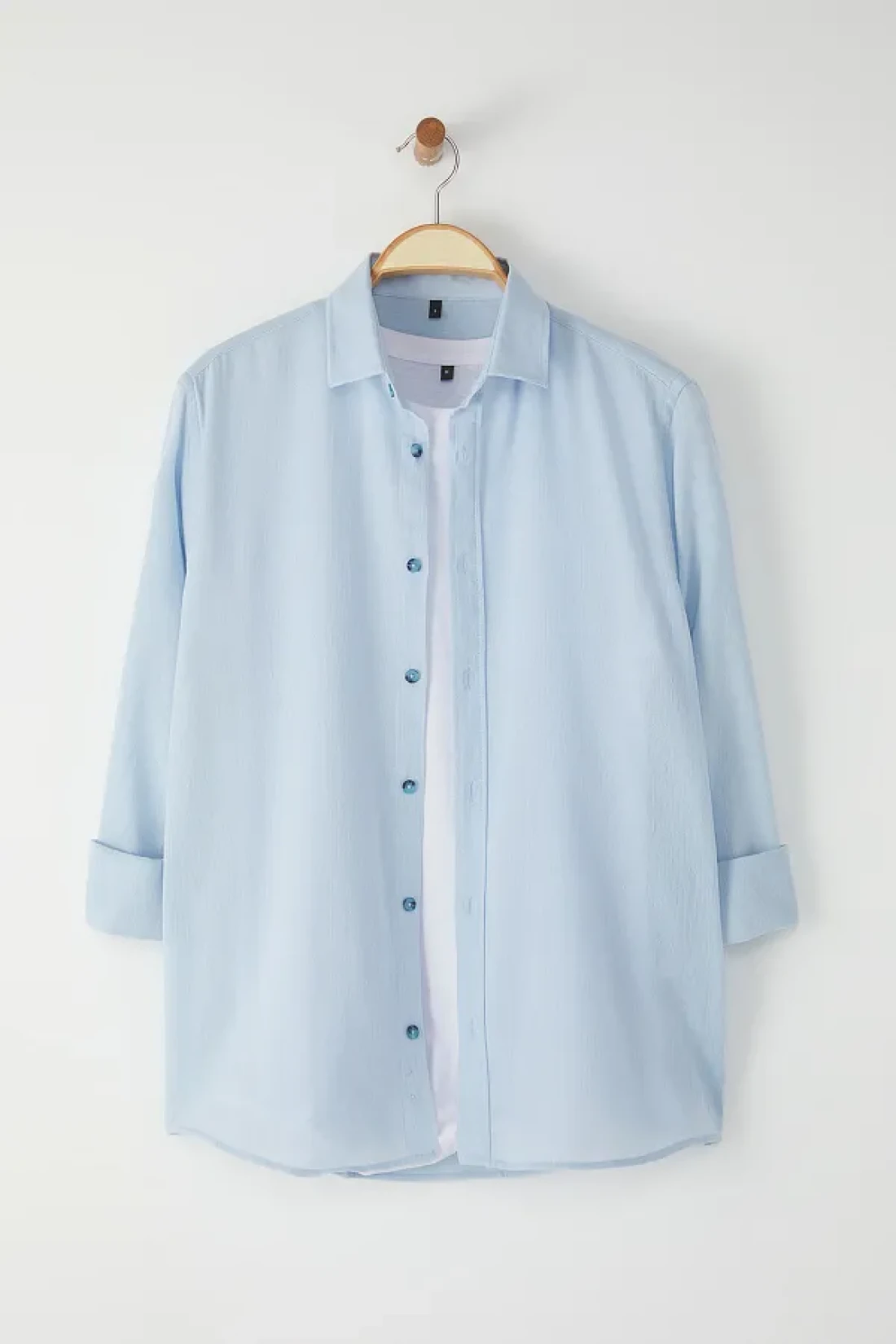 Collection قميص ذو مظهر كتان أزرق فاتح ذو قصة عادية مع كتاف وتأثير مجعد TMNSS23GO00061
