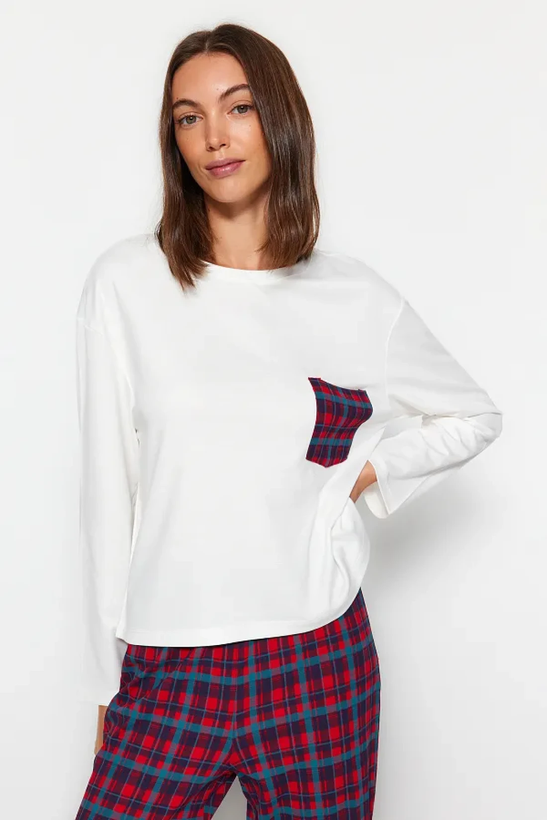 Collection طقم بيجامة منقوشة باللون الأبيض 100% من القطن - تفاصيل الجيب، THMAW24PT00228