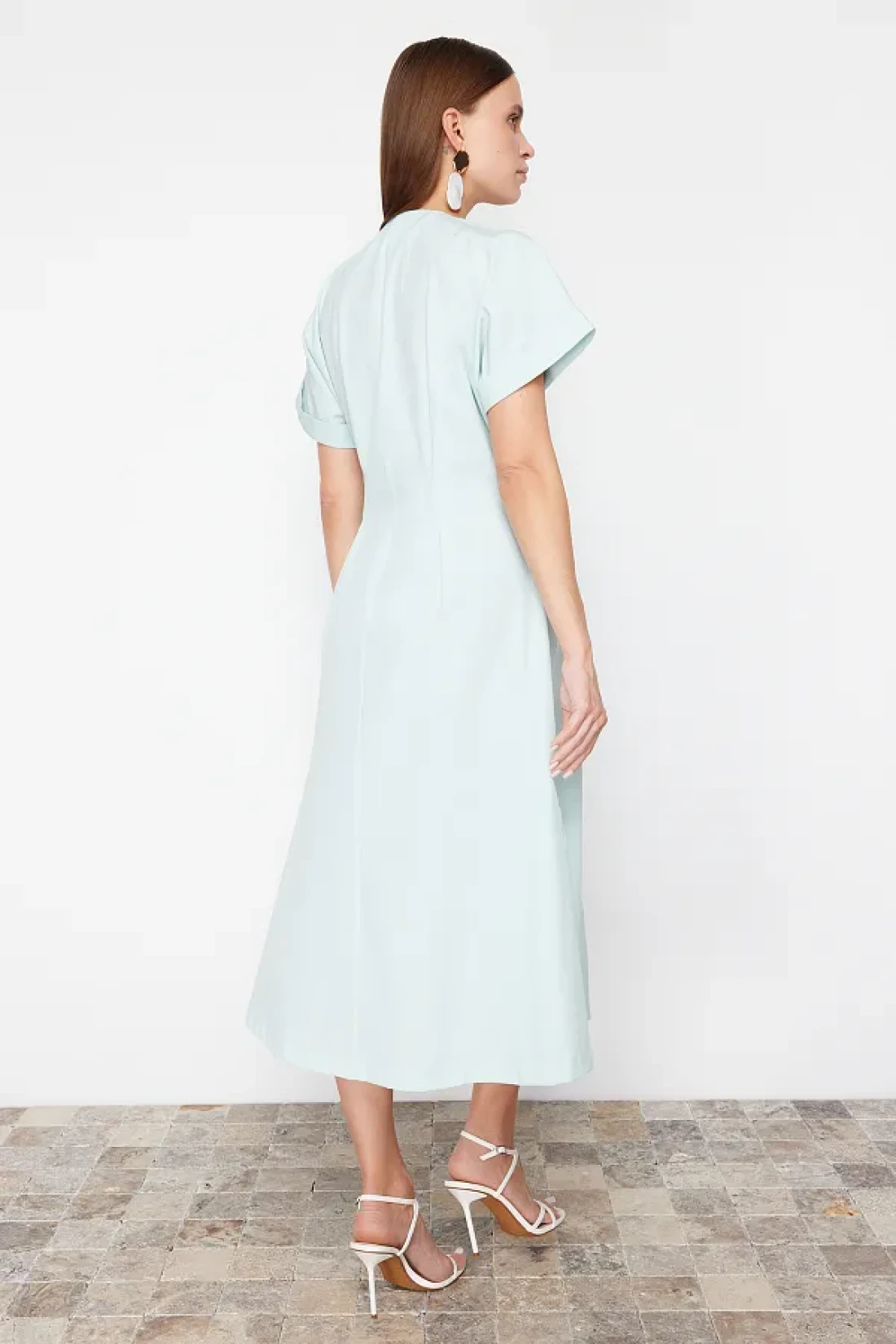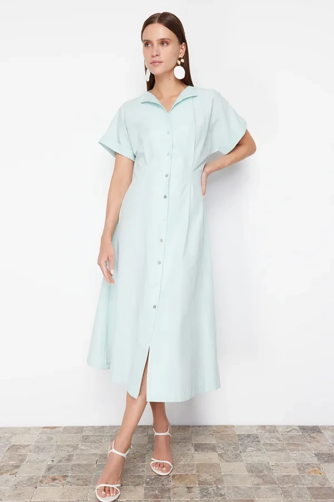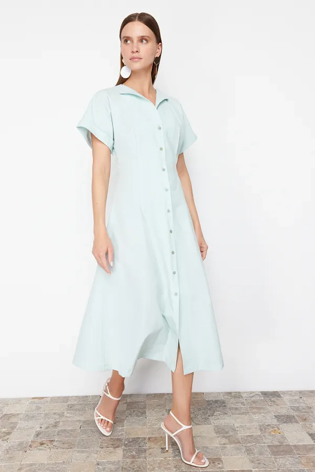 Collection فستان قميص منسوج متوسط الطول بفتحة خصر بلون النعناع TWOSS24EL00052