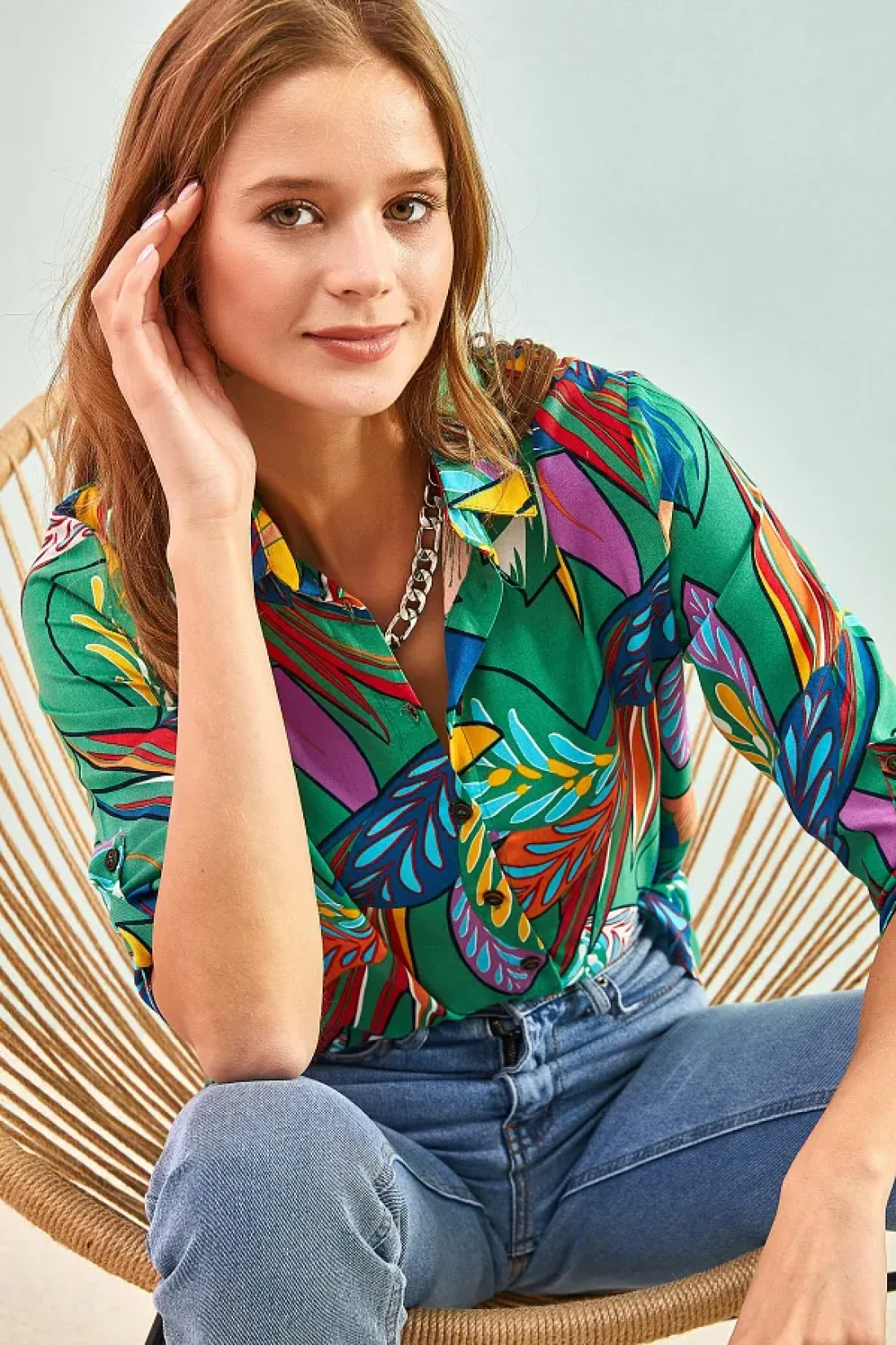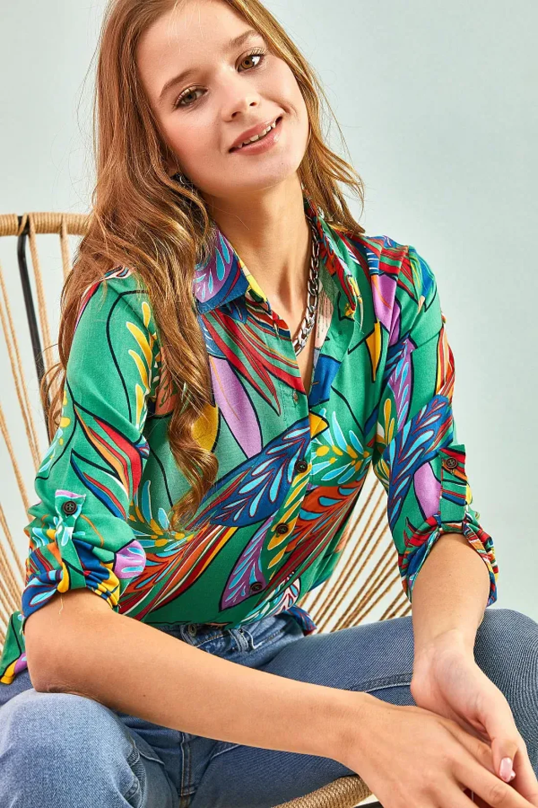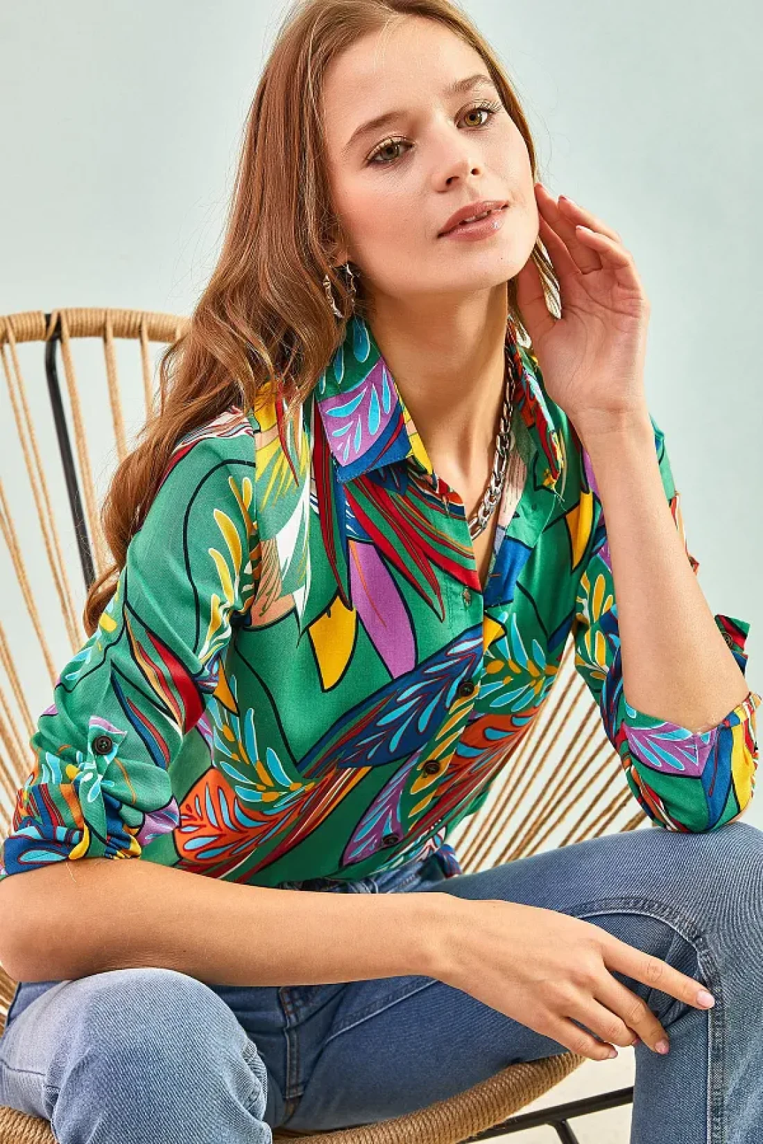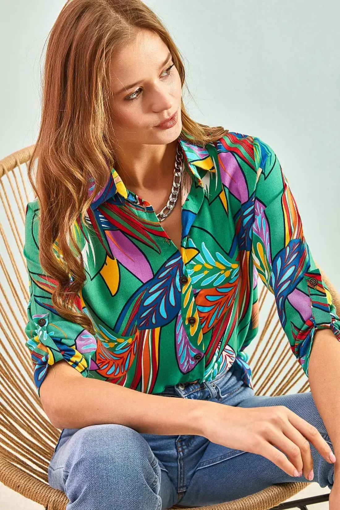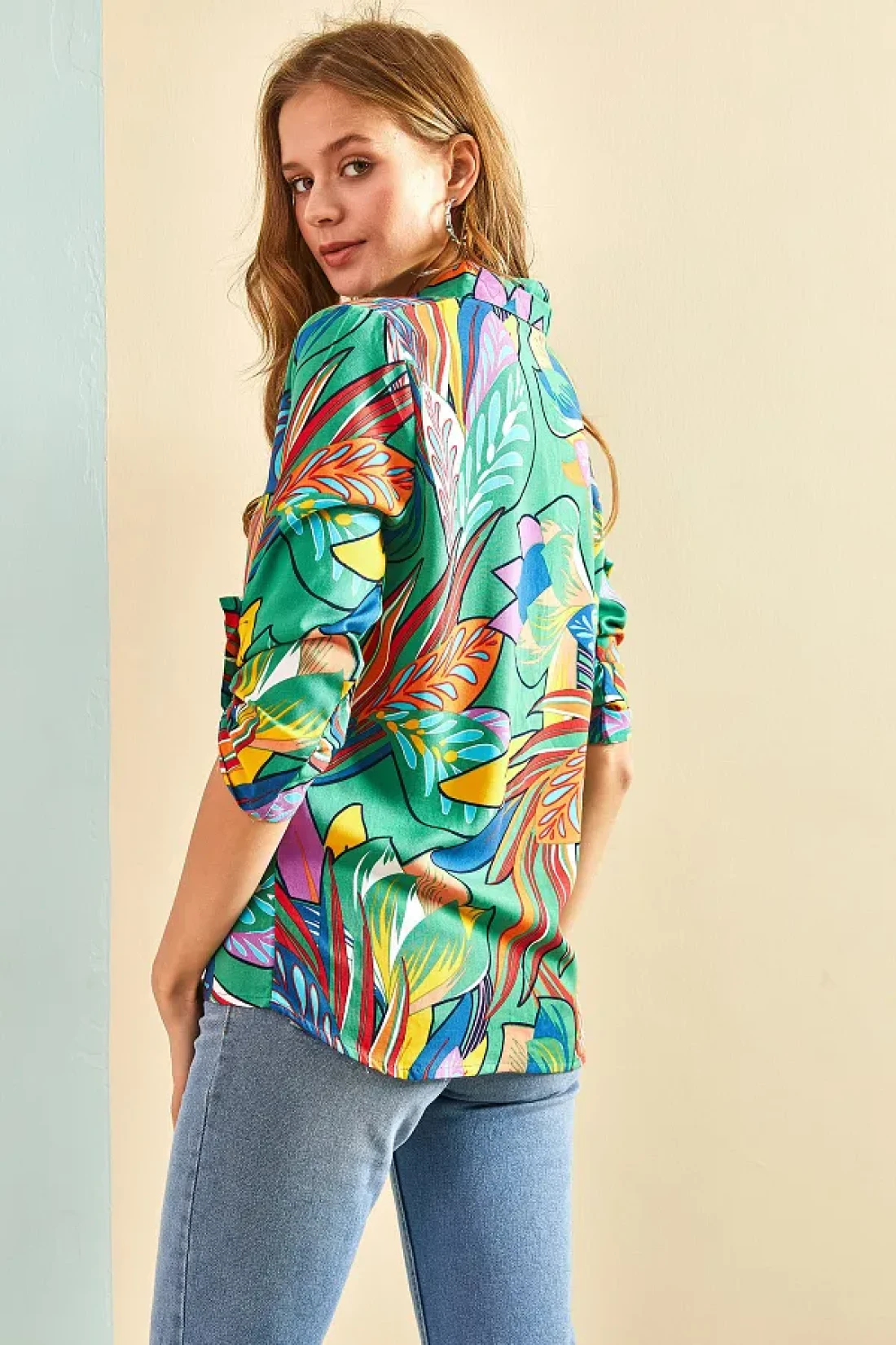 Bianco Lucci قميص فيسكوز نسائي مطوي وأكمام منقوشة بأوراق متعددة