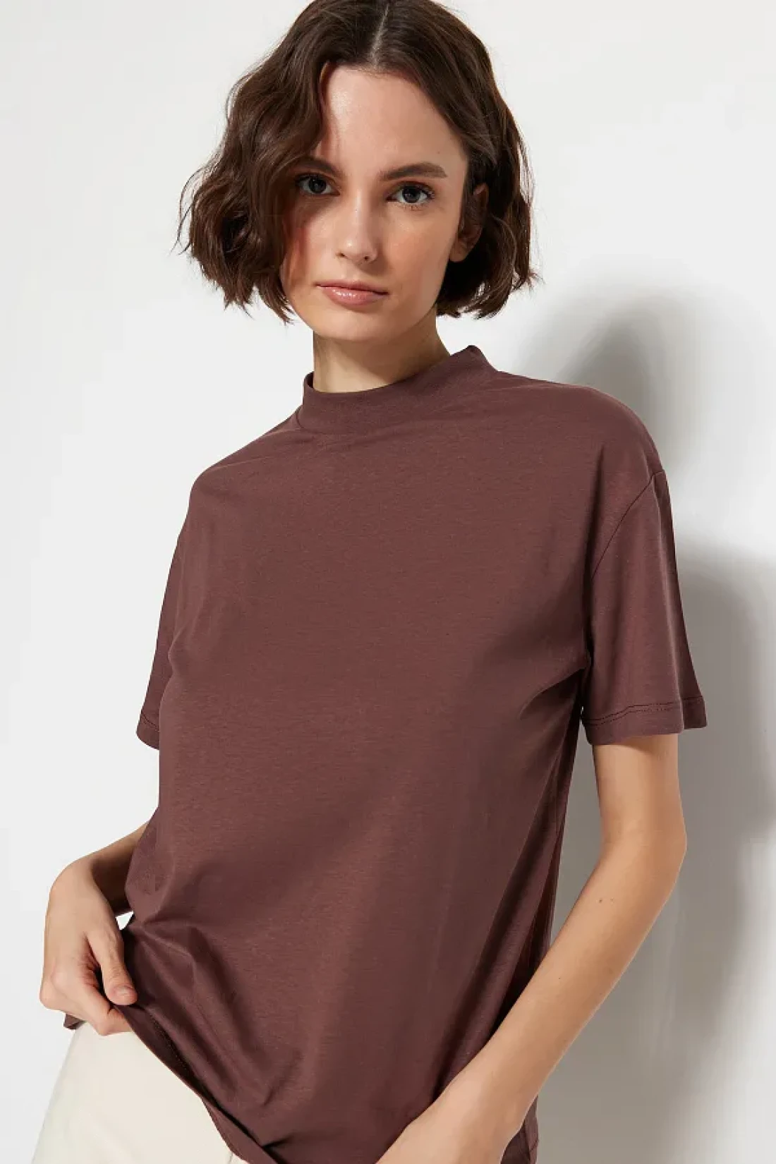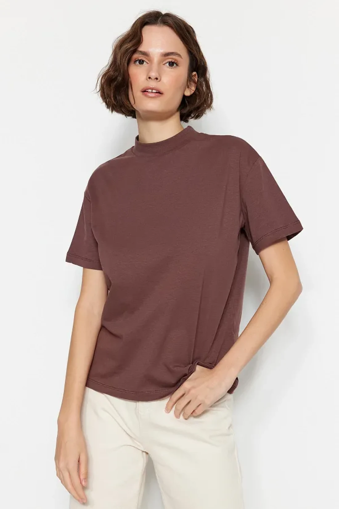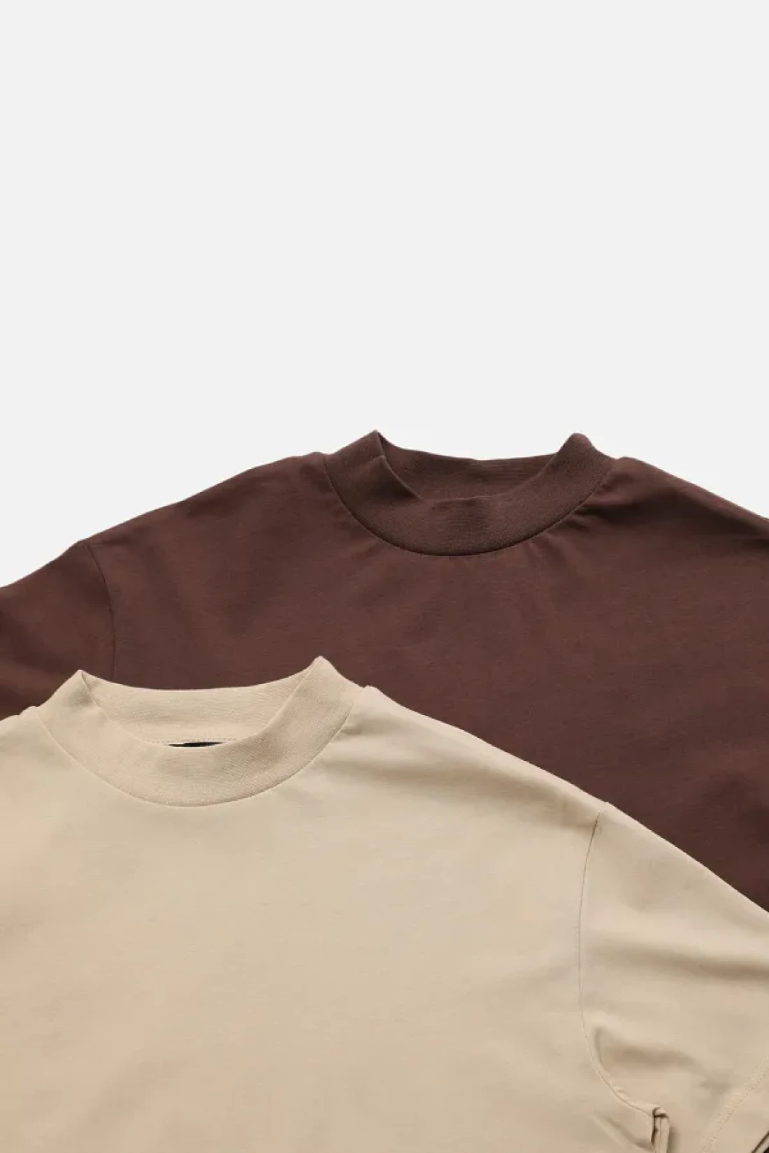 Collection تي شيرت منسوج بياقة واقفة أساسي من القطن بنسبة 100% مكون من قطعتين باللون البني والبيج TWOSS20TS1500