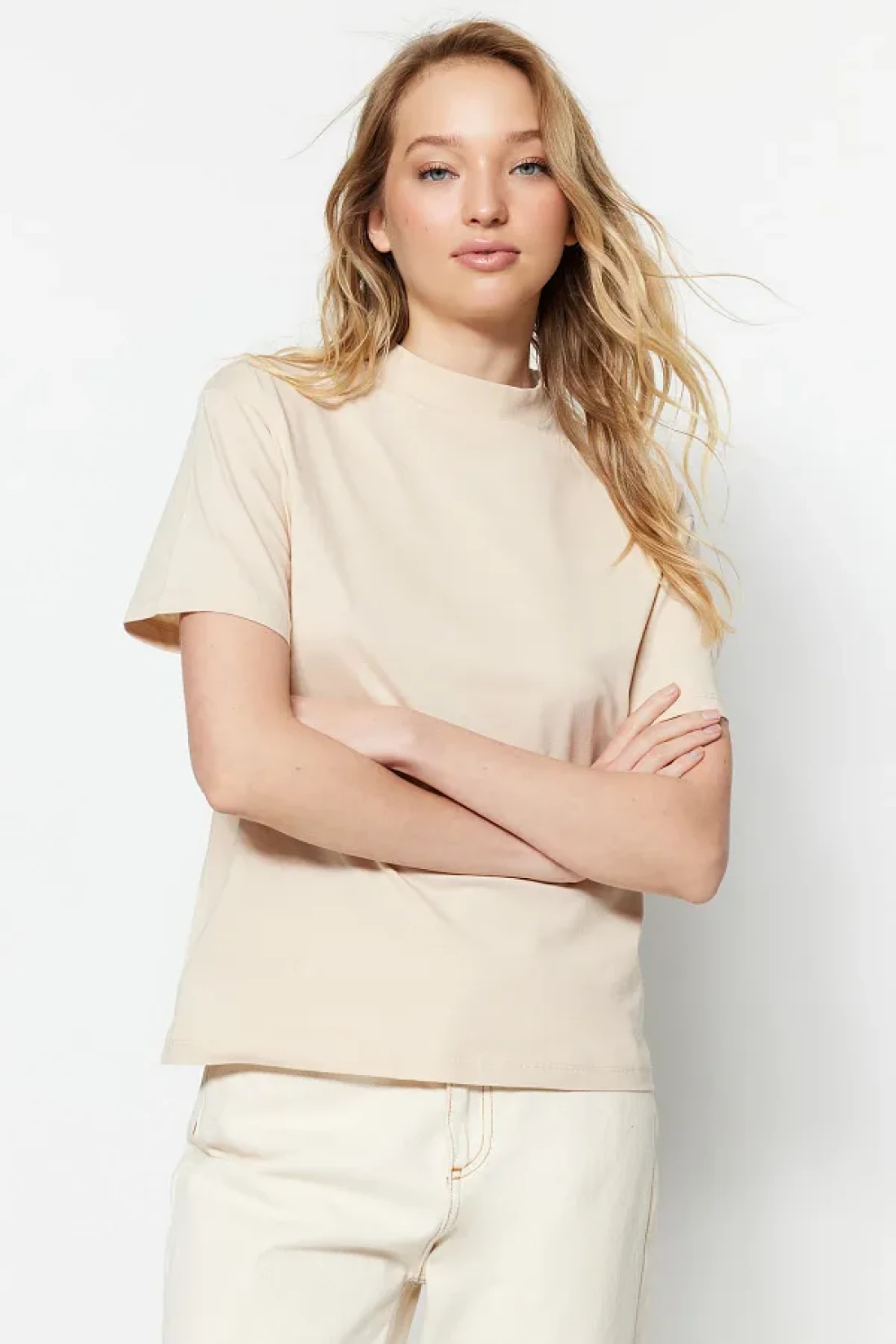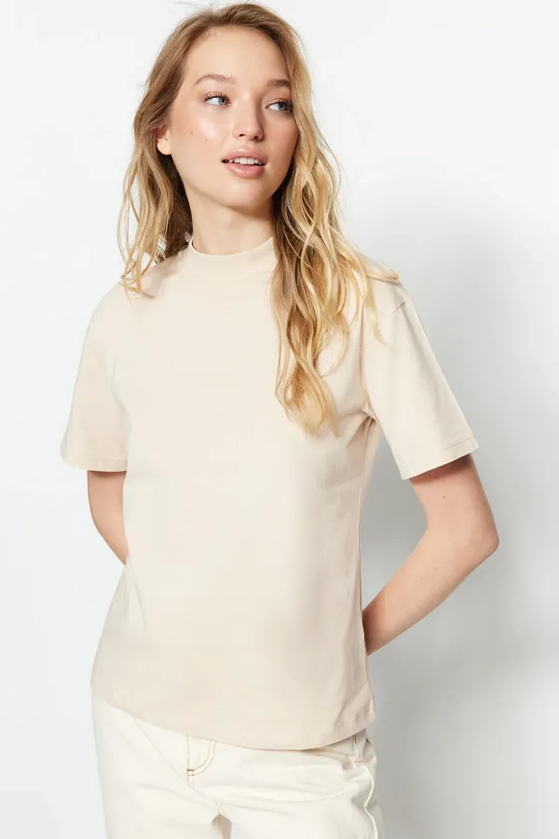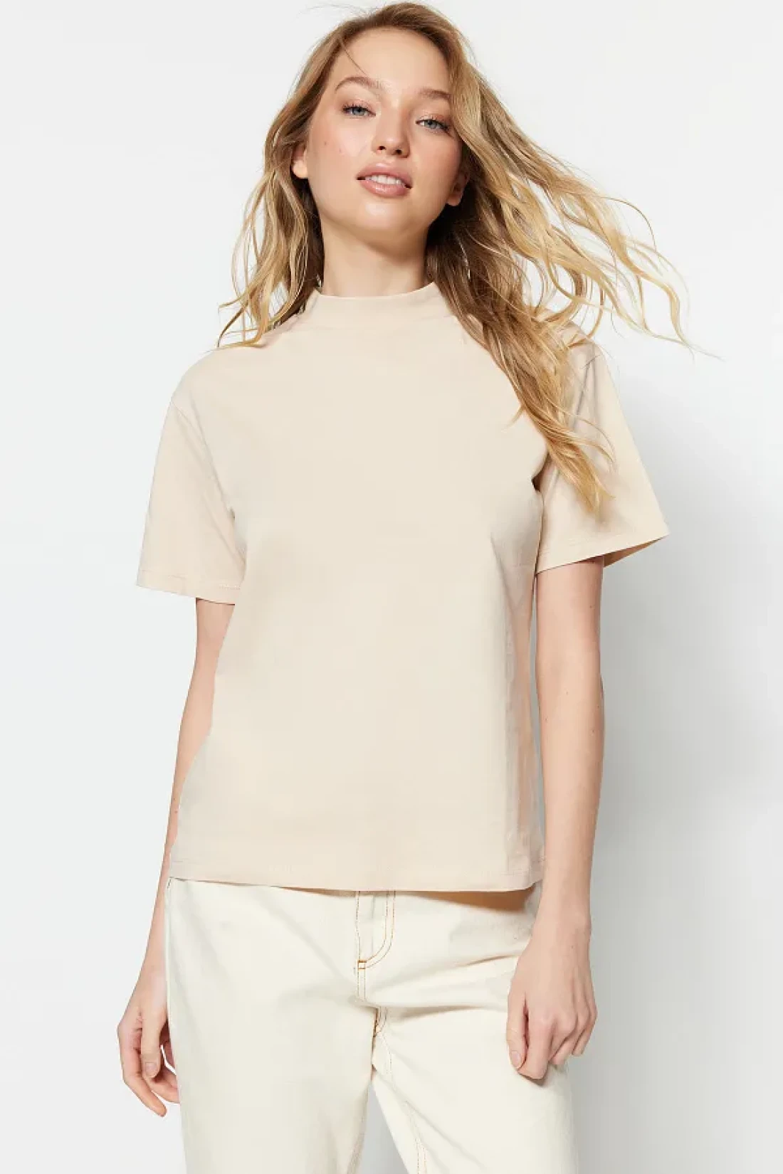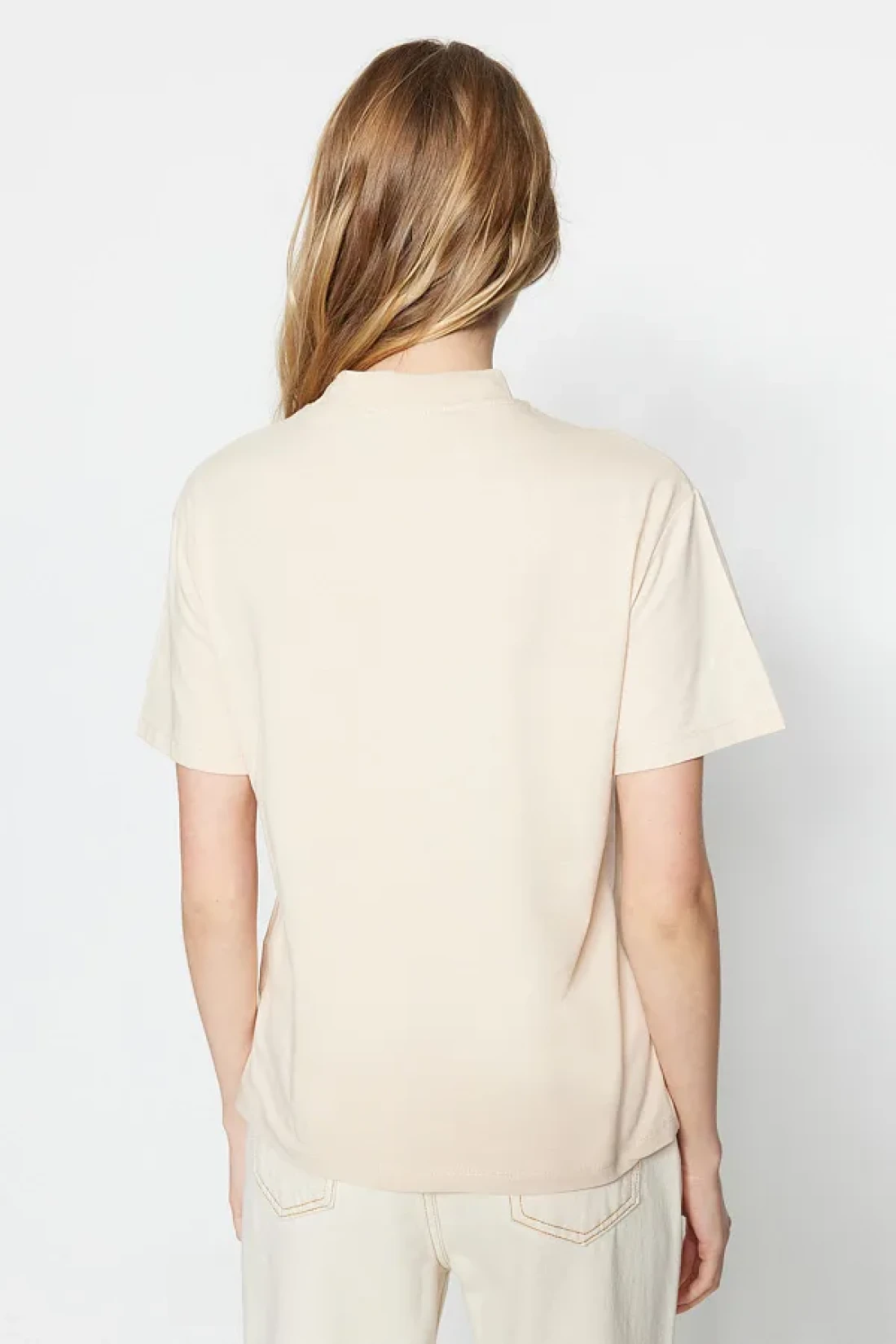 Collection تي شيرت منسوج بياقة واقفة أساسي من القطن بنسبة 100% مكون من قطعتين باللون البني والبيج TWOSS20TS1500