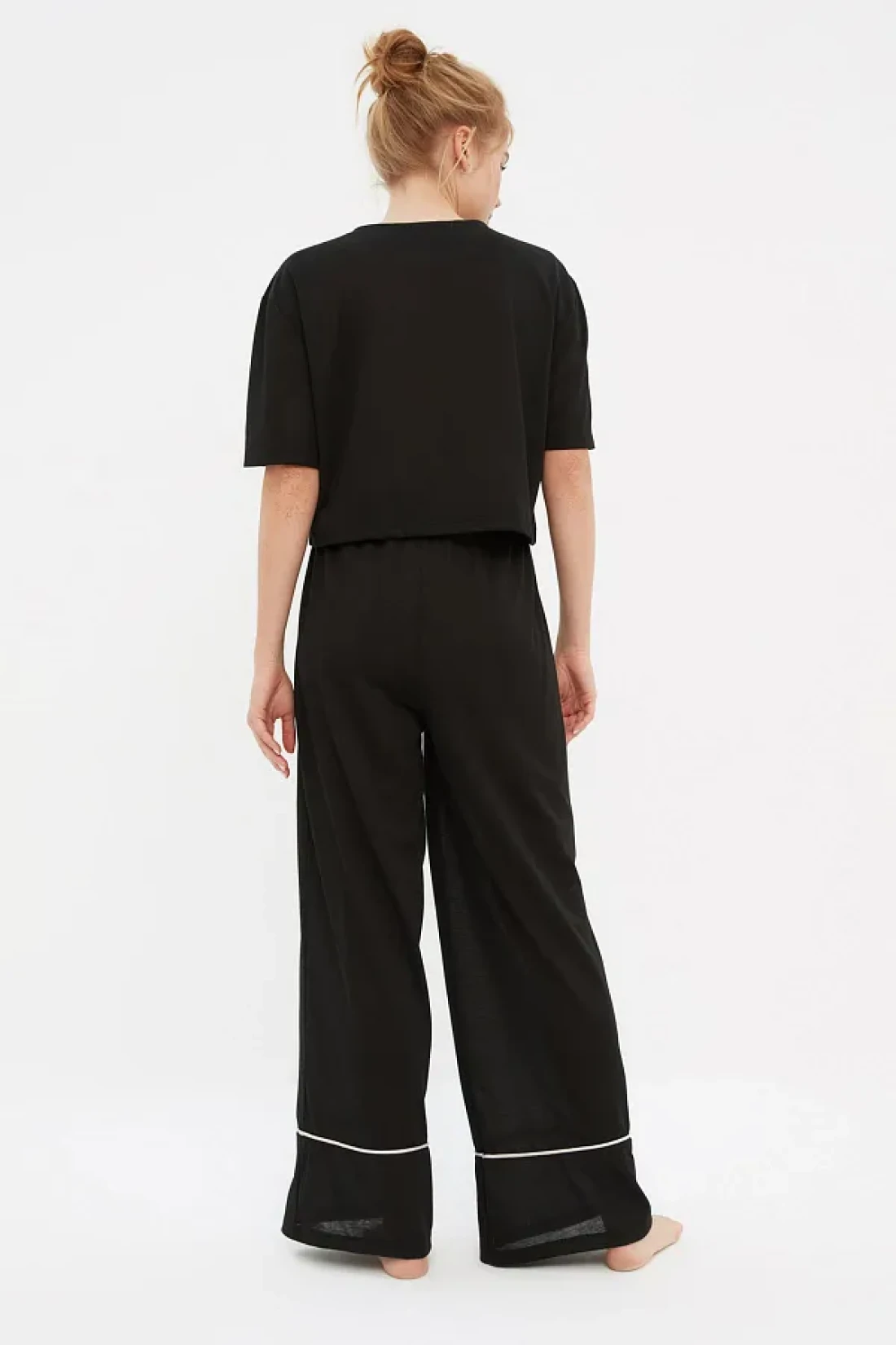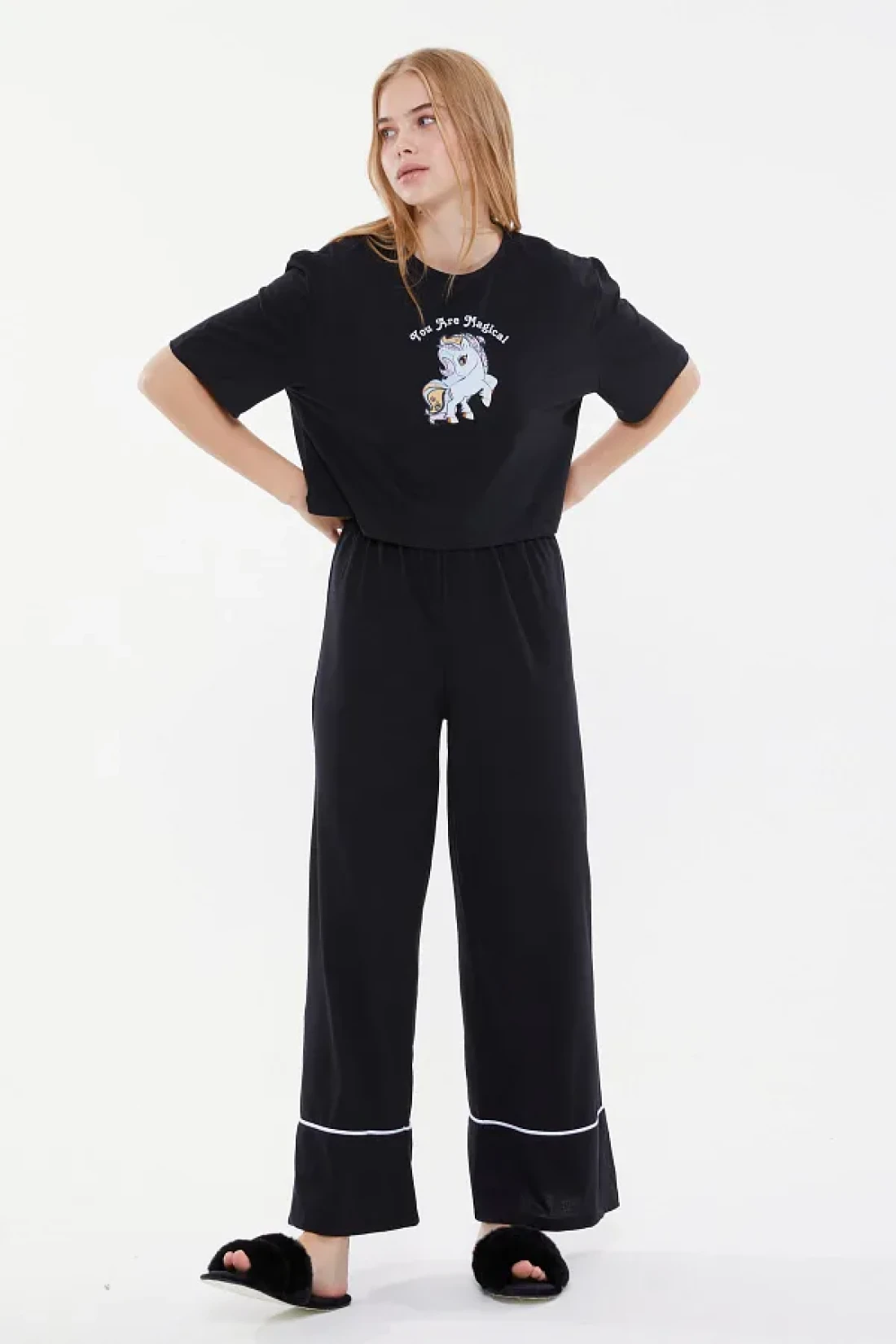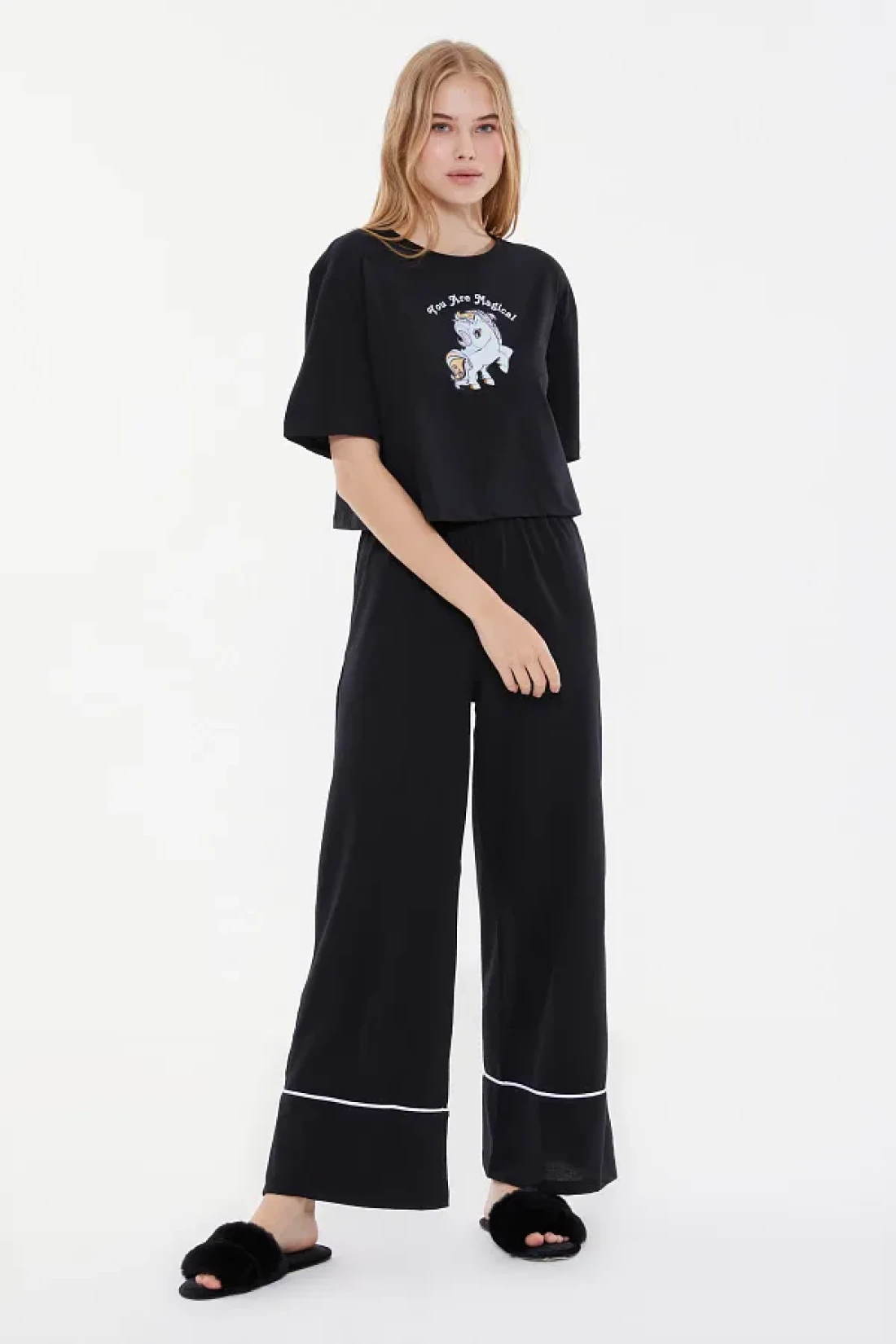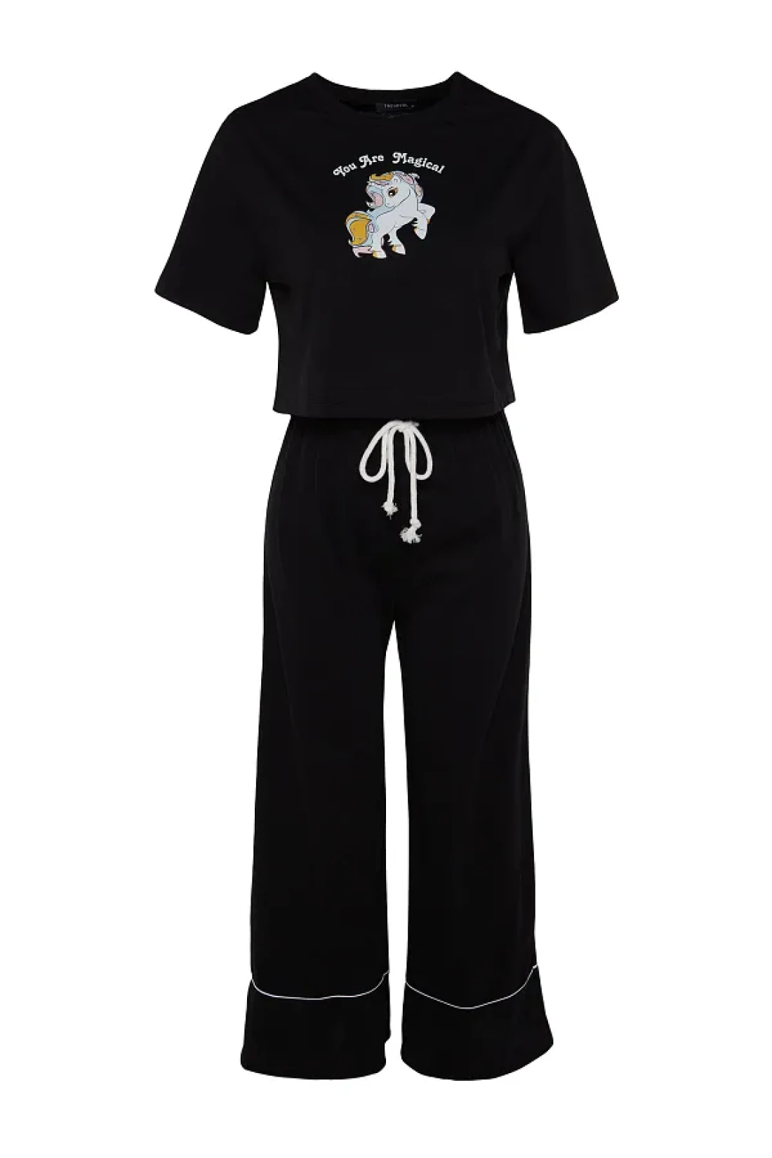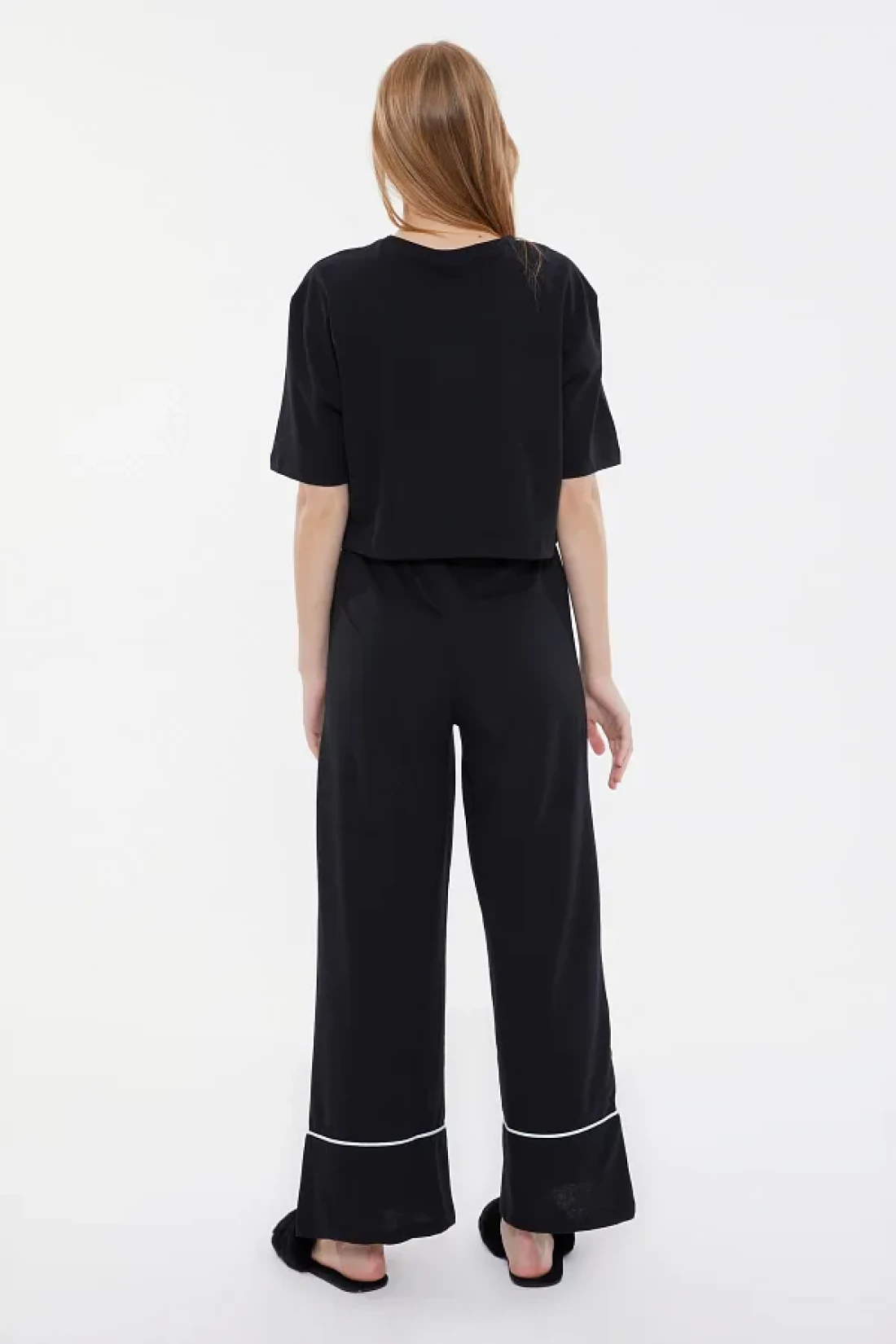 Collection طقم بيجامة محبوكة من القطن الأسود مع تفاصيل الأنابيب المطبوعة الترفيهية THMSS21PT0953