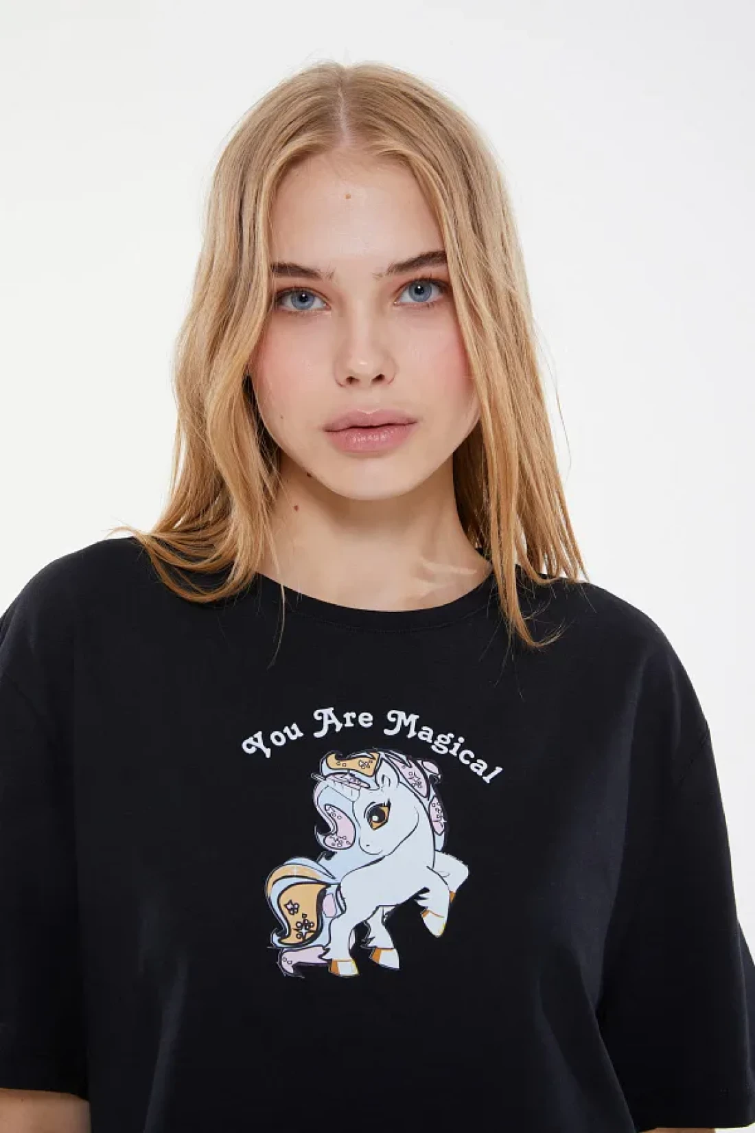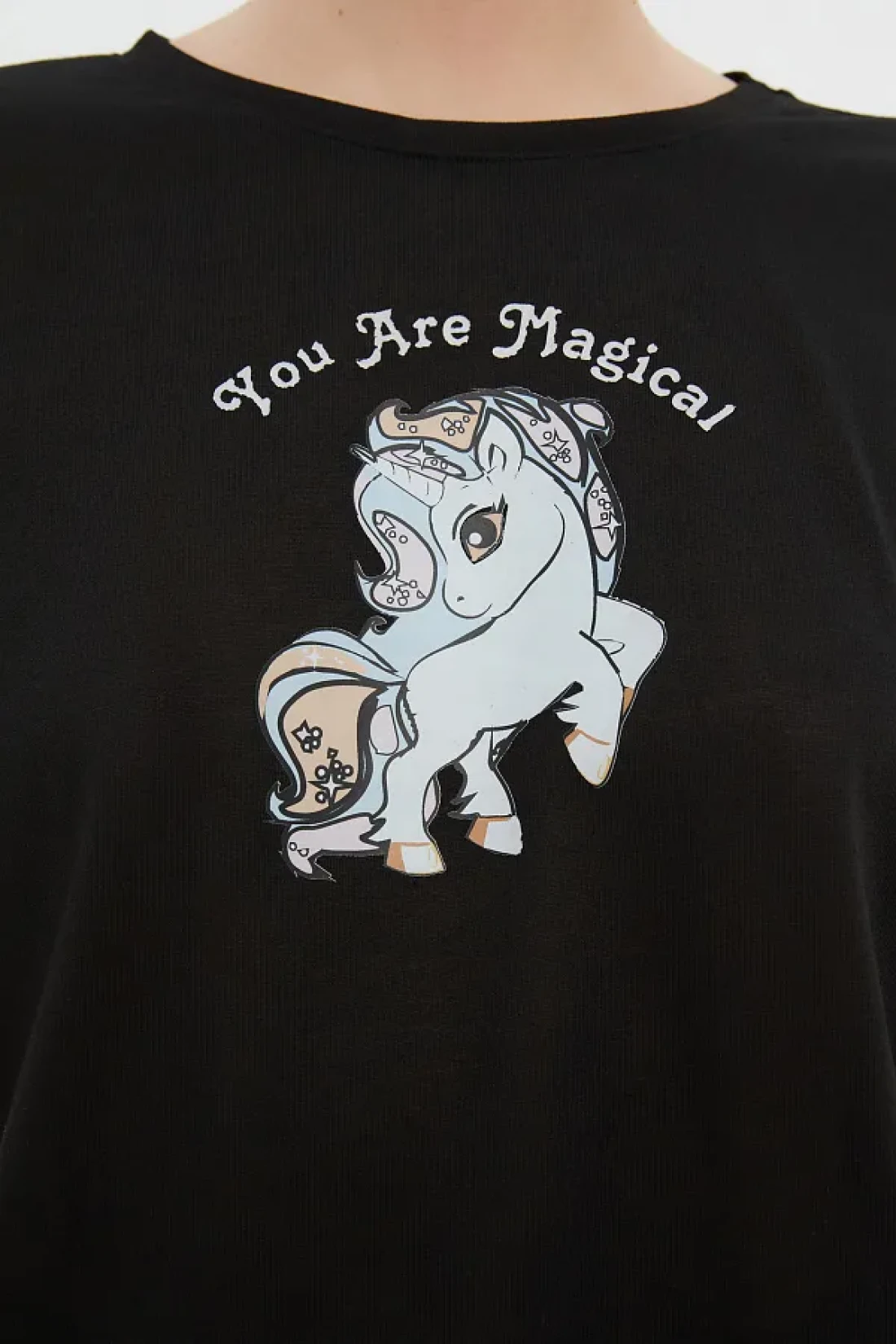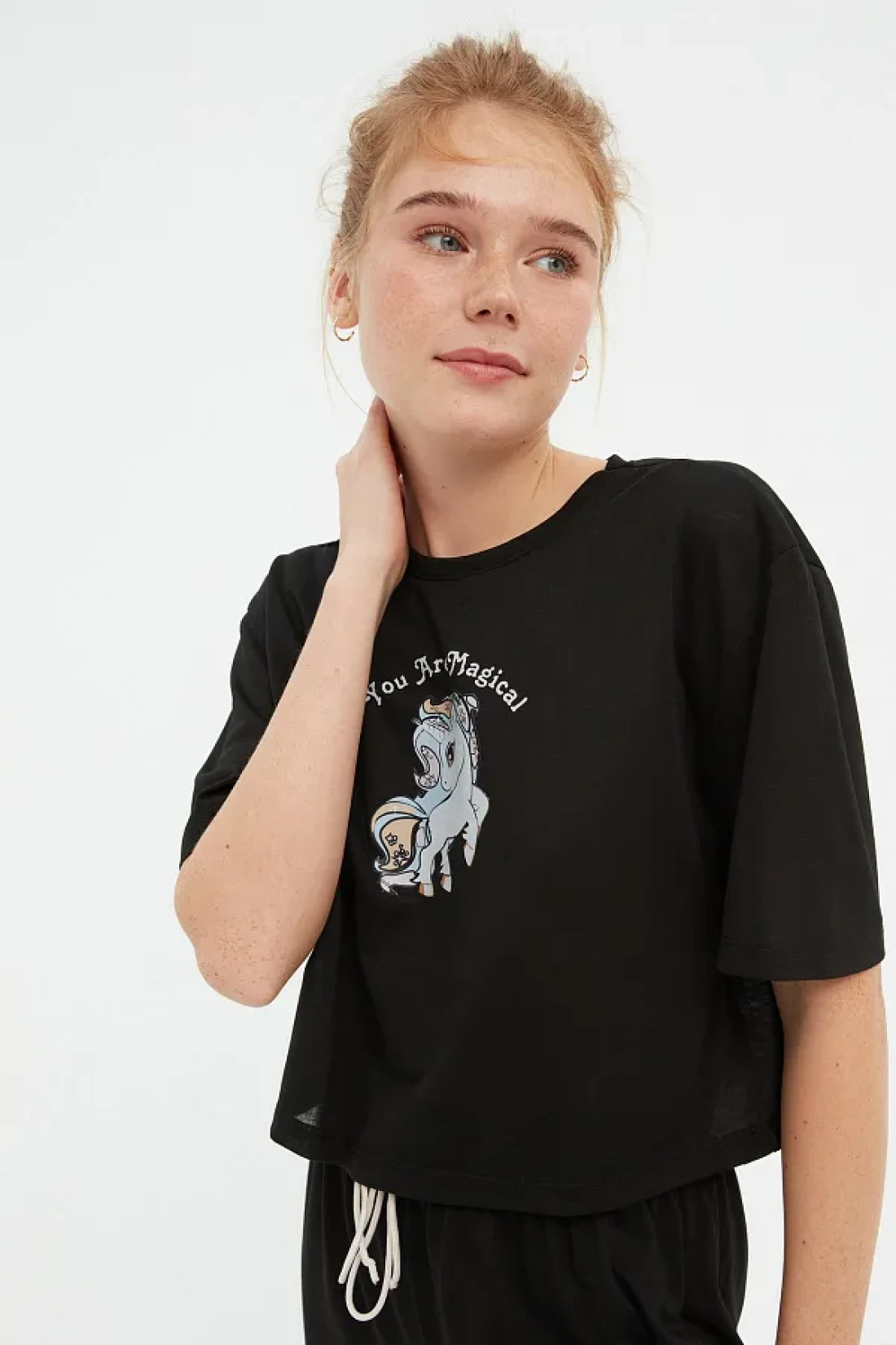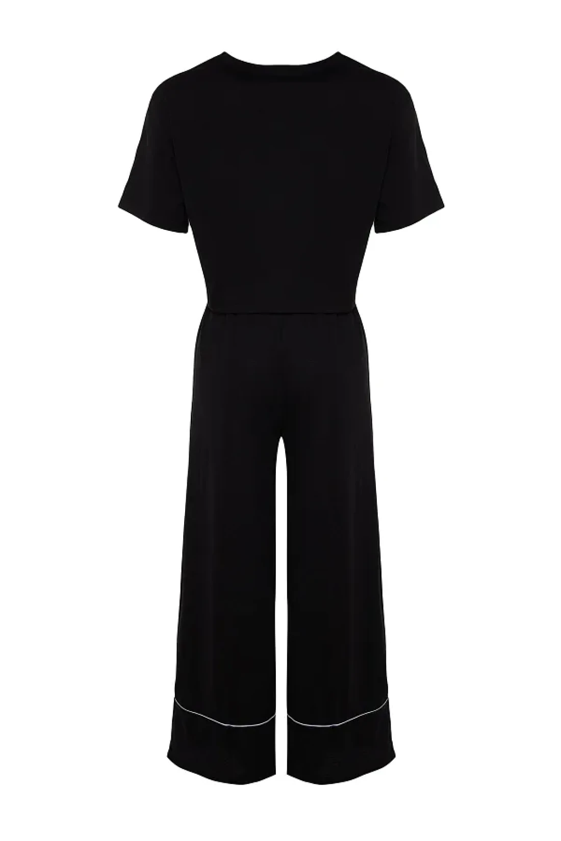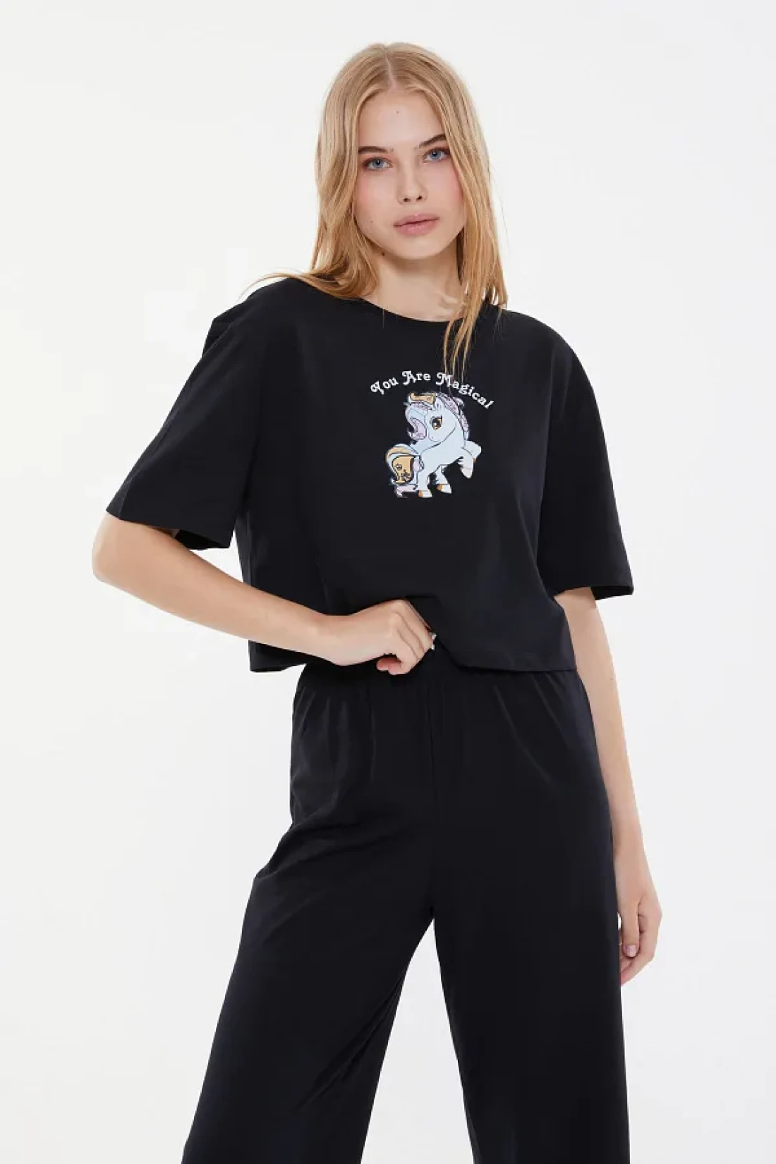 Collection طقم بيجامة محبوكة من القطن الأسود مع تفاصيل الأنابيب المطبوعة الترفيهية THMSS21PT0953