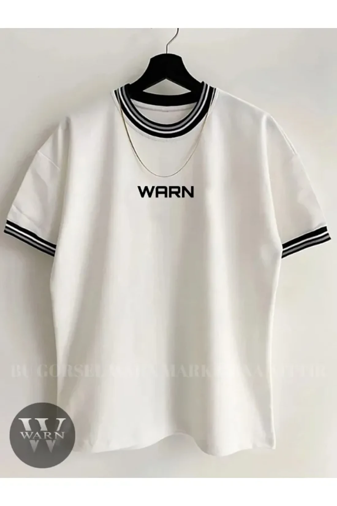 warn تي شيرت صيفي بأكمام مطبوعة وياقة كبيرة الحجم للجنسين بتفاصيل مضلعة باللون الأسود والأبيض