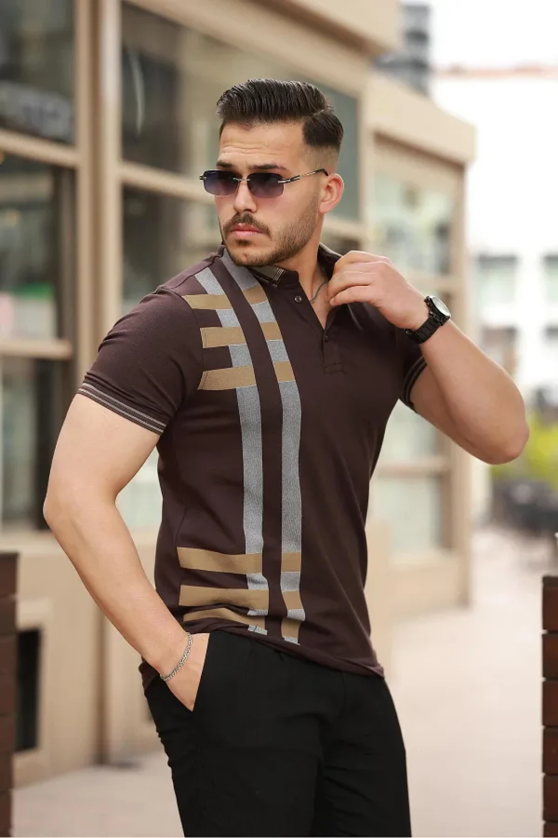 Miron تي شيرت بولو بياقة قصيرة وأكمام قصيرة بطبعة بنية اللون -2519