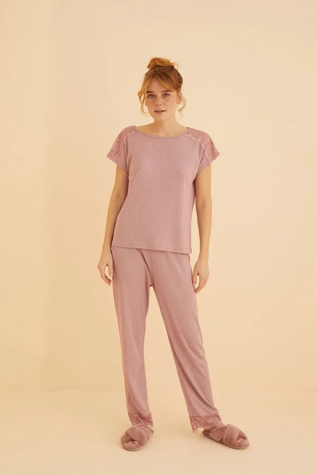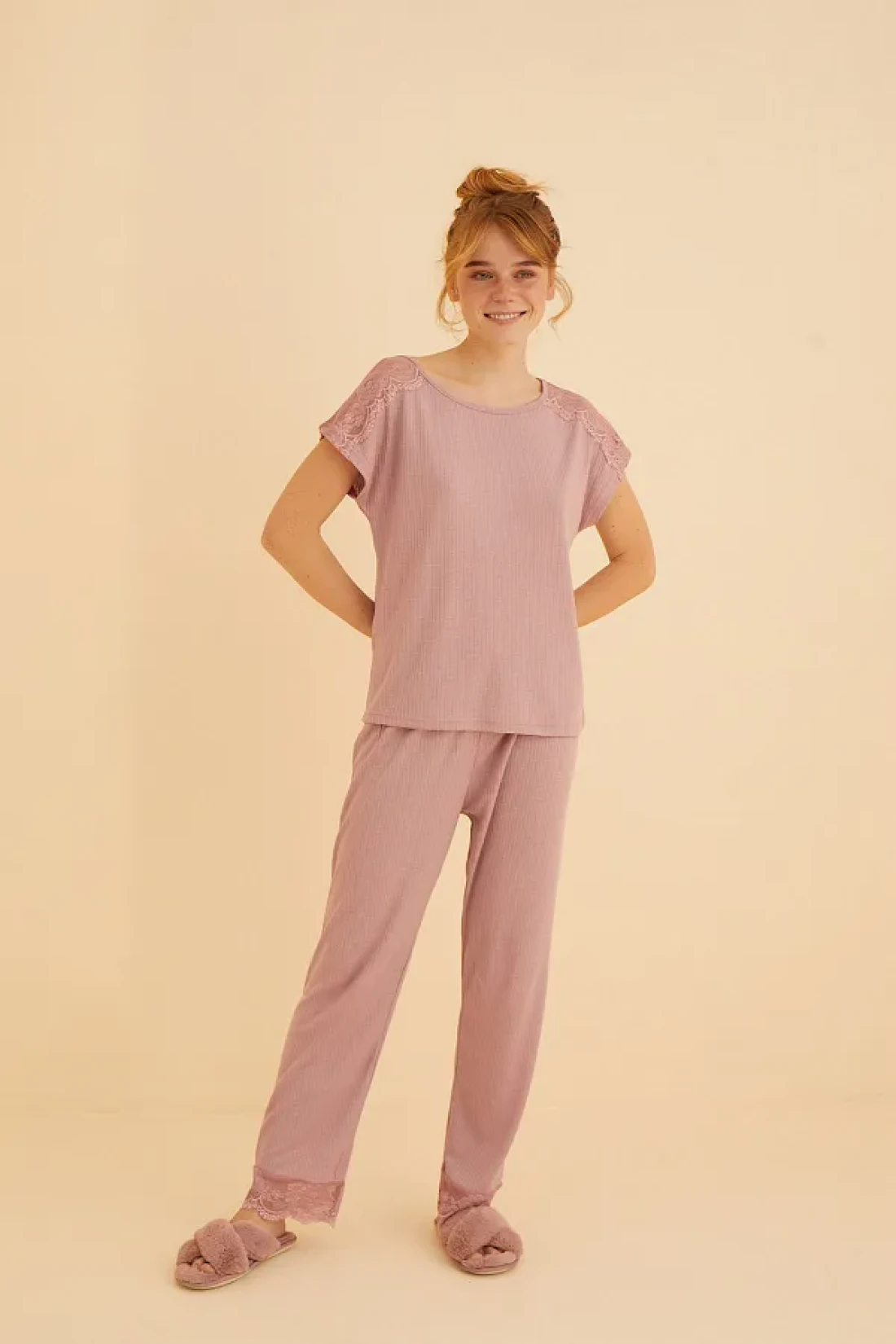 Siyah İnci طقم بيجامة محبوكة ناعمة الملمس مع تفاصيل دانتيل أرجواني