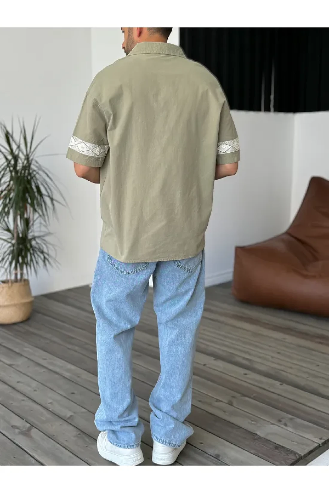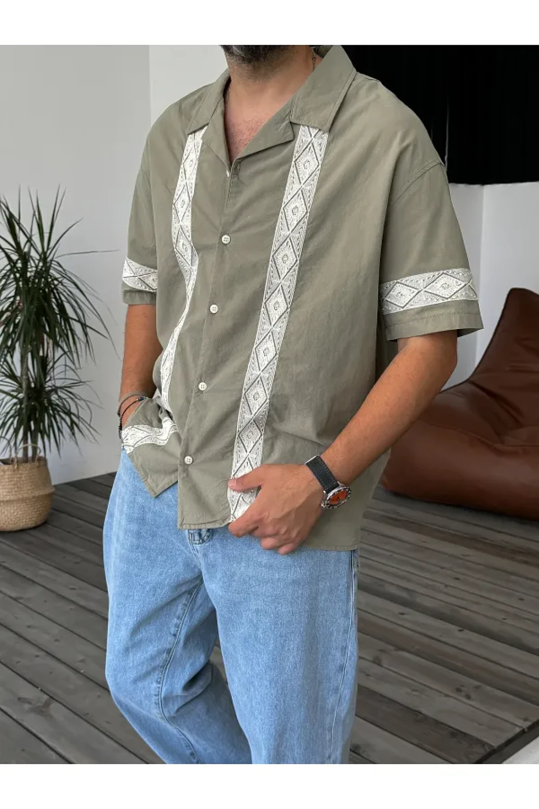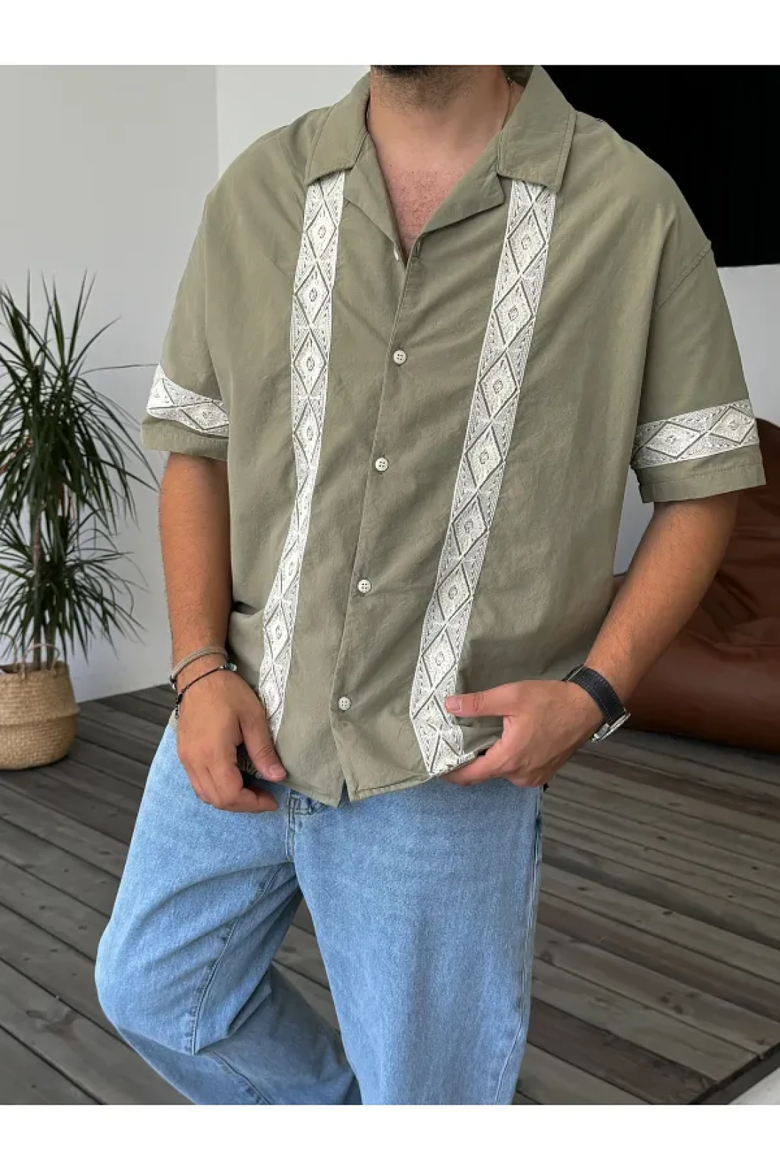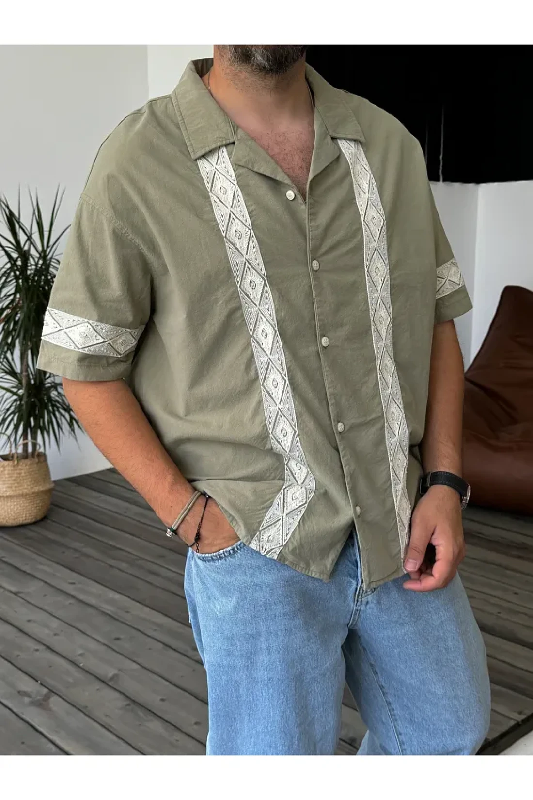 BYBASICMAN قميص كاكي مطرز بالدانتيل بأكمام قصيرة V-847