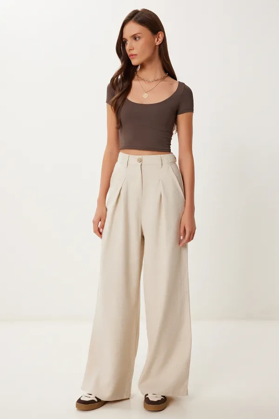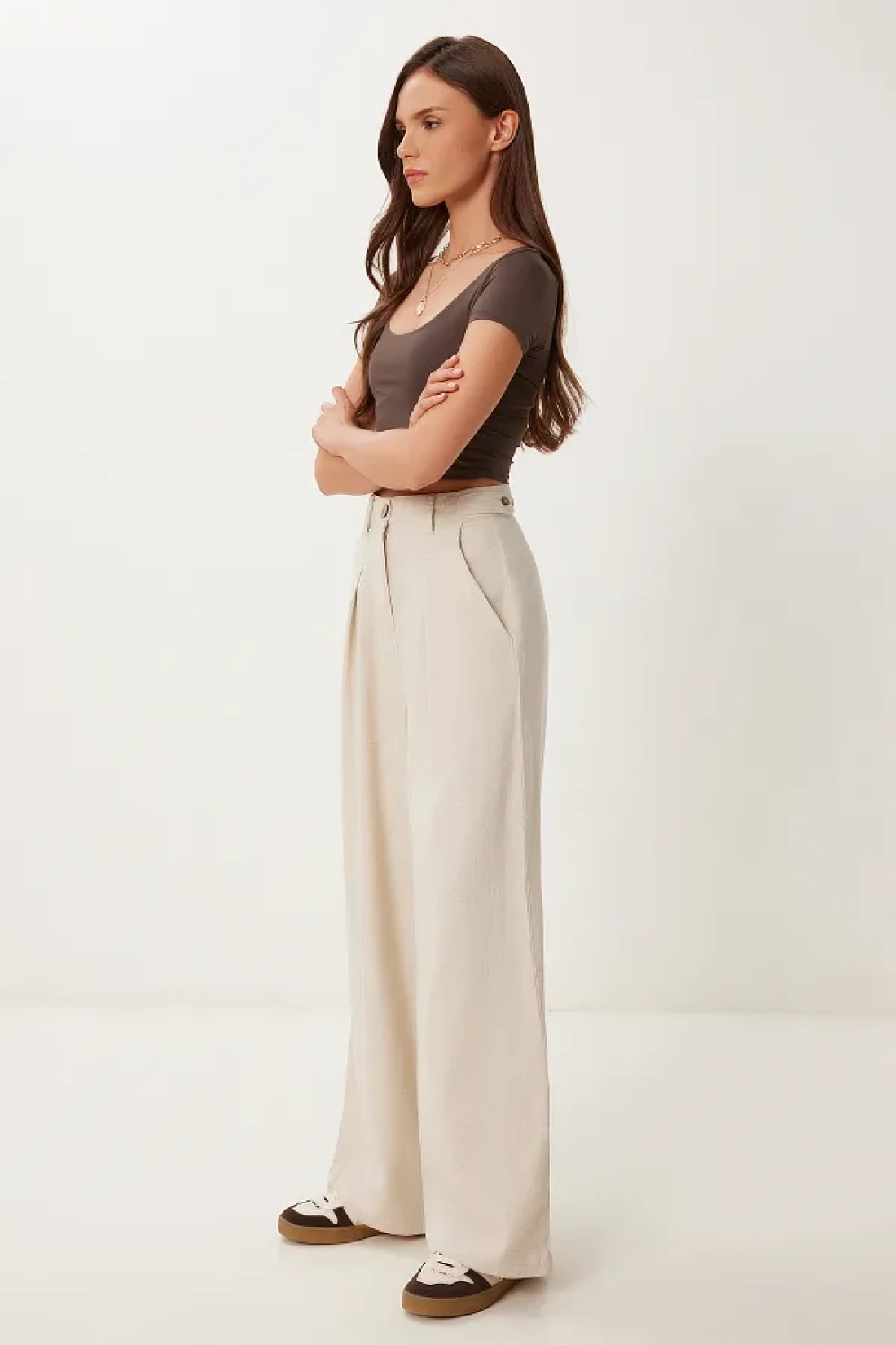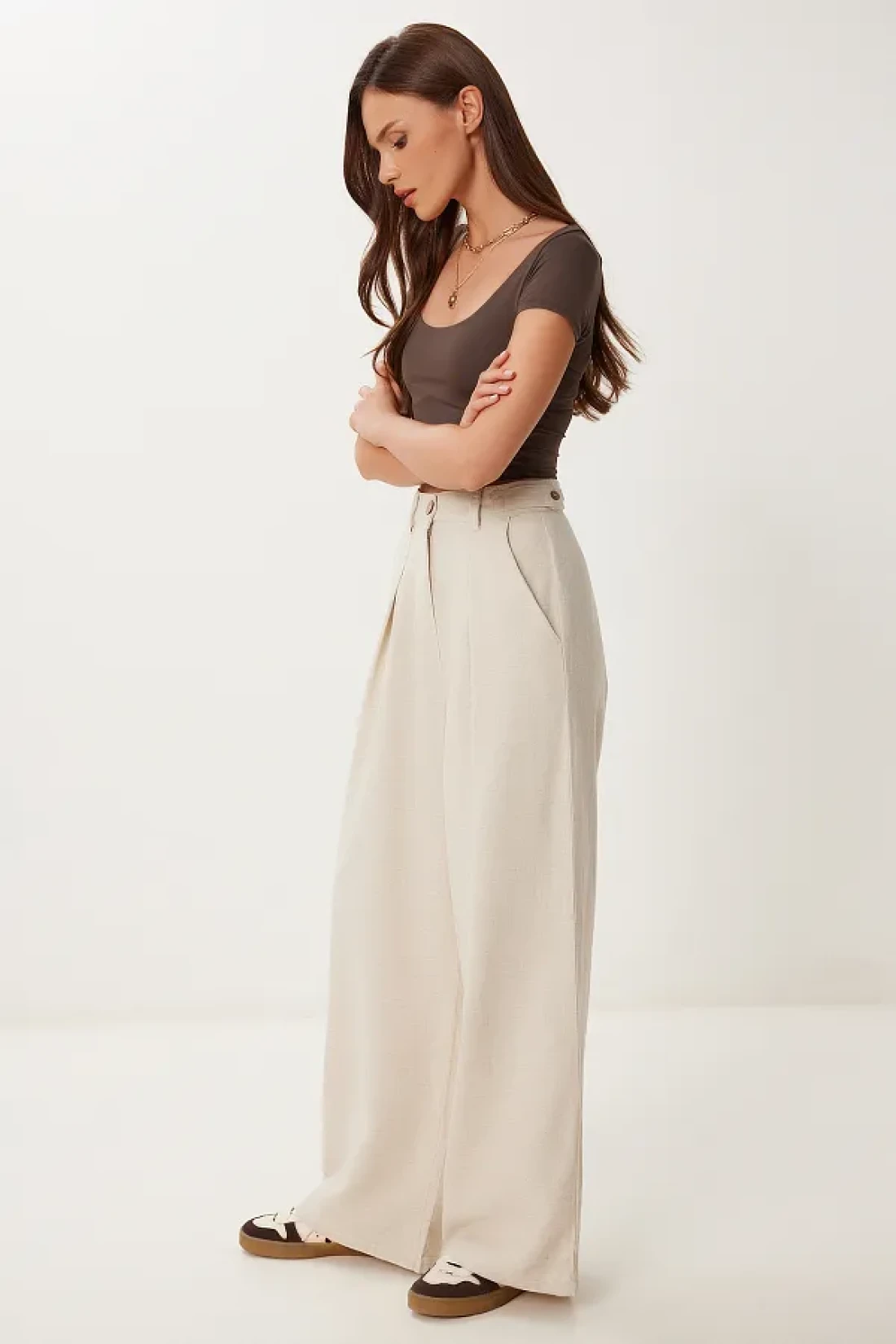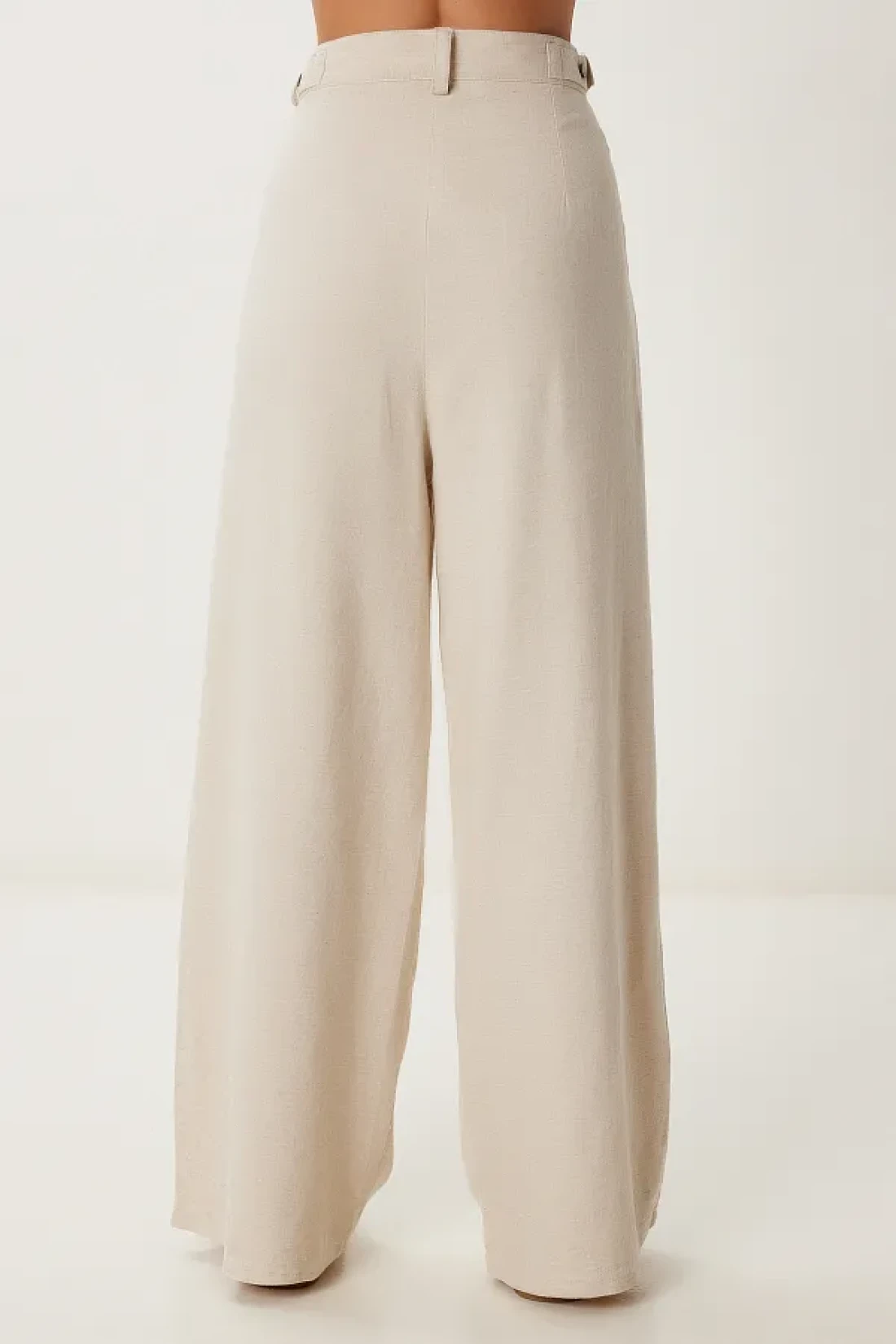 Happiness İstanbul بنطال نسائي واسع الساق من الكتان الكريمي المخلوط MX00211