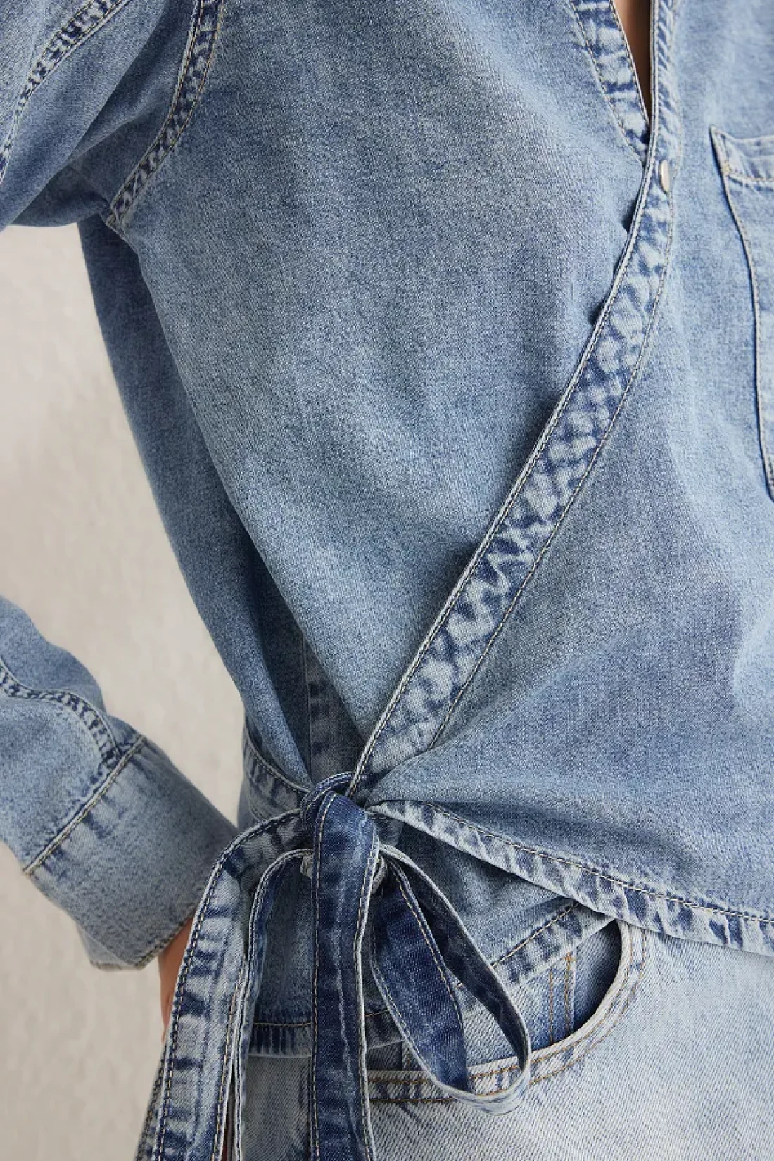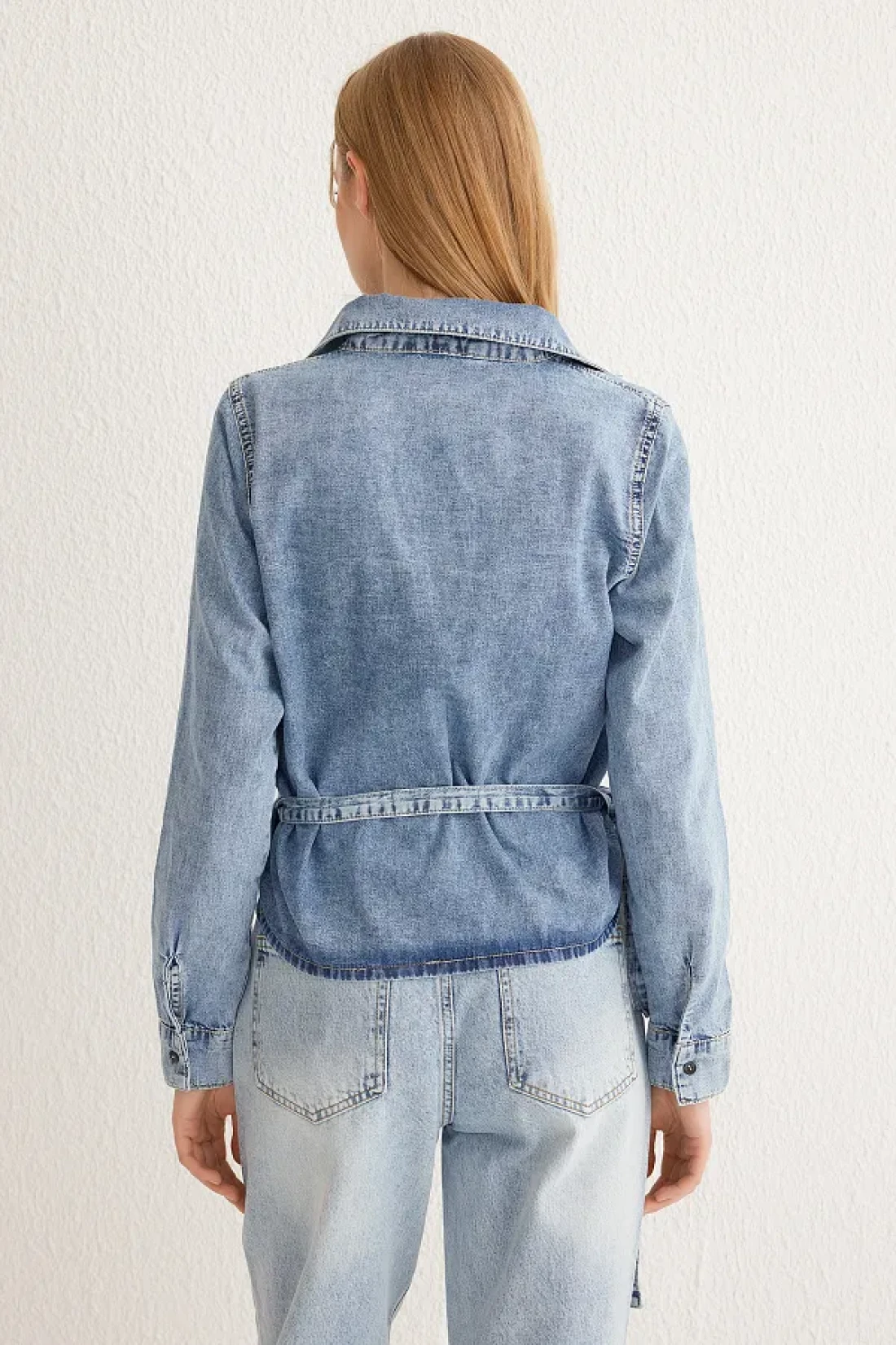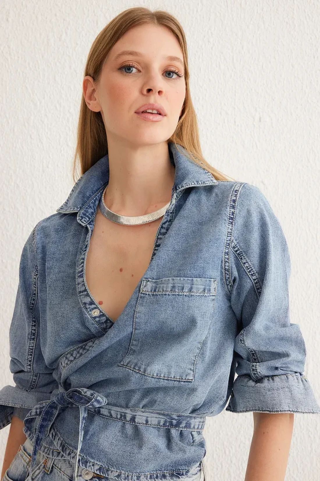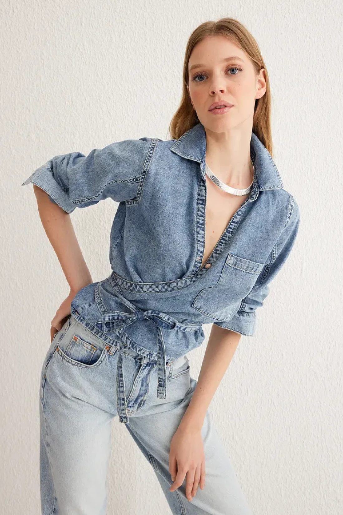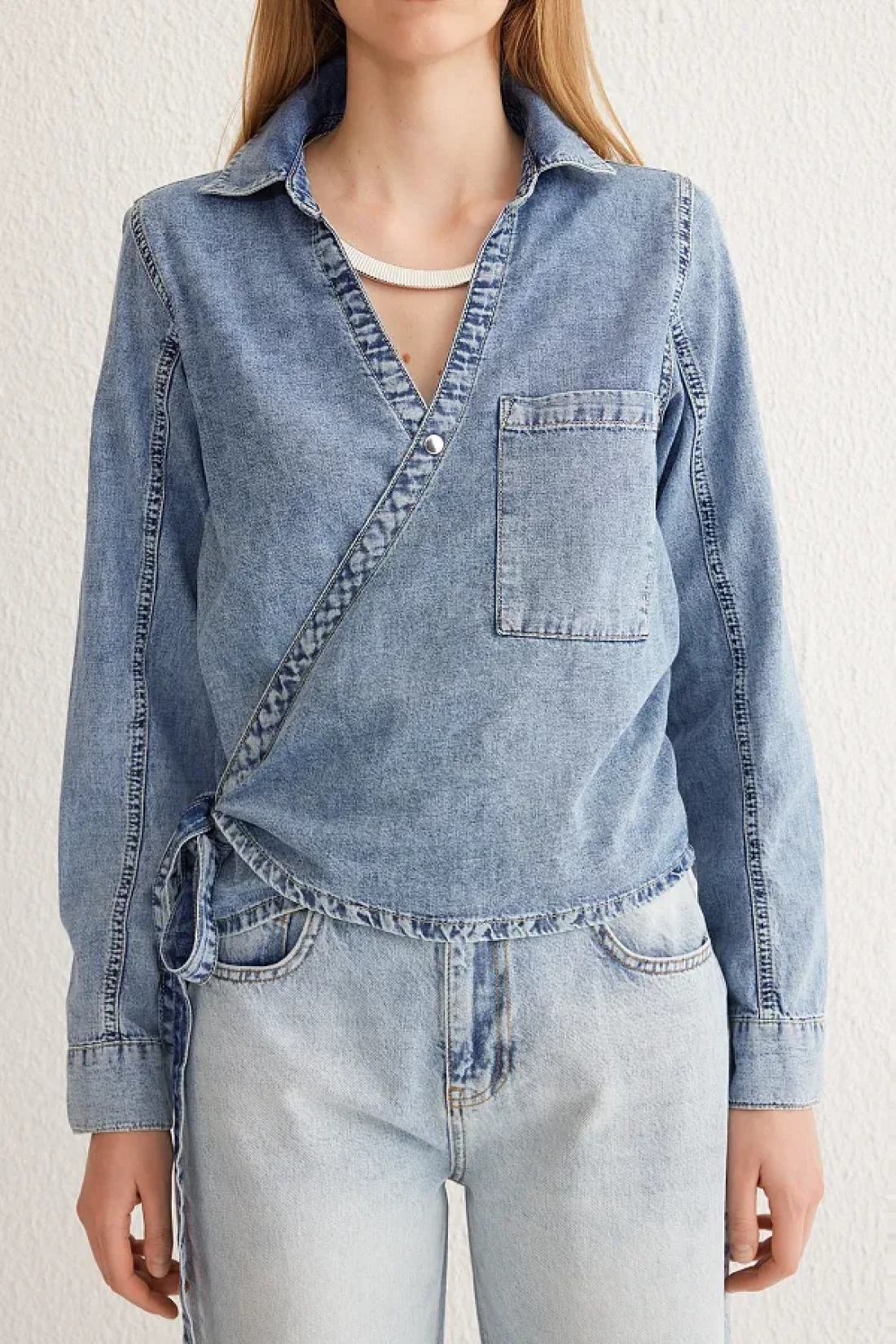 Collection قميص أزرق مزدوج الصدر من قماش الدنيم TWOSS25GO00023