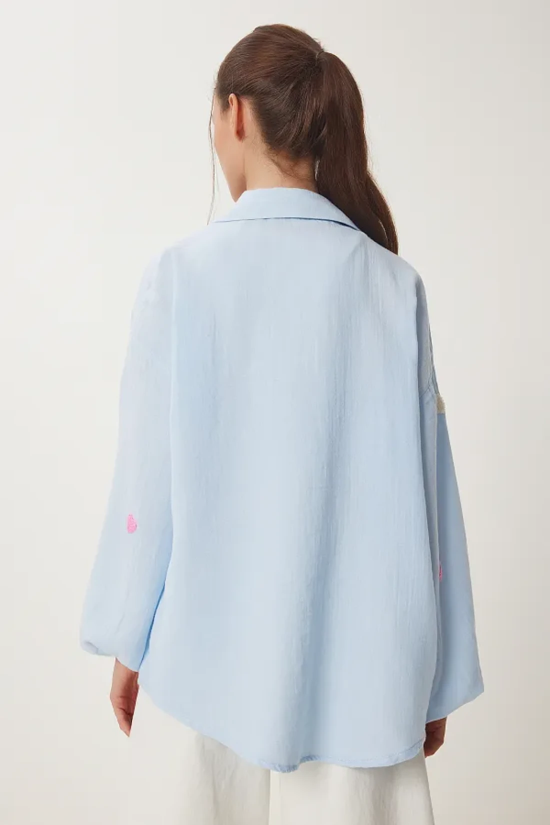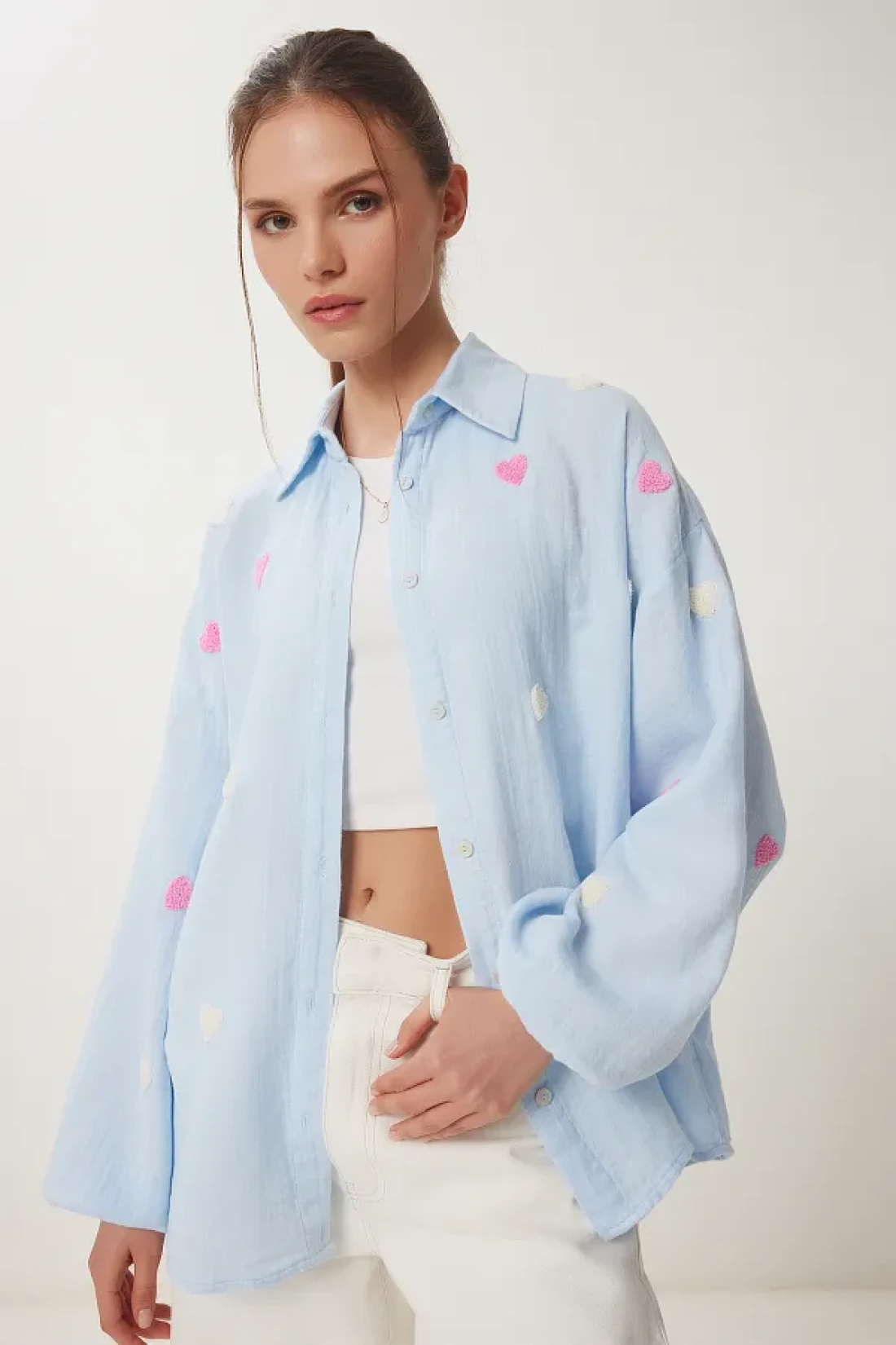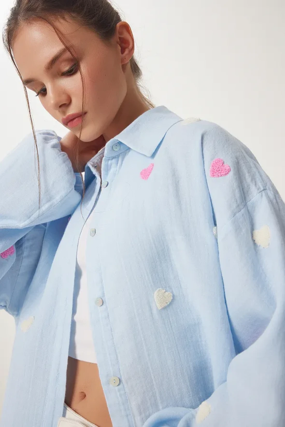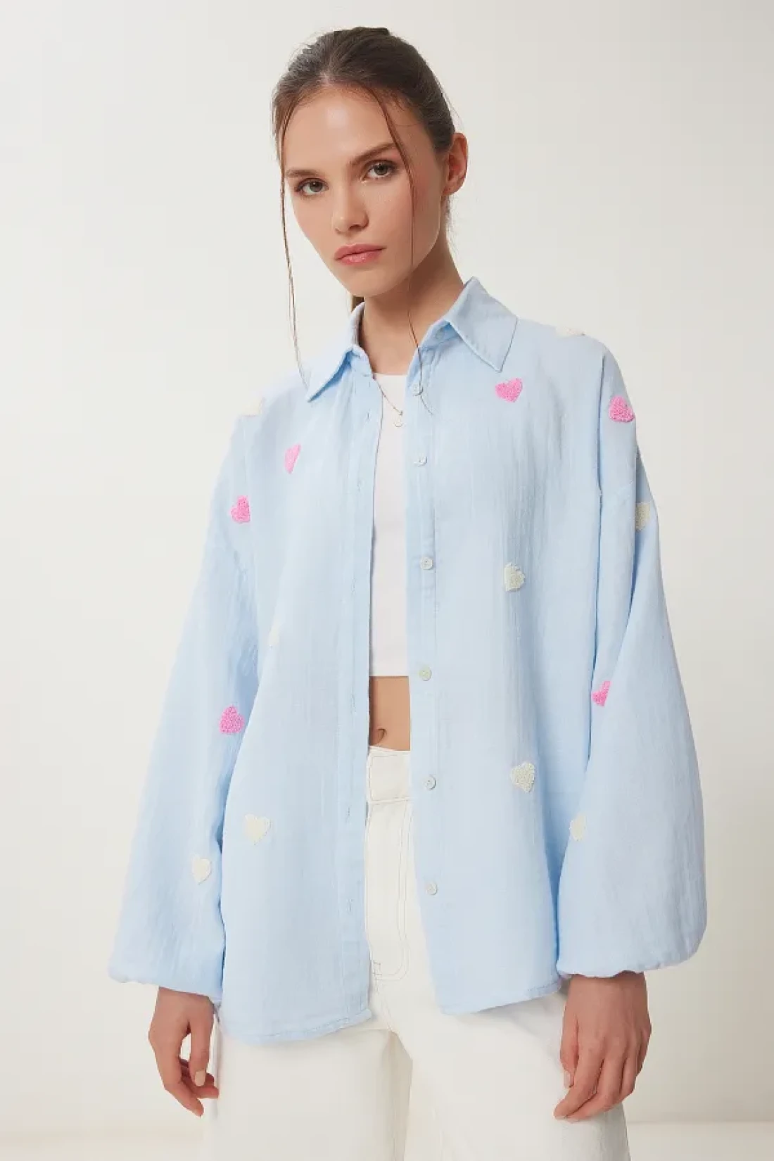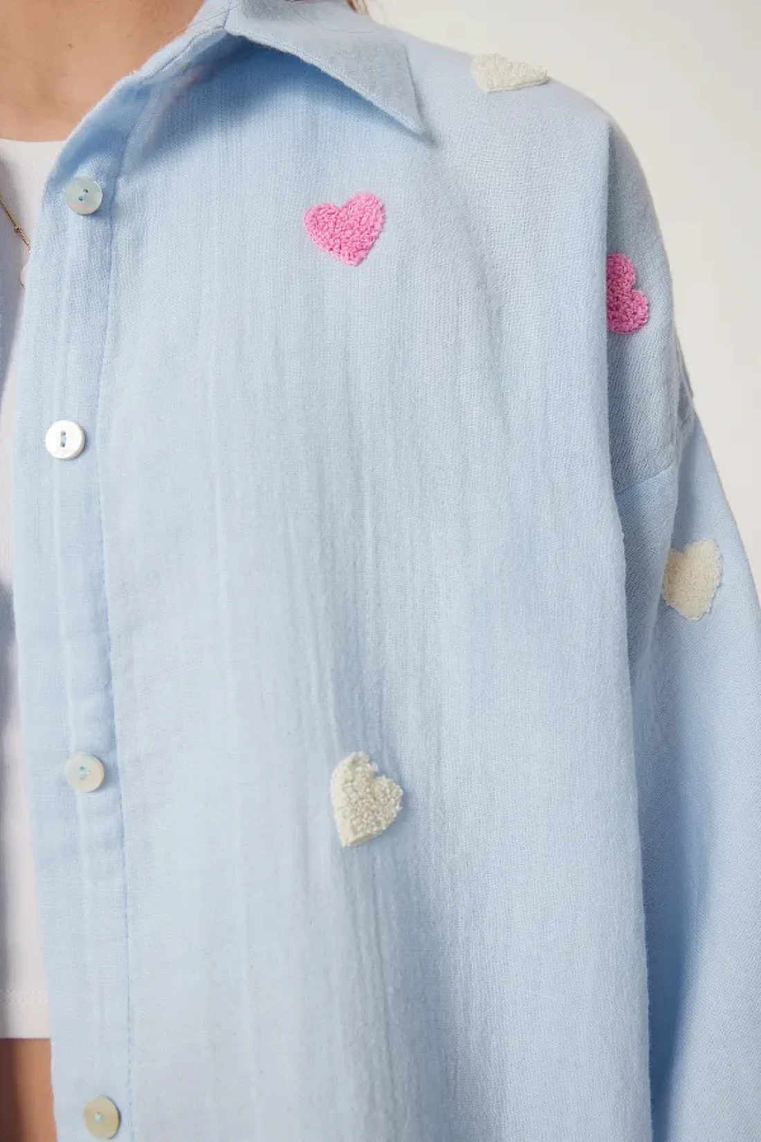 Happiness İstanbul قميص موسلين كبير الحجم مزخرف بقلب أزرق سماوي للسيدات PX00002