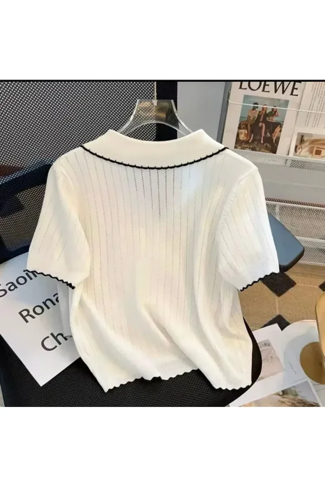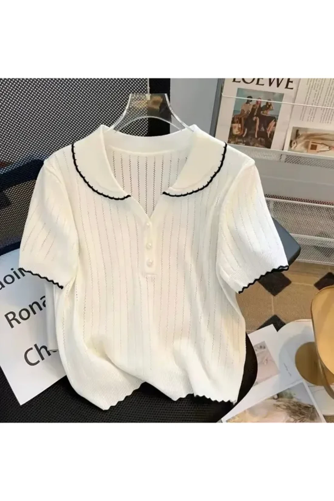 Elysira تي شيرت نسائي منسوج أساسي مطرز بياقة الطفل