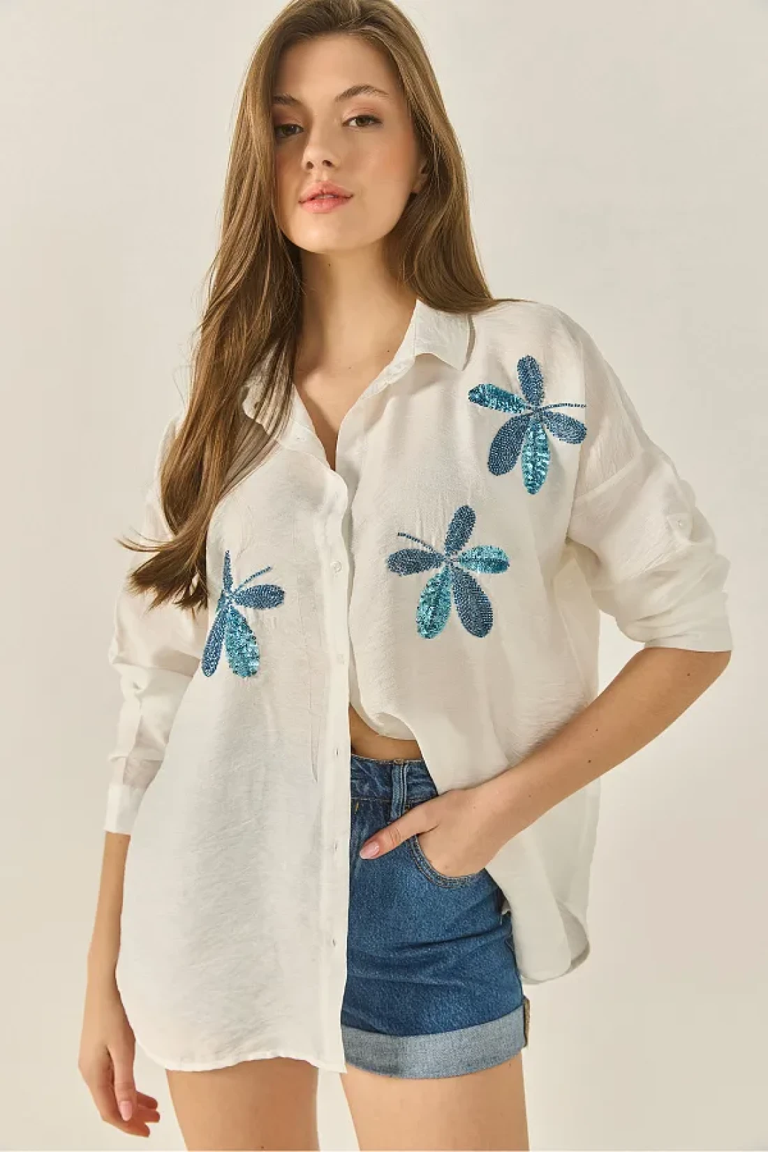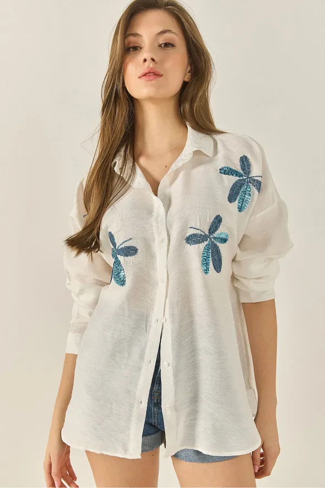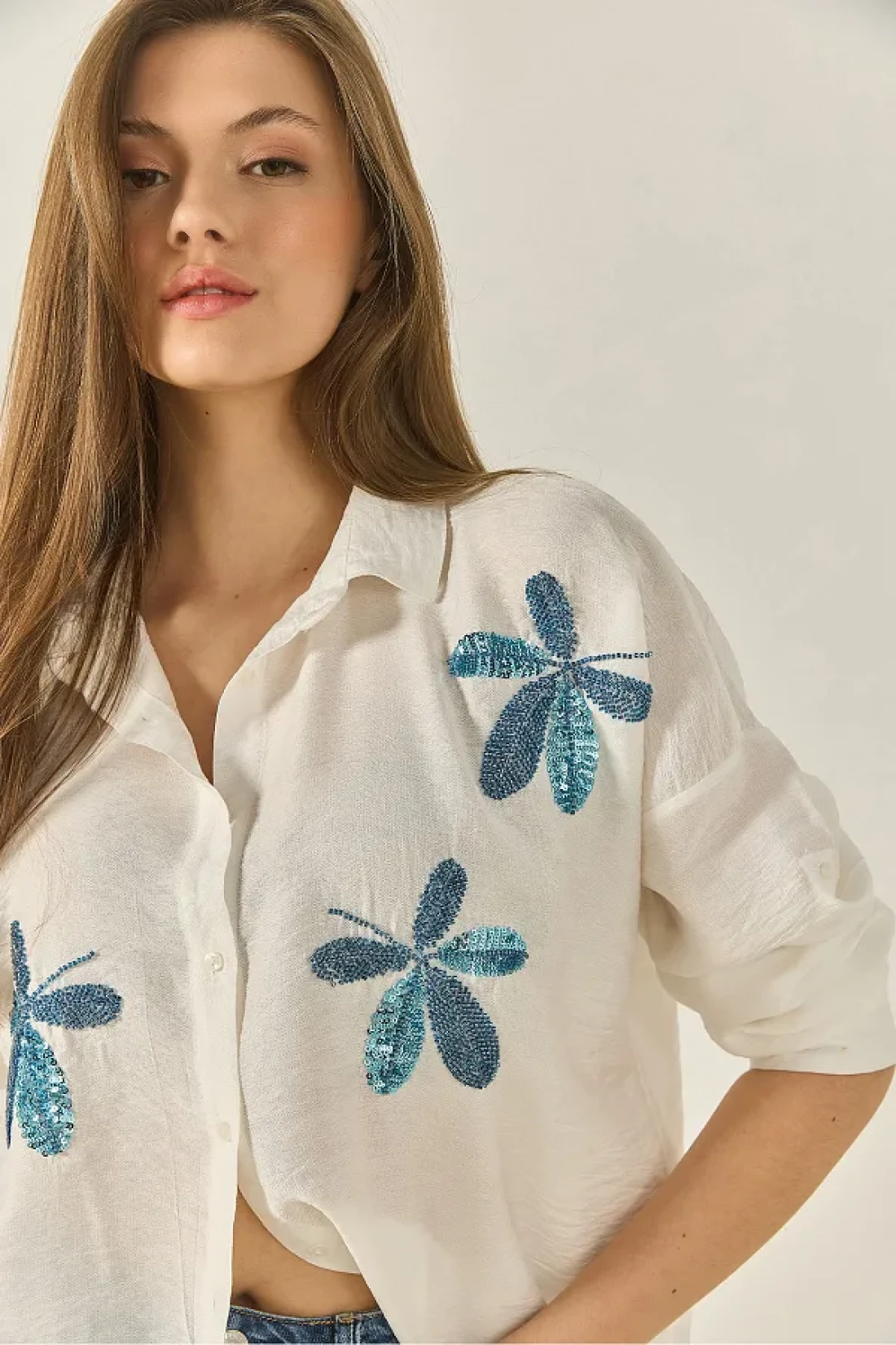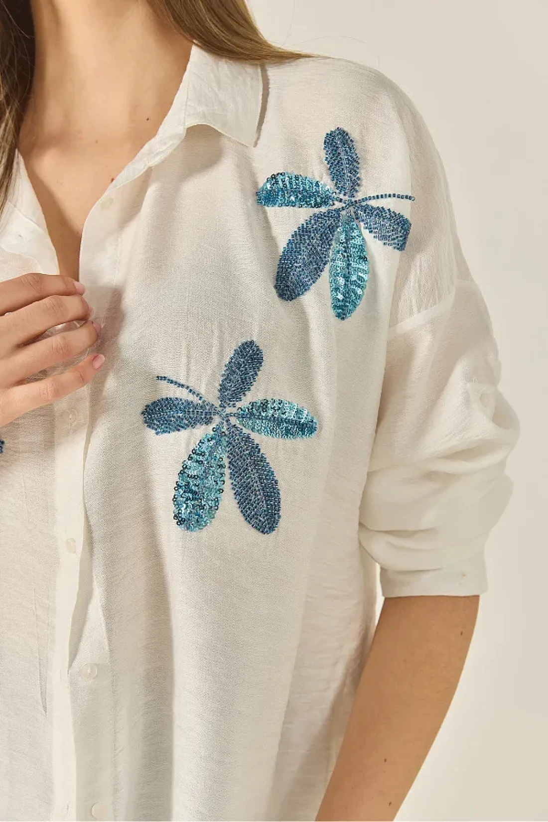 Bianco Lucci قميص Aerobin كبير الحجم مطرز بخرز أوراق الشجر للسيدات 60283024