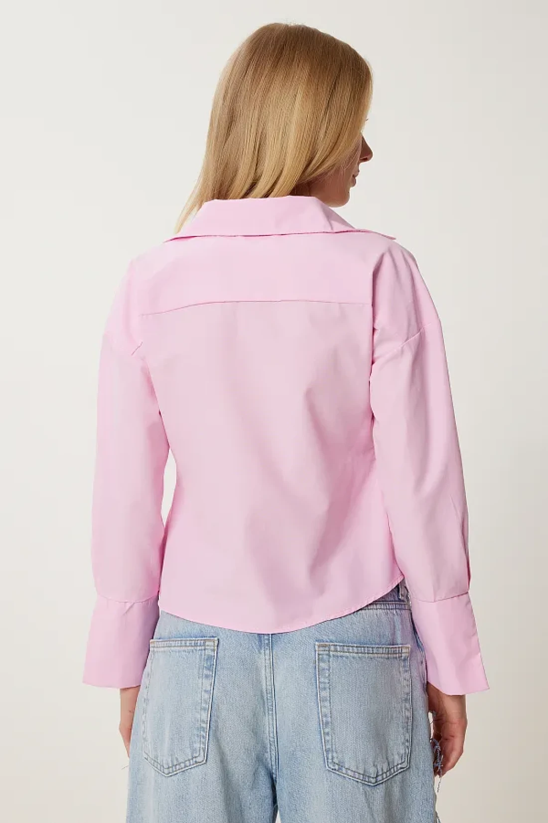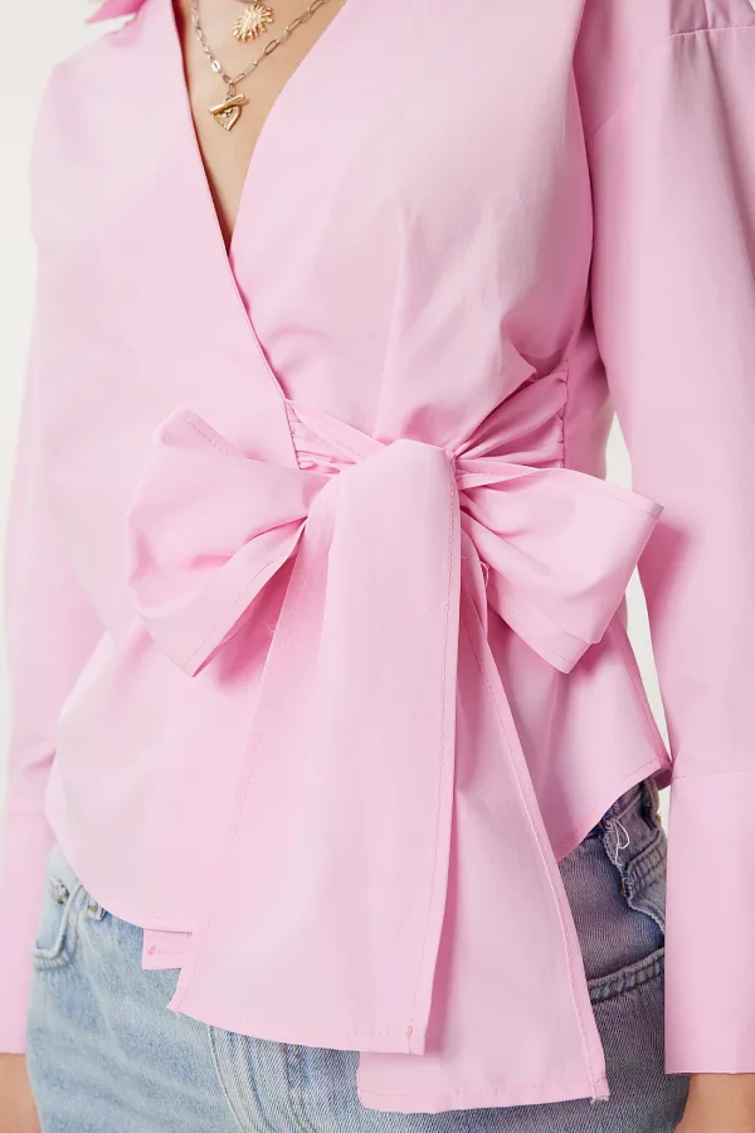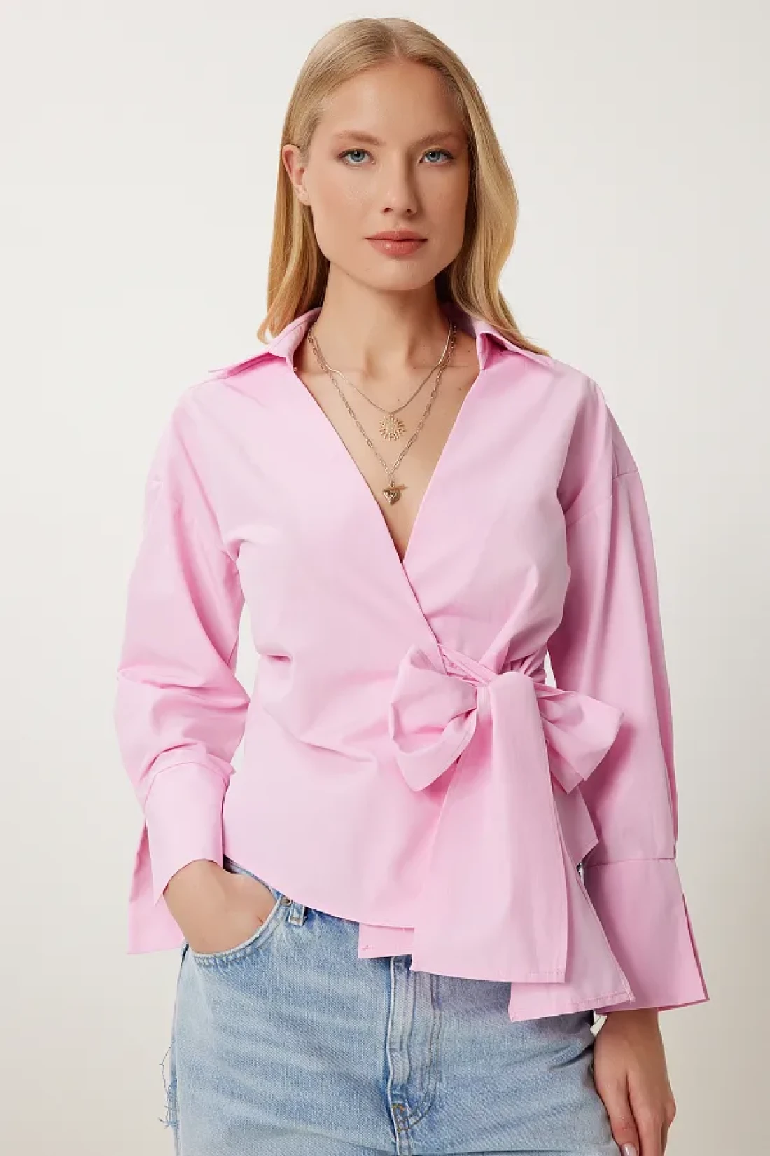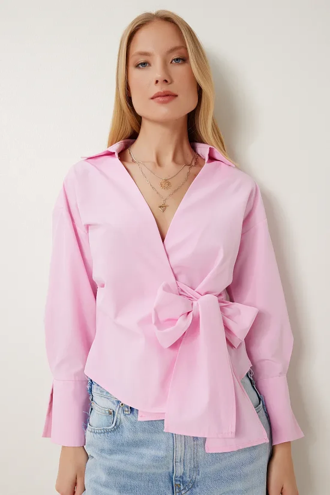 Lovelyİstanbul بلوزة بياقة قميص ملفوفة من البوبلين باللون الوردي LDP0046