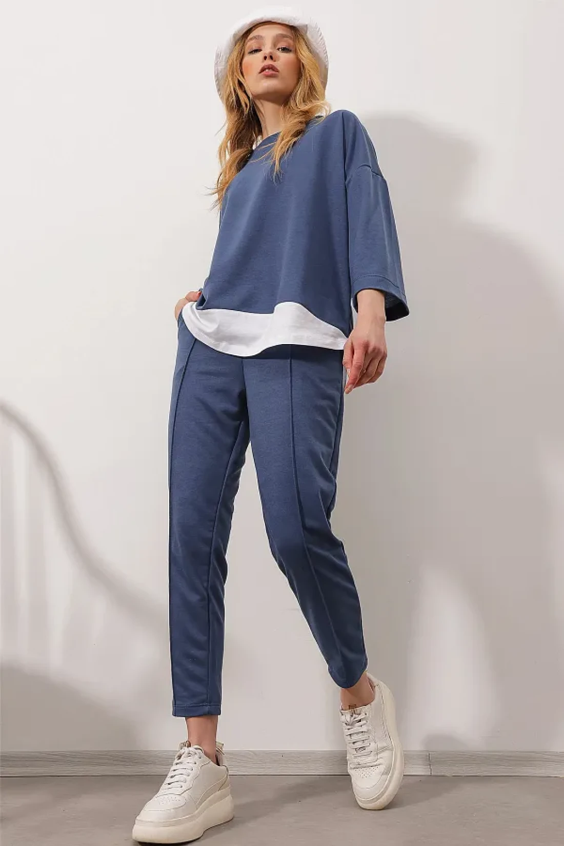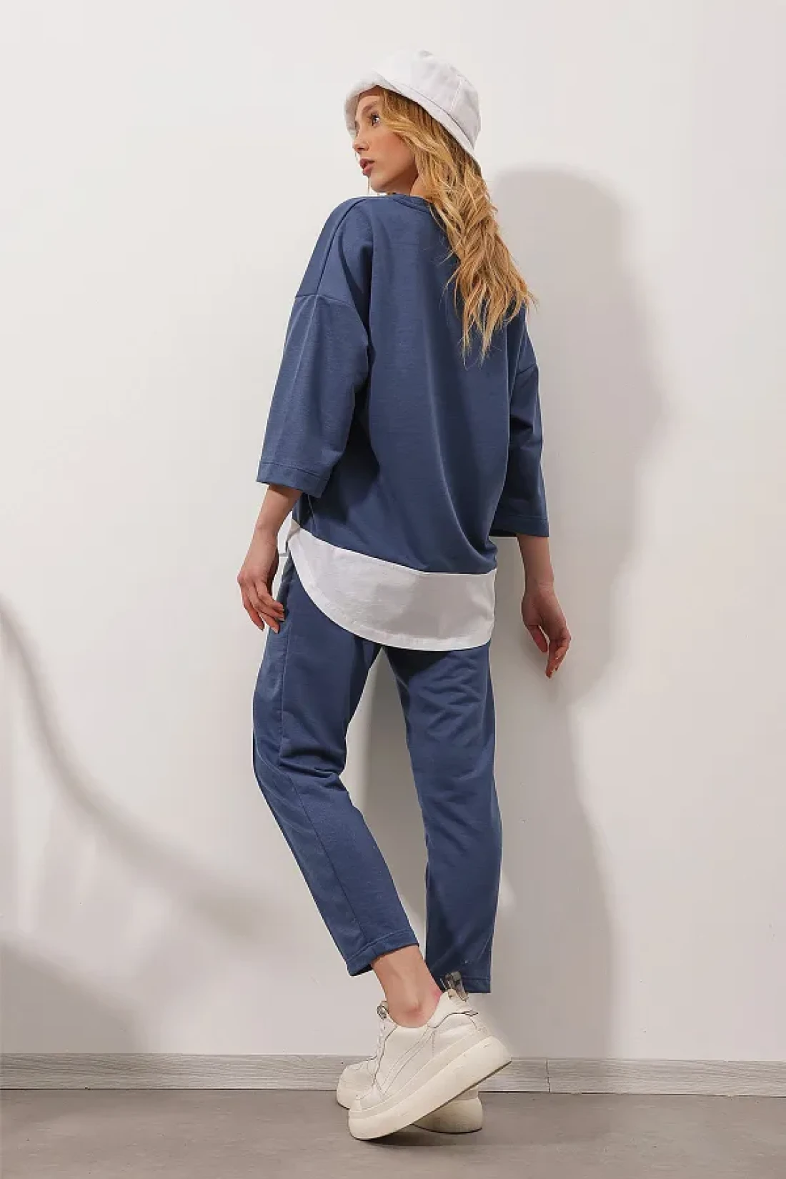Trend Alaçatı Stili طقم نسائي أزرق بياقة واسعة وخصر مطاطي وجيب مزدوج وخياطة أمامية وخيطين من الأسفل ALC-X8175