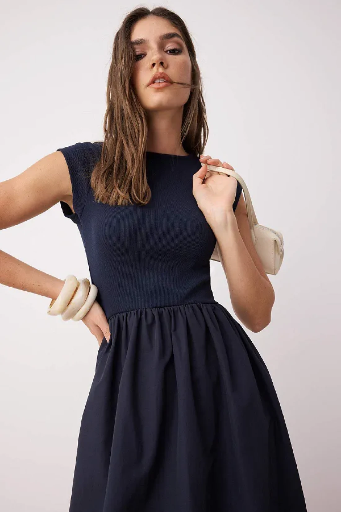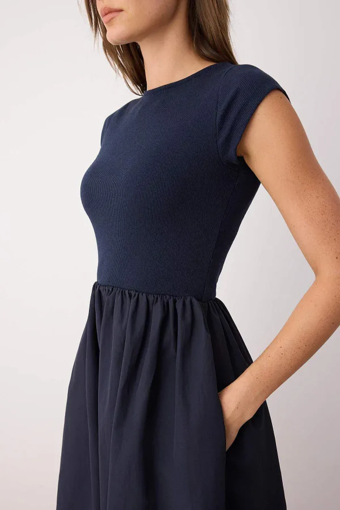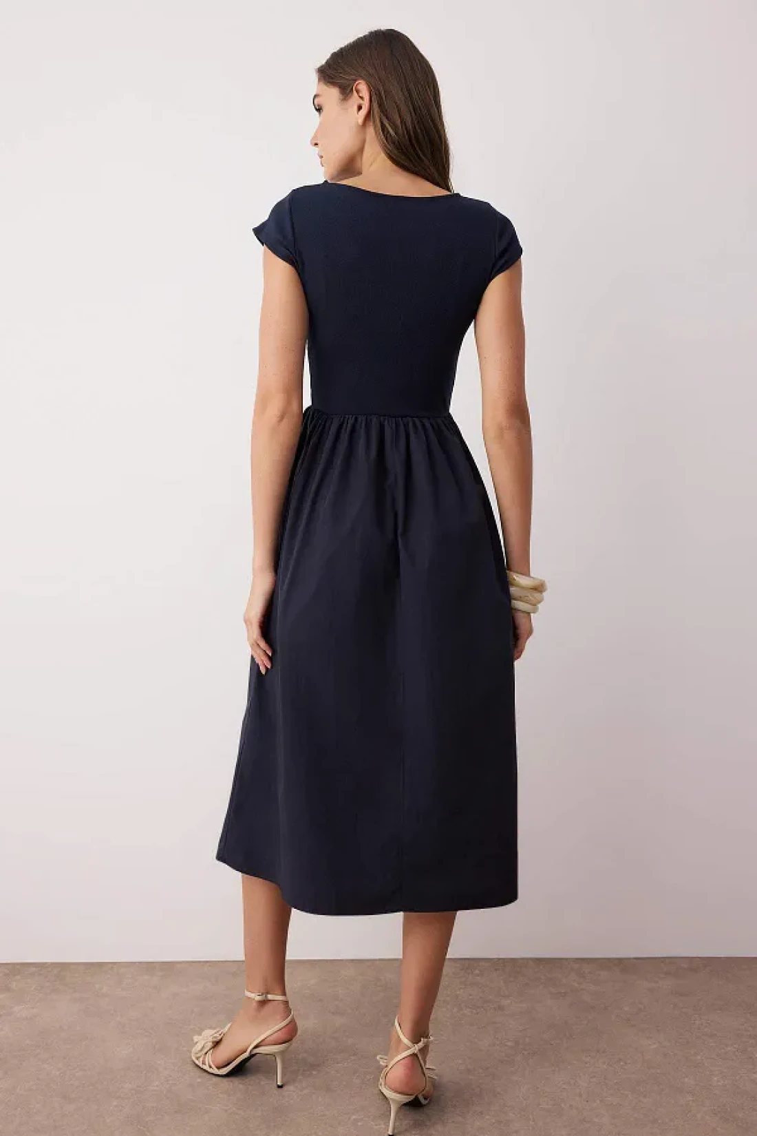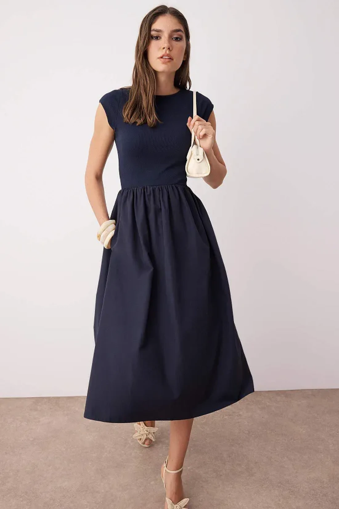 Collection فستان منسوج من القطن المقاوم للماء باللون الأزرق الداكن مع جزء سفلي واسع من القطن المقاوم للماء TWOSS25EL00873