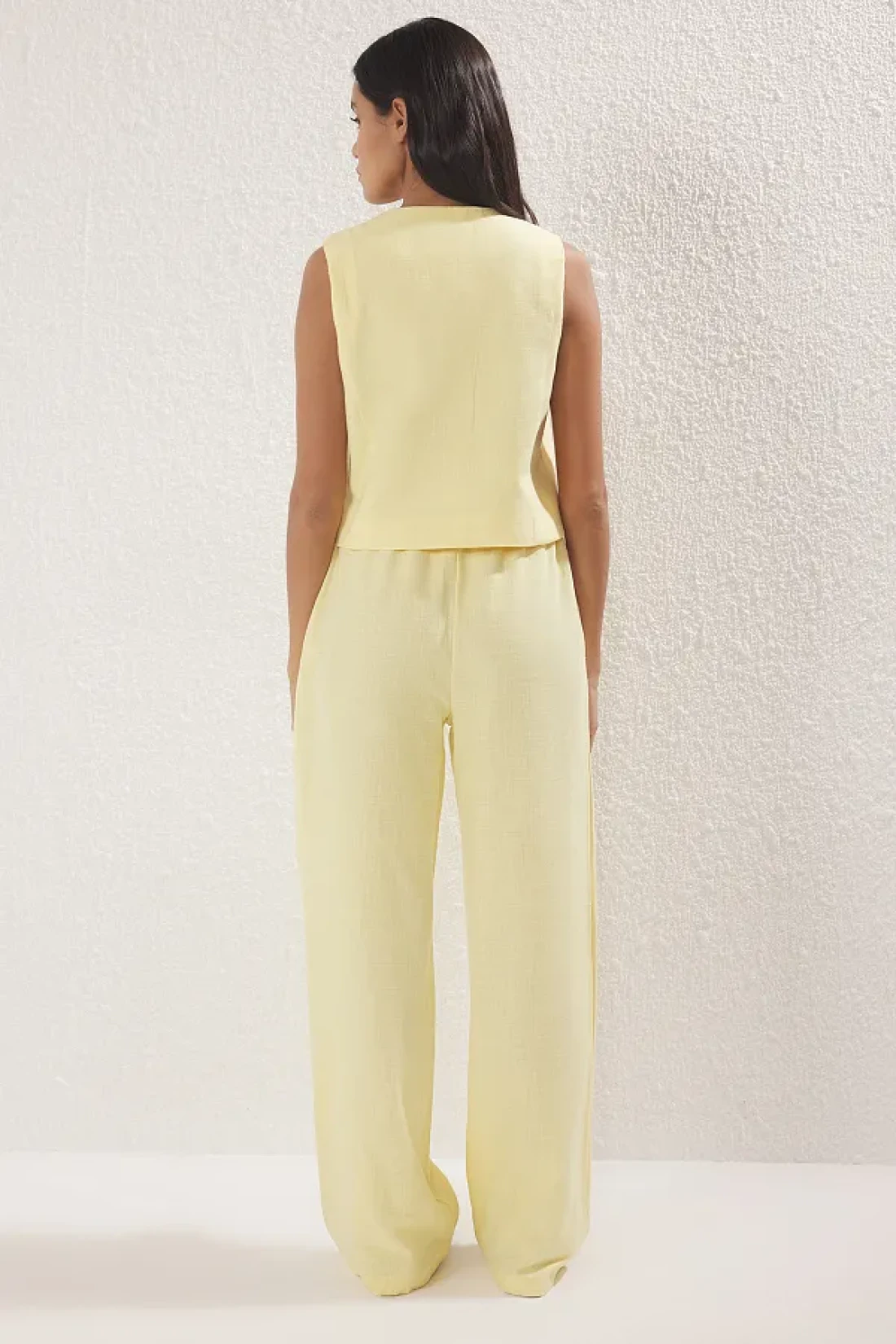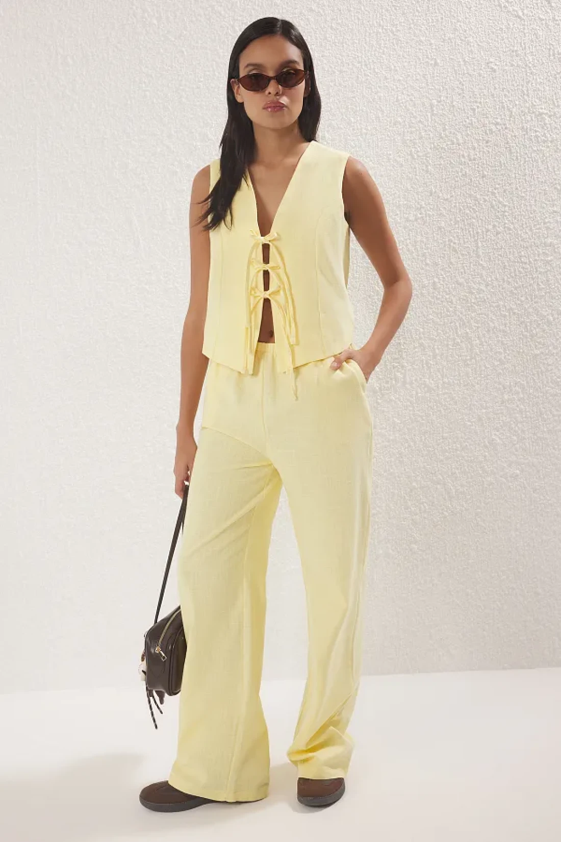 Collection بلوزة من الكتان ذات مظهر فيونكة صفراء وبنطلون واسع الساق منسوج من الأسفل إلى الأعلى TWOSS25AU00034
