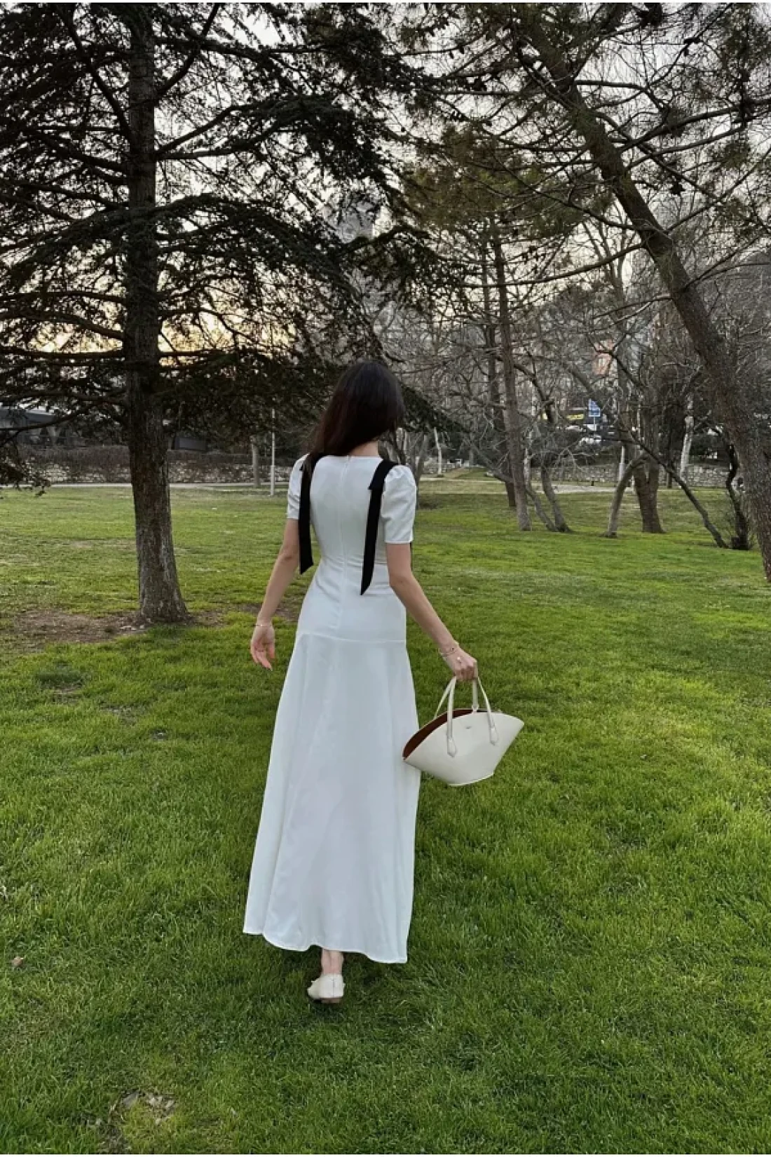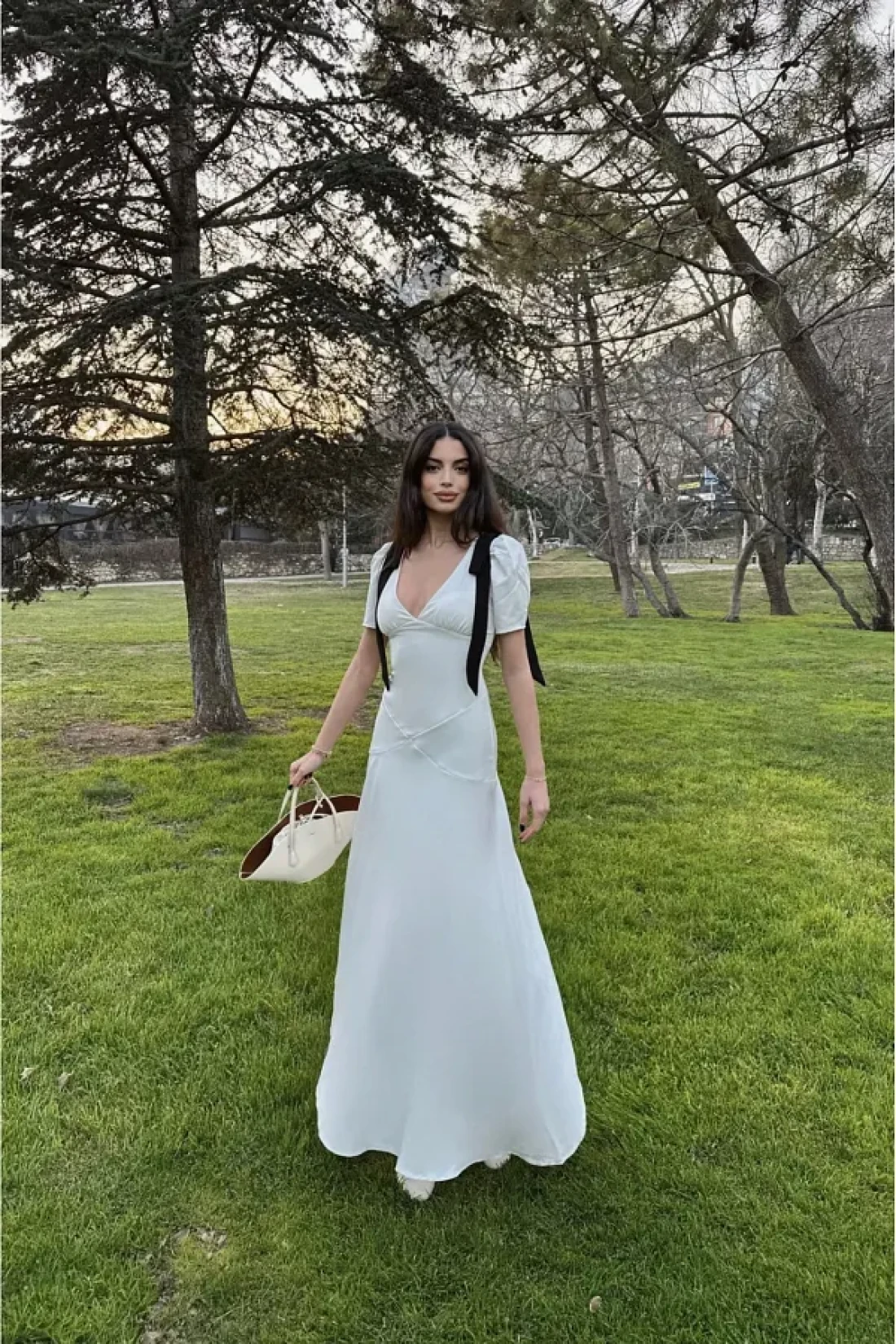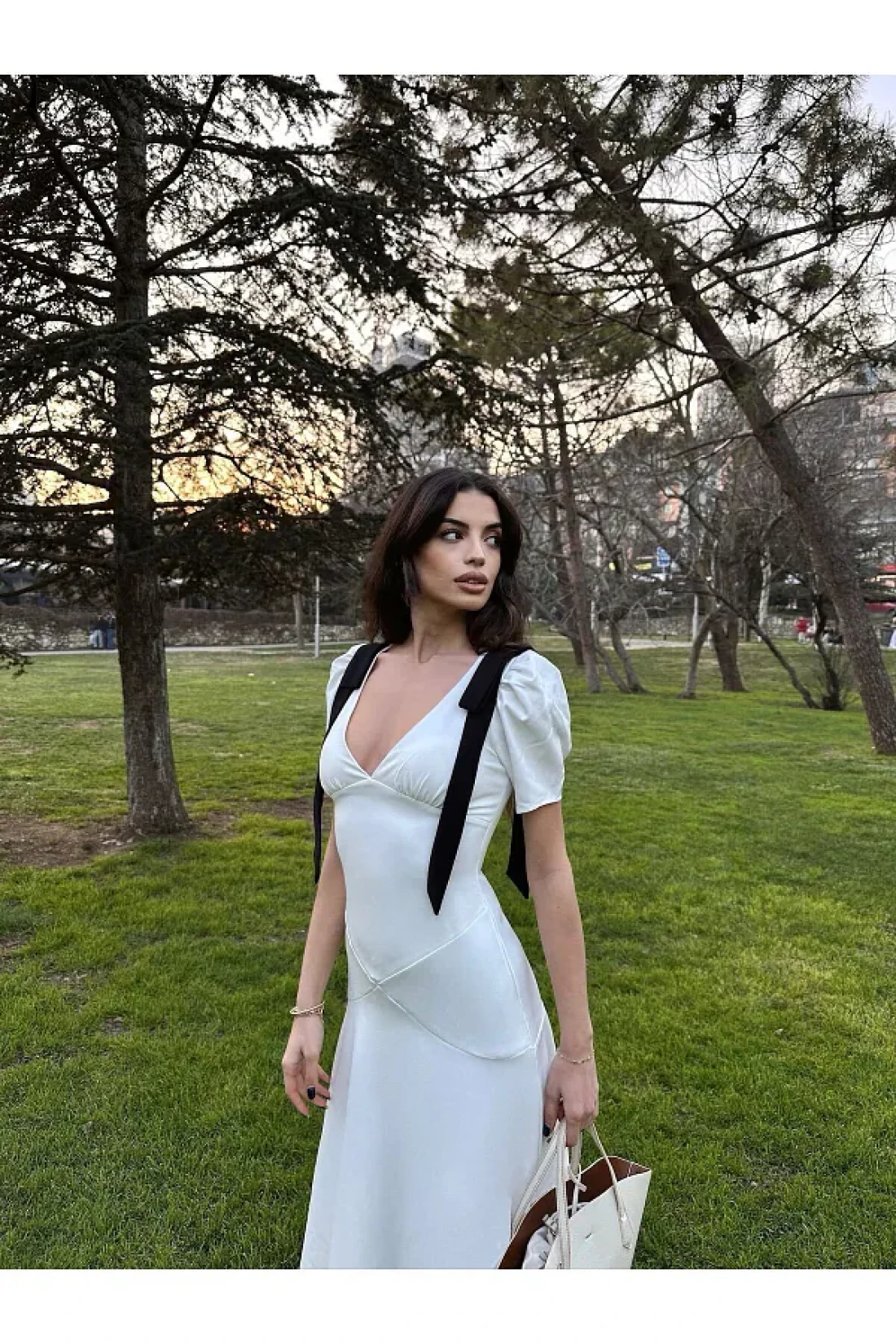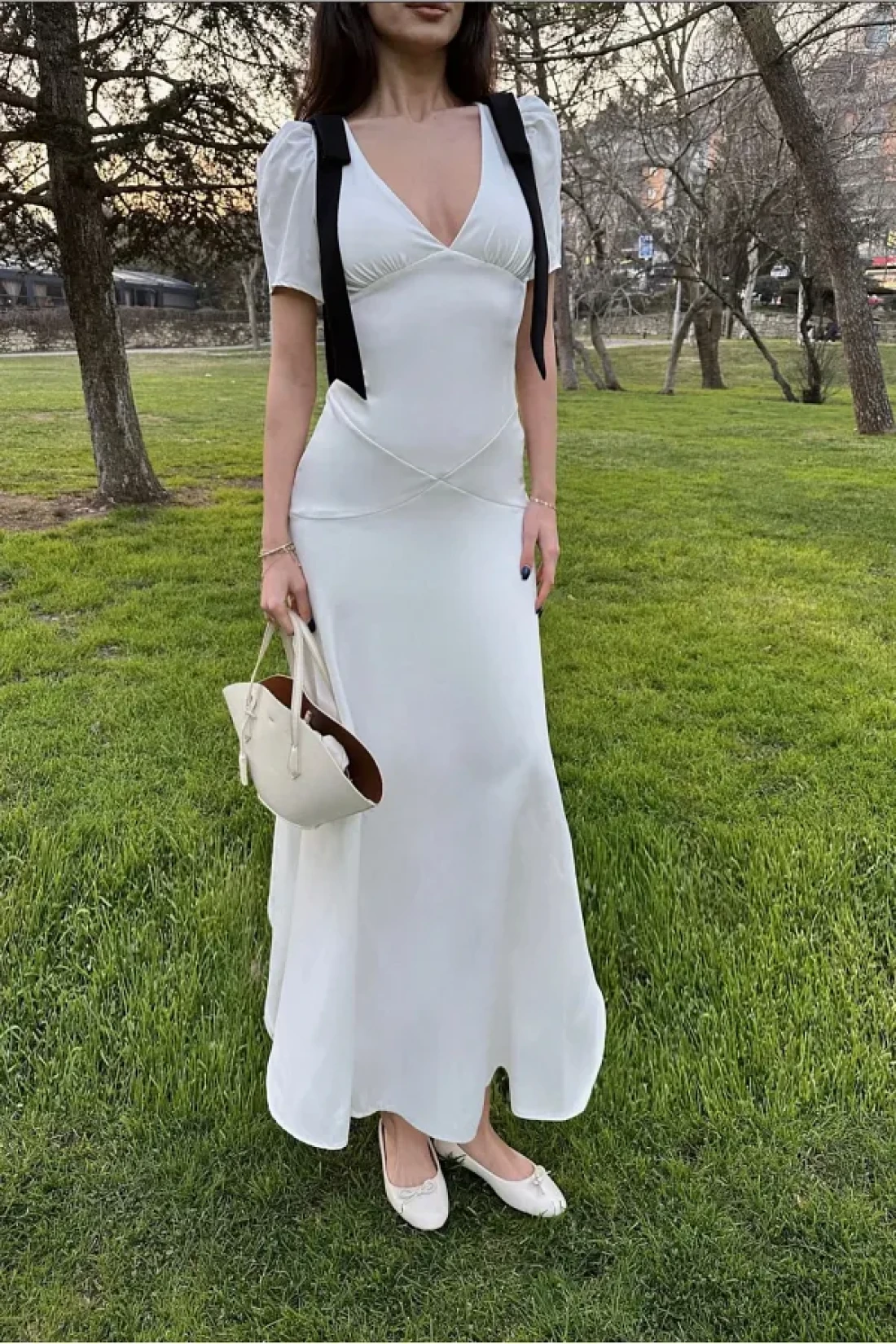 Afiş Butik أبيض عميق الخامس الرقبة قبالة الكتف القوس التفاصيل اصطف فستان طويل