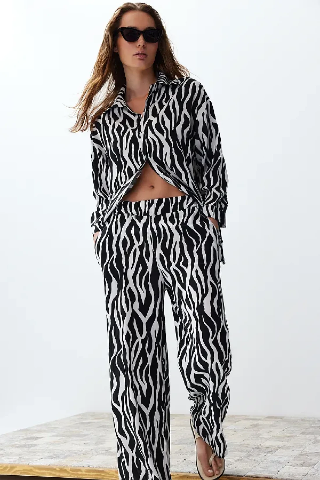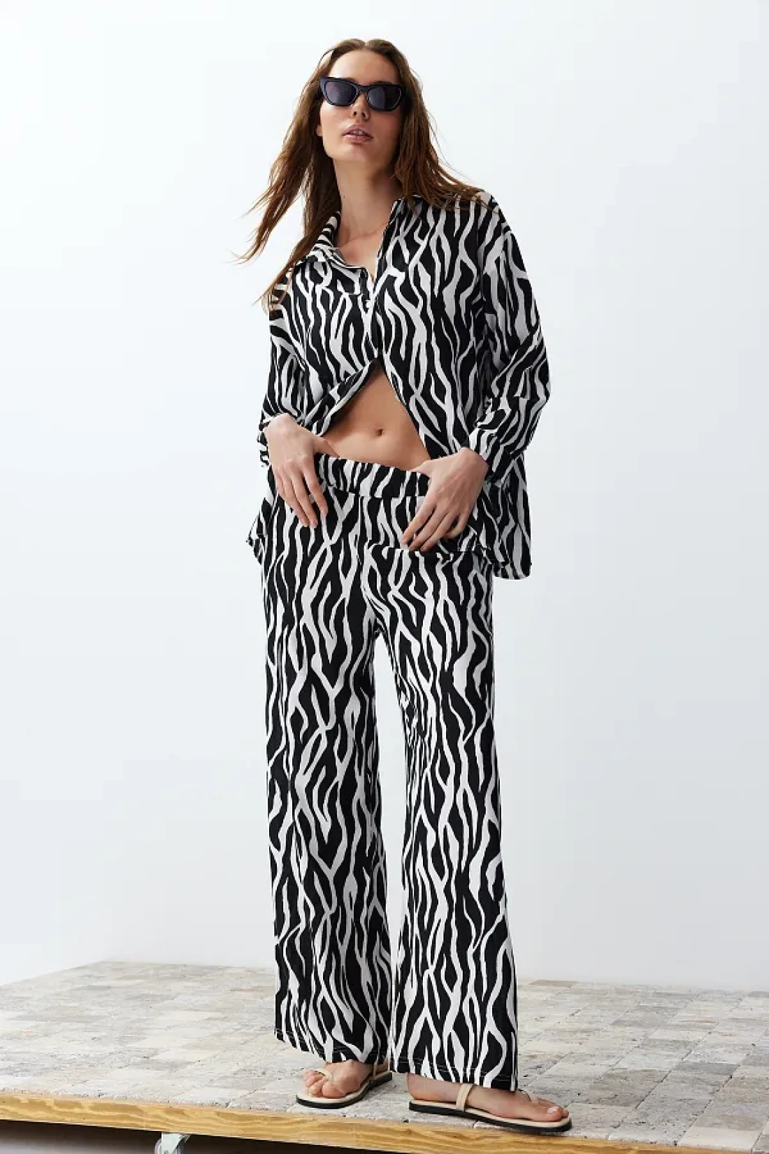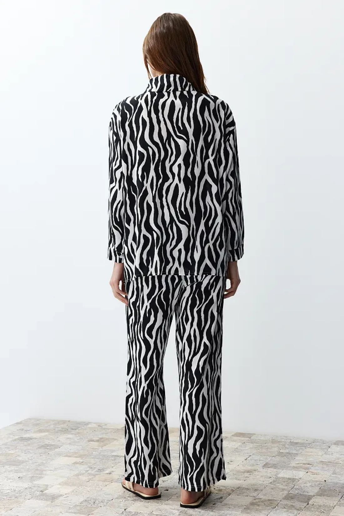 Collection طقم قميص وبنطلون أسود بطبعة حمار وحشي - TWOSS24AU00082