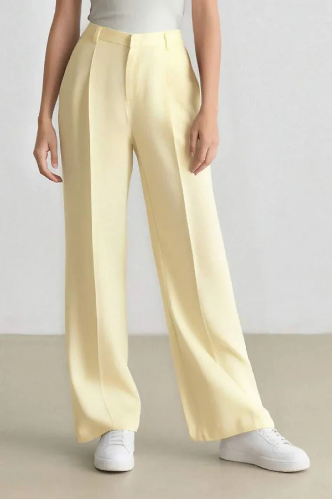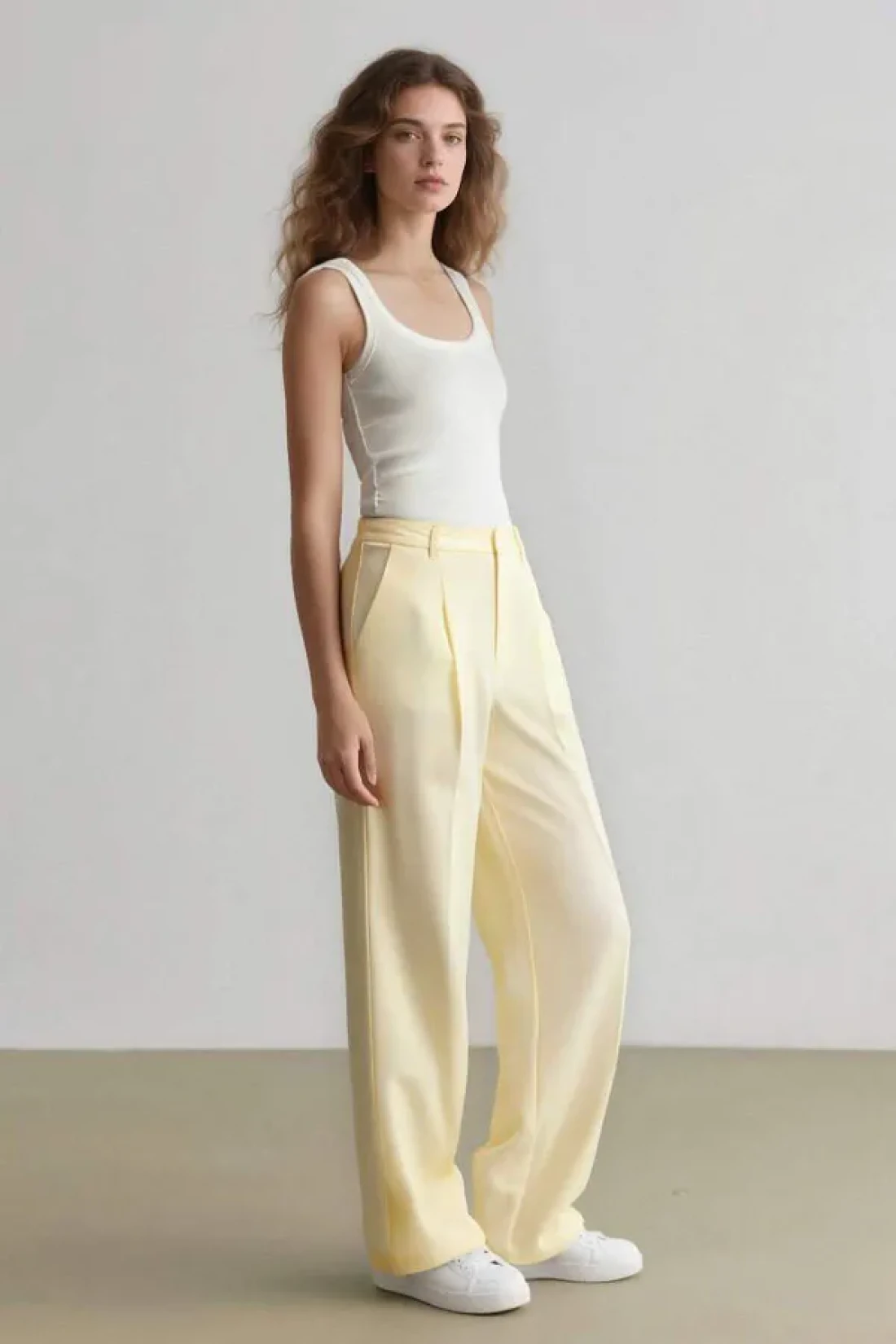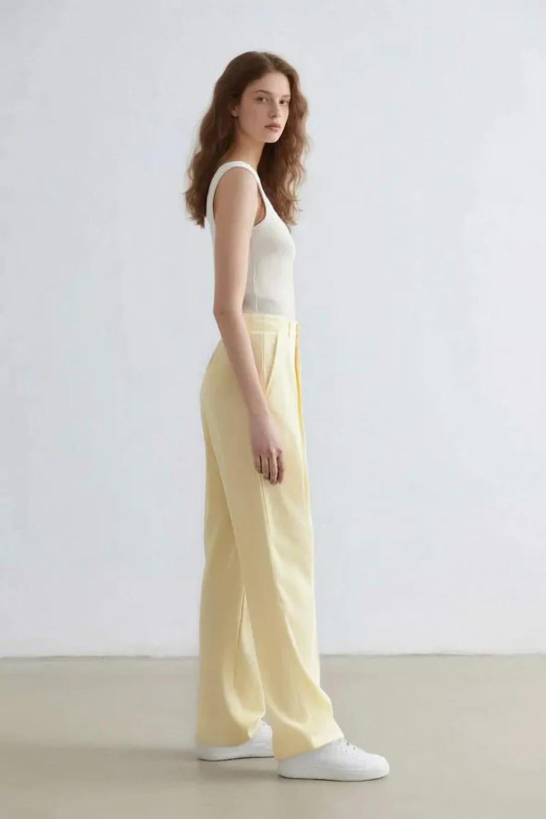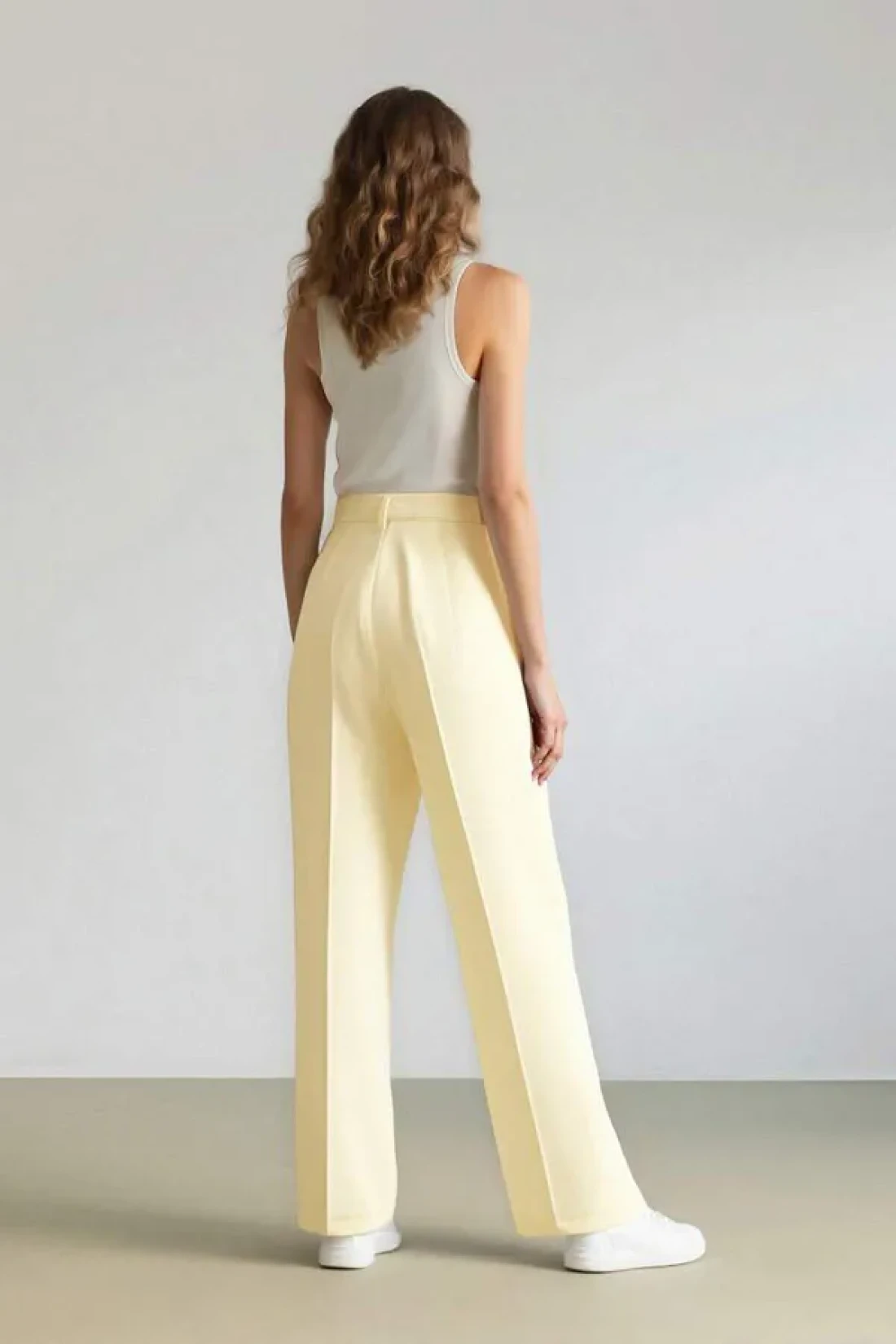 بنطلون من الكتان الأصفر مع حزام خصر عالي للنساء البالغات.