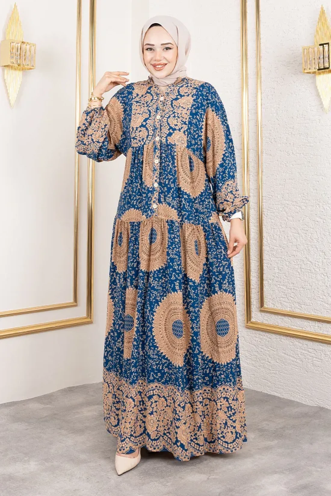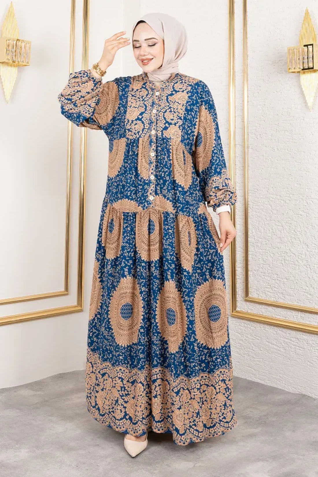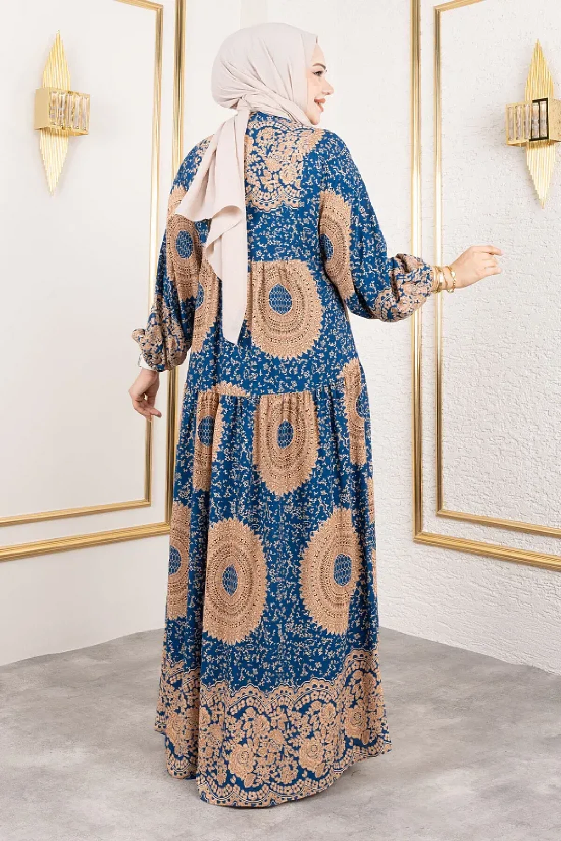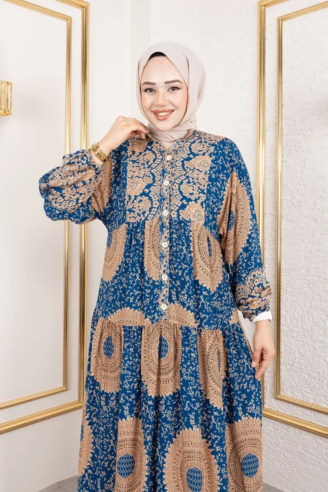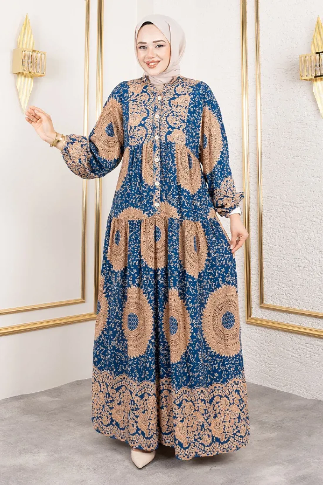 Tesettür Dünyası فستان فيسكوز منقوش بالورق TSD250191 نيلي