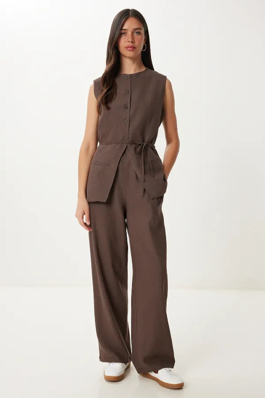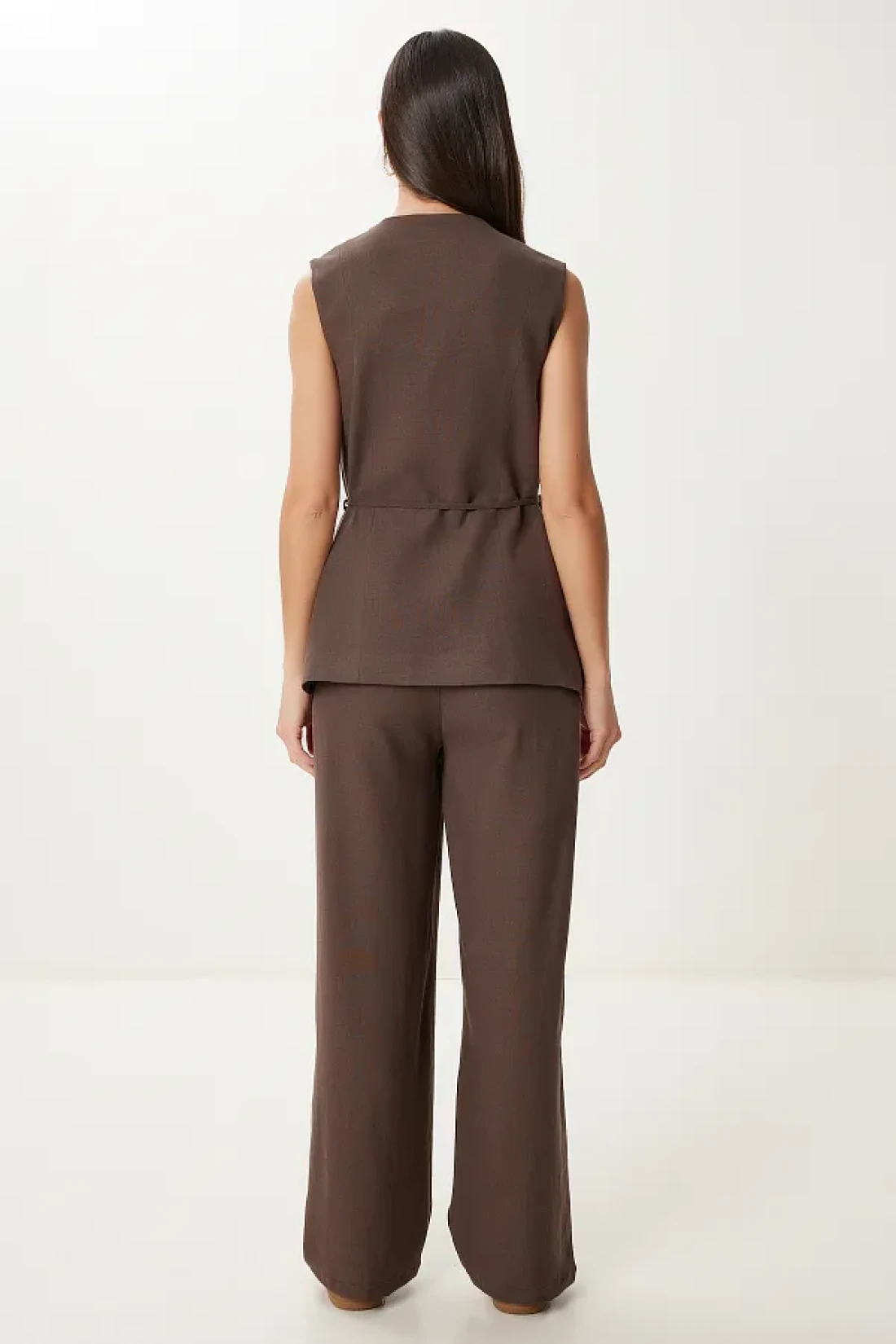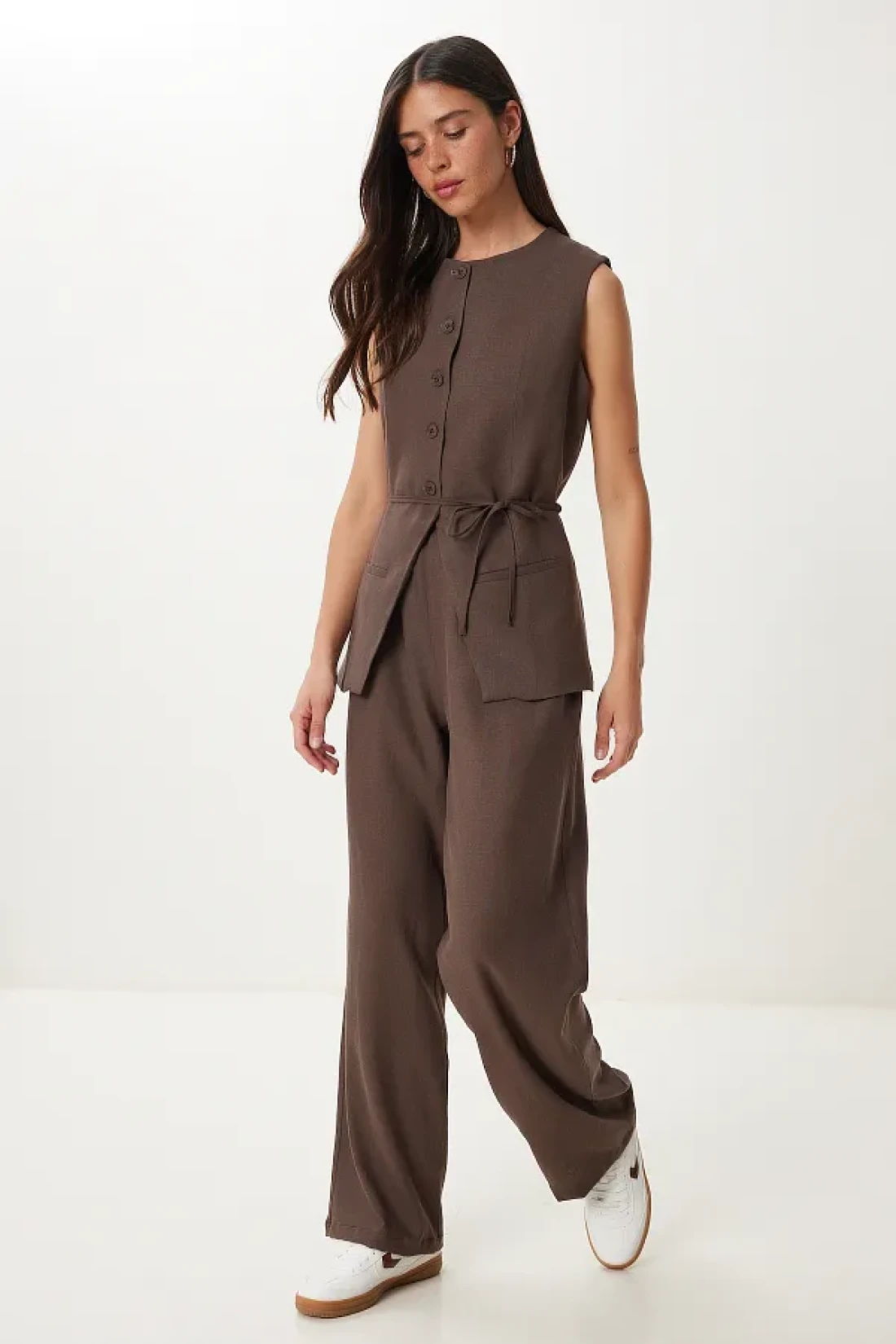 Happiness İstanbul بدلة بنطلون نسائية من الكتان بتفاصيل ربط باللون البني NO00026