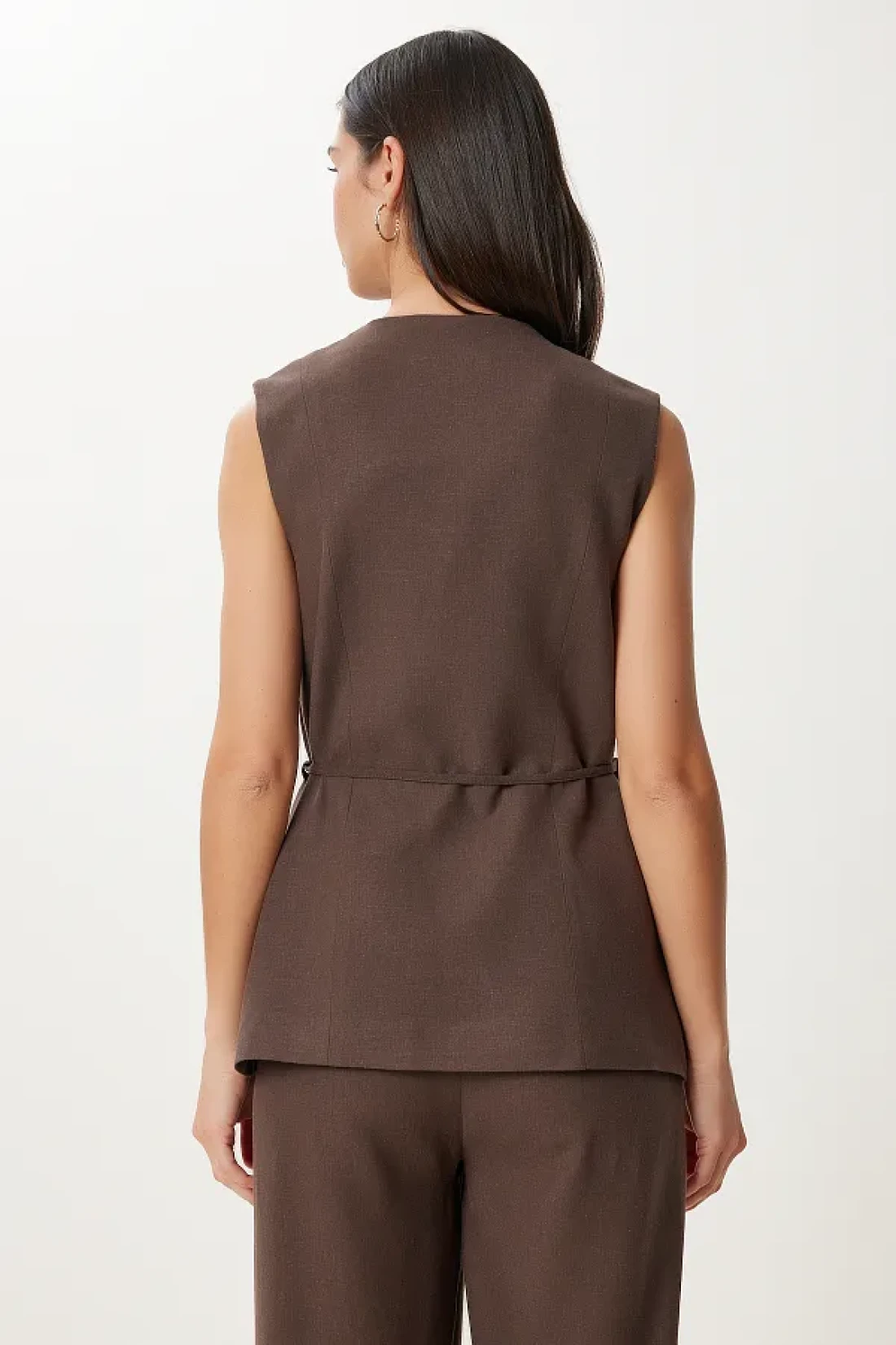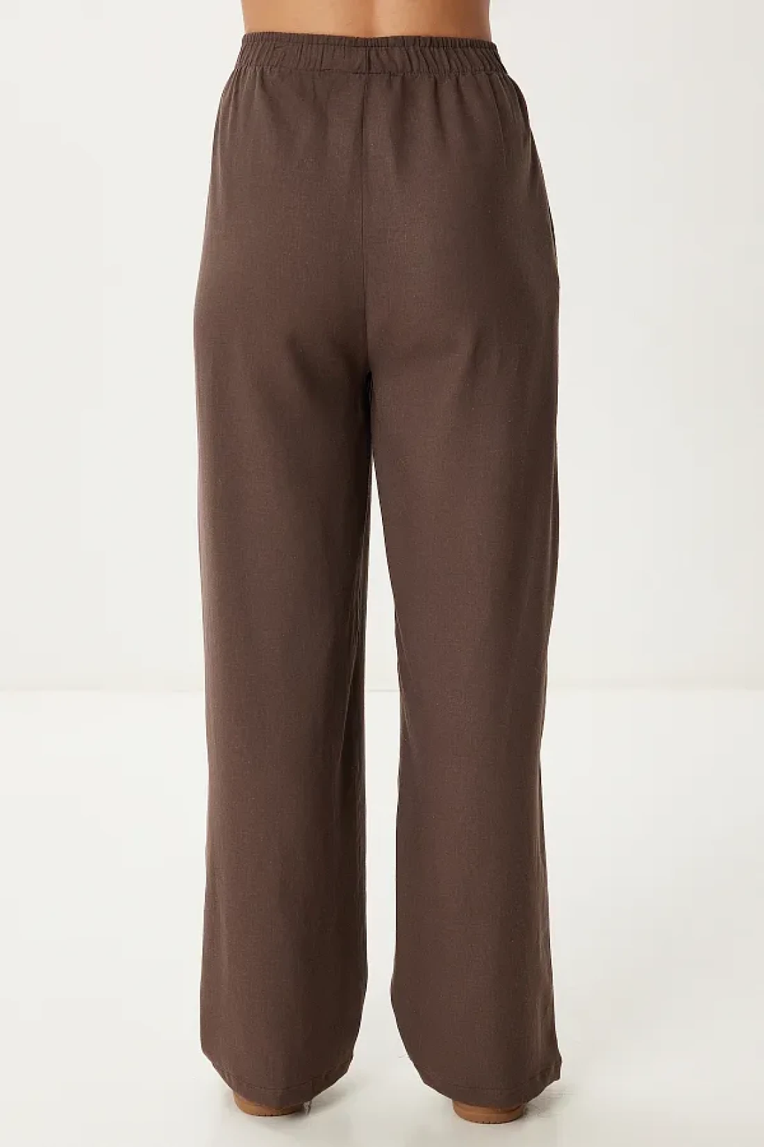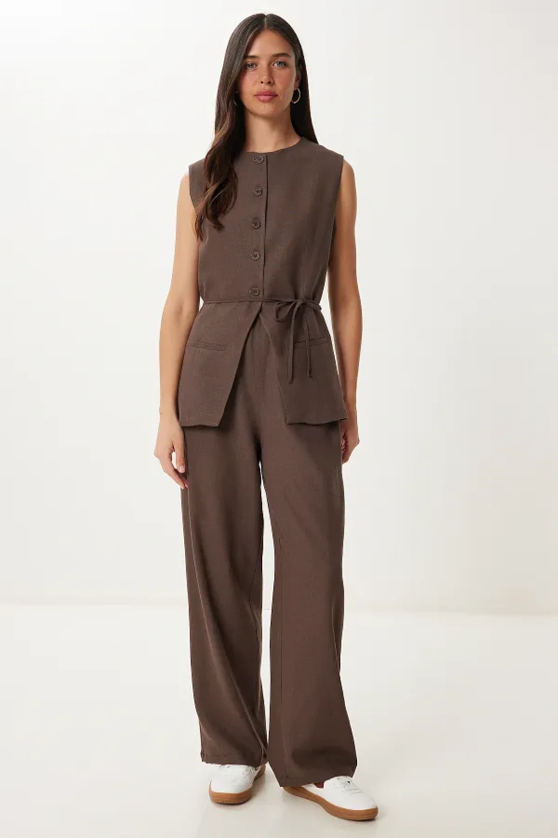 Happiness İstanbul بدلة بنطلون نسائية من الكتان بتفاصيل ربط باللون البني NO00026