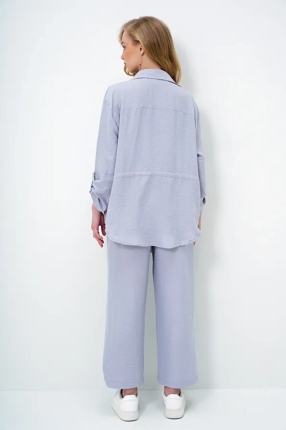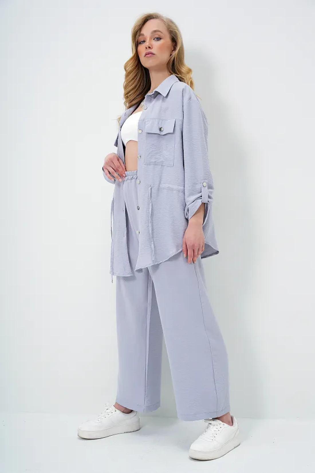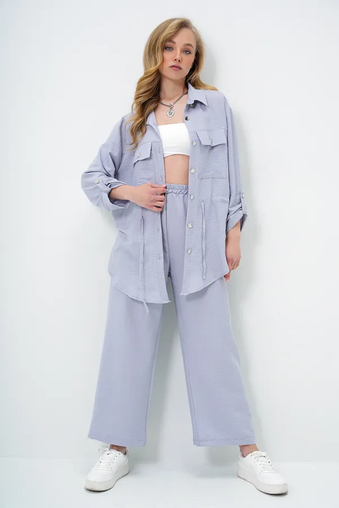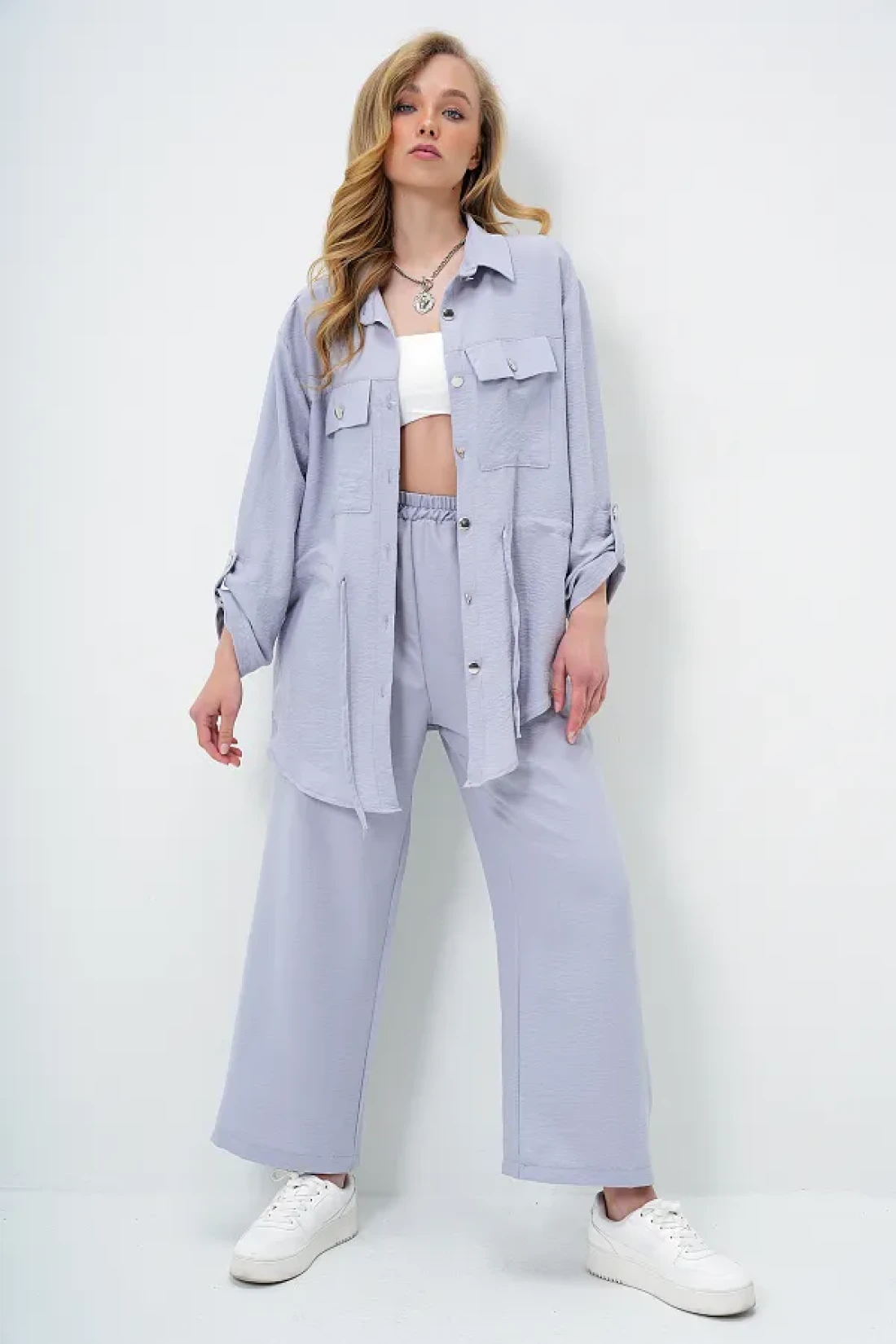Trend Alaçatı Stili بدلة سفاري نسائية رمادية بجيب مزدوج وبنطلون Aerobin واسع الساق بخصر مطاطي Ymx8448