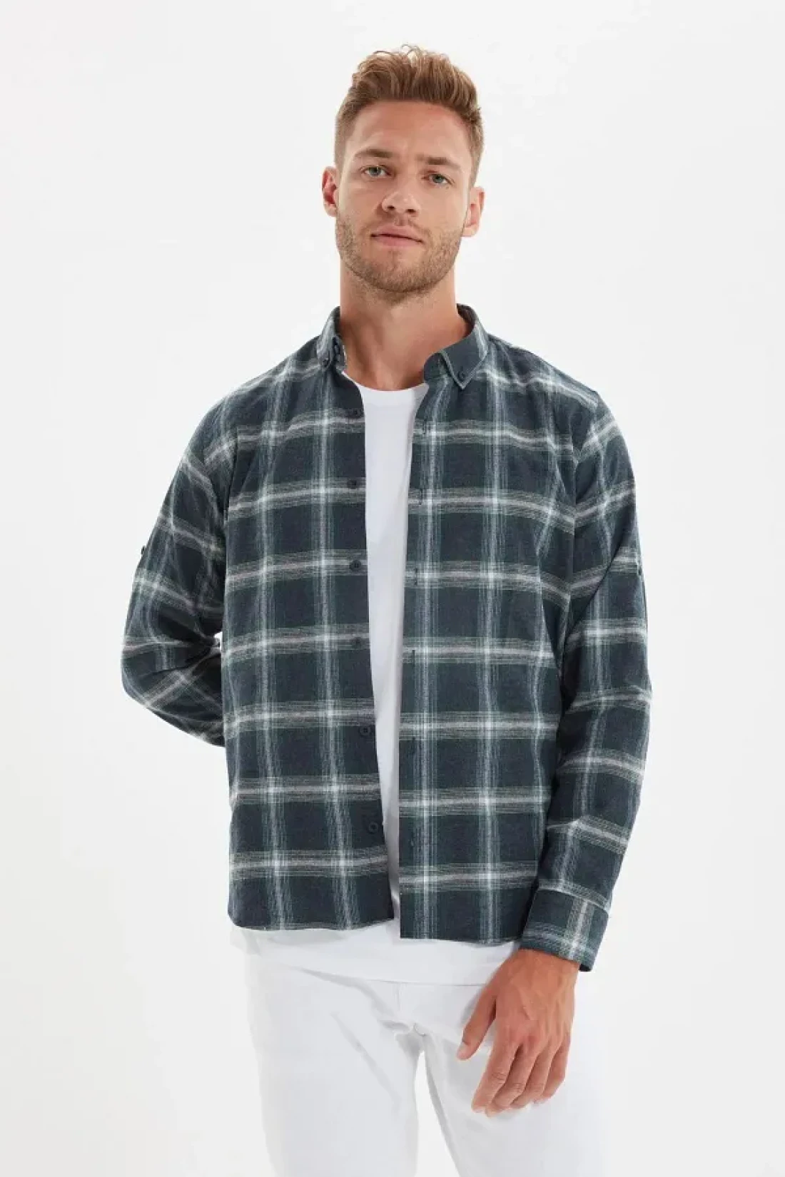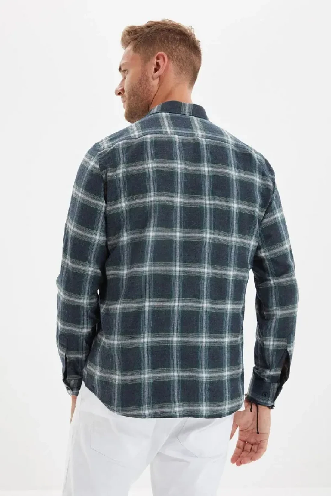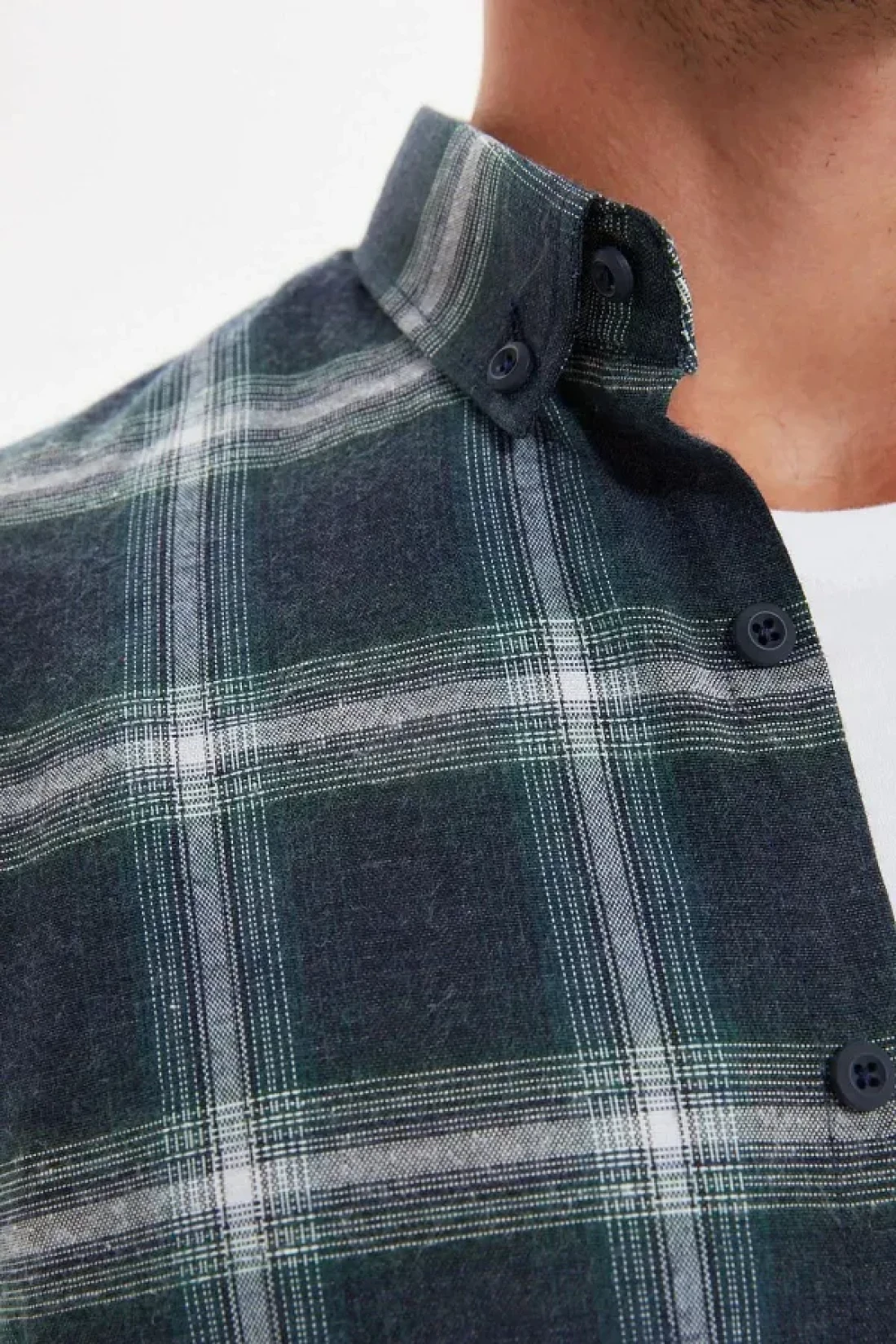 Collection قميص حطاب شتوي بقصة ضيقة باللون الأخضر - ياقة بأزرار، كتاف، مربعات TMNAW22GO0357