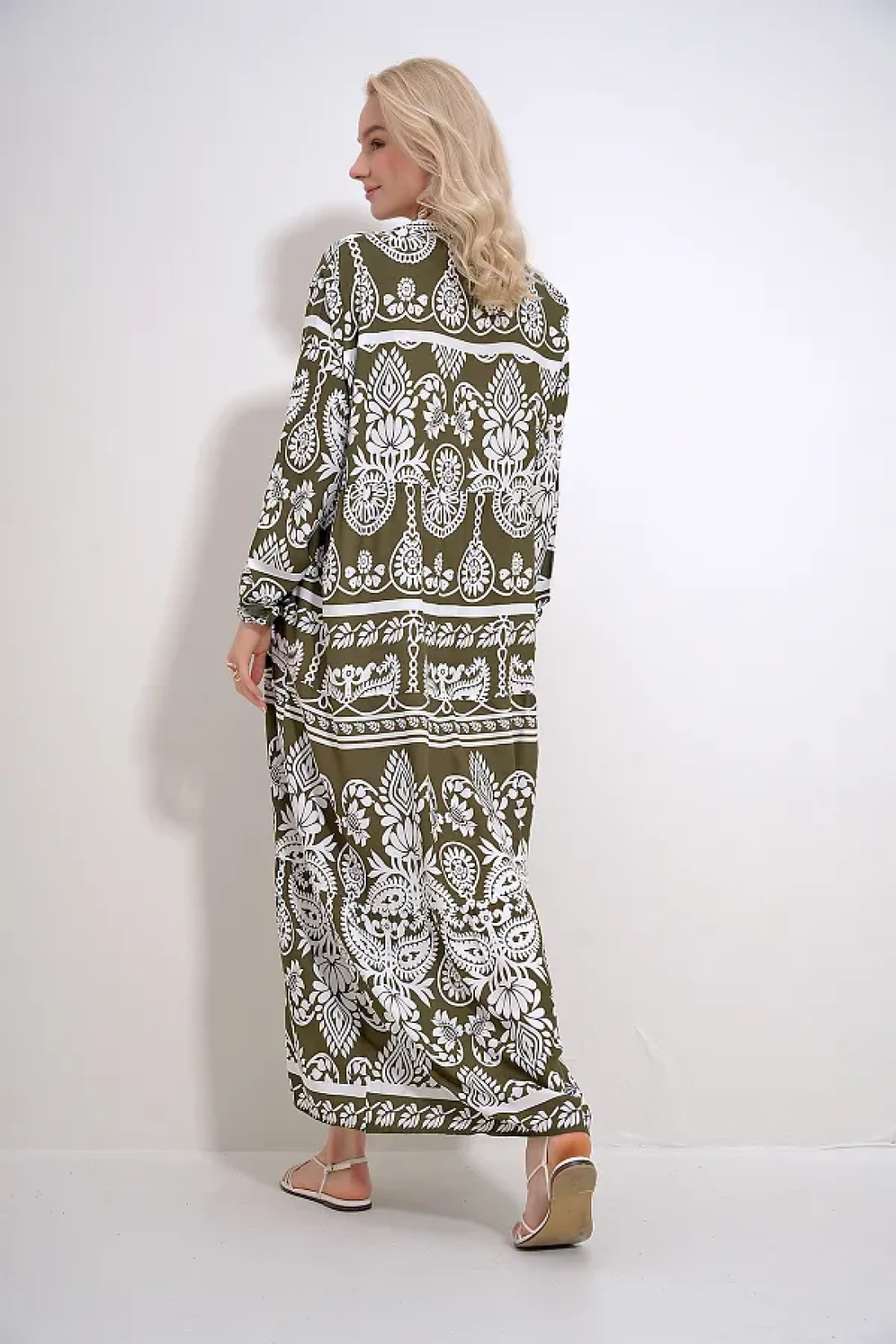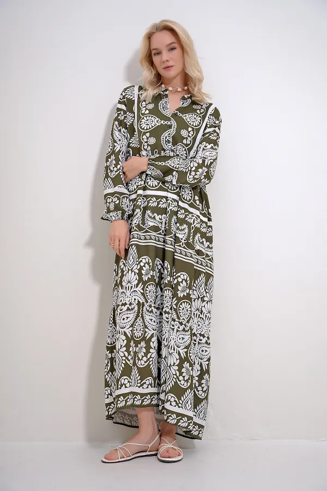Trend Alaçatı Stili فستان نسائي من الفسكوز المنسوج بأزرار من الكاكي روبا ALC-X12036