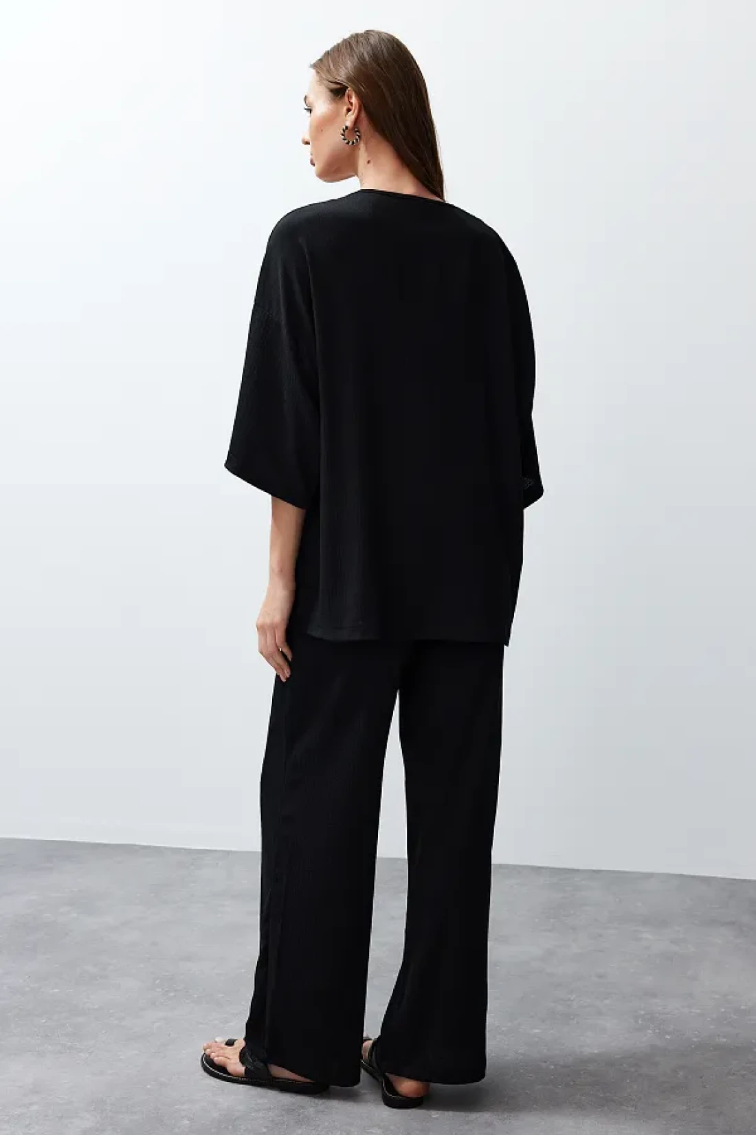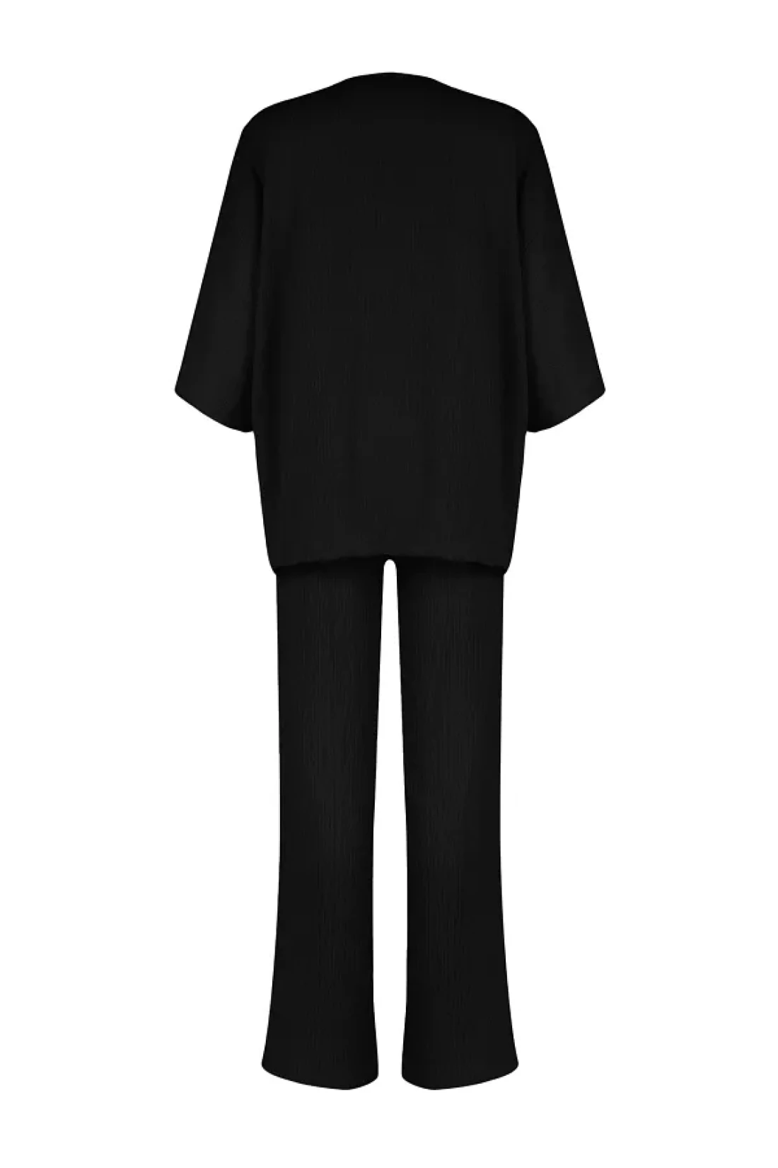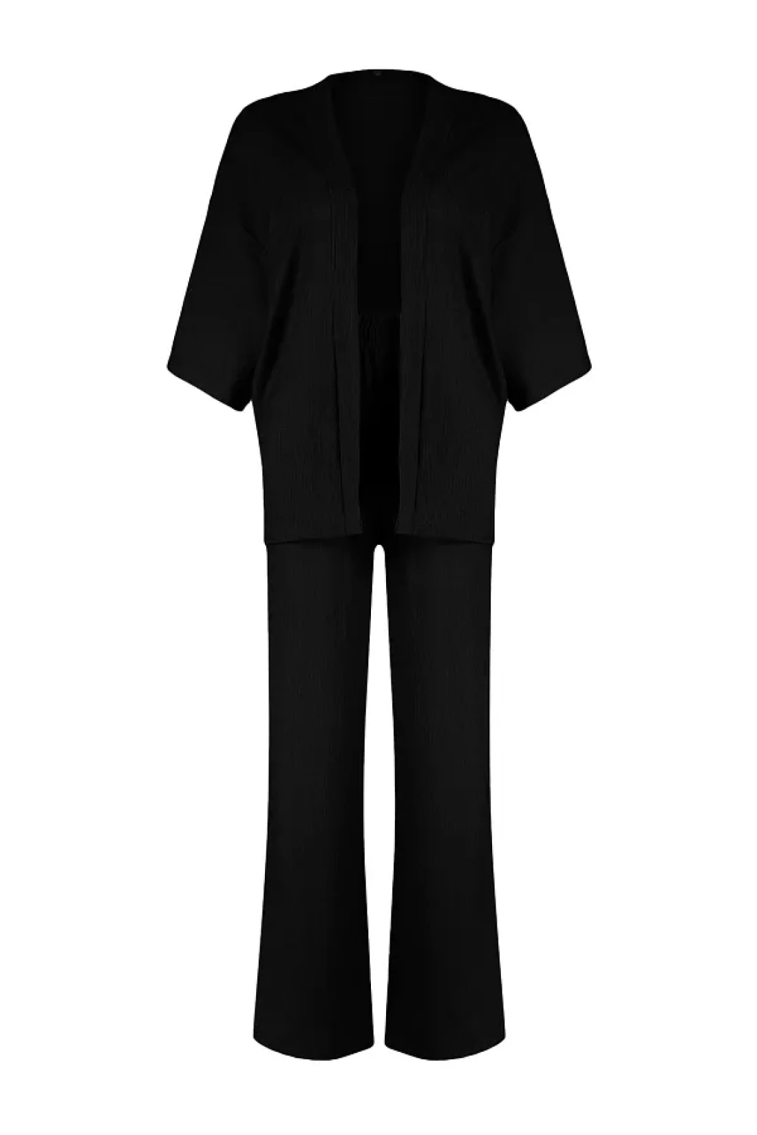 Collection طقم كيمونا وبنطلون أسود محبوك مريح - TWOSS24AU00091